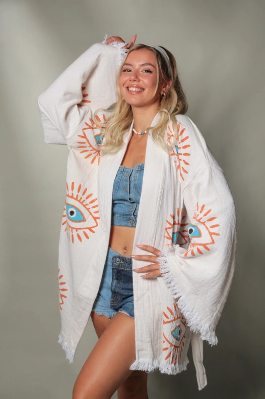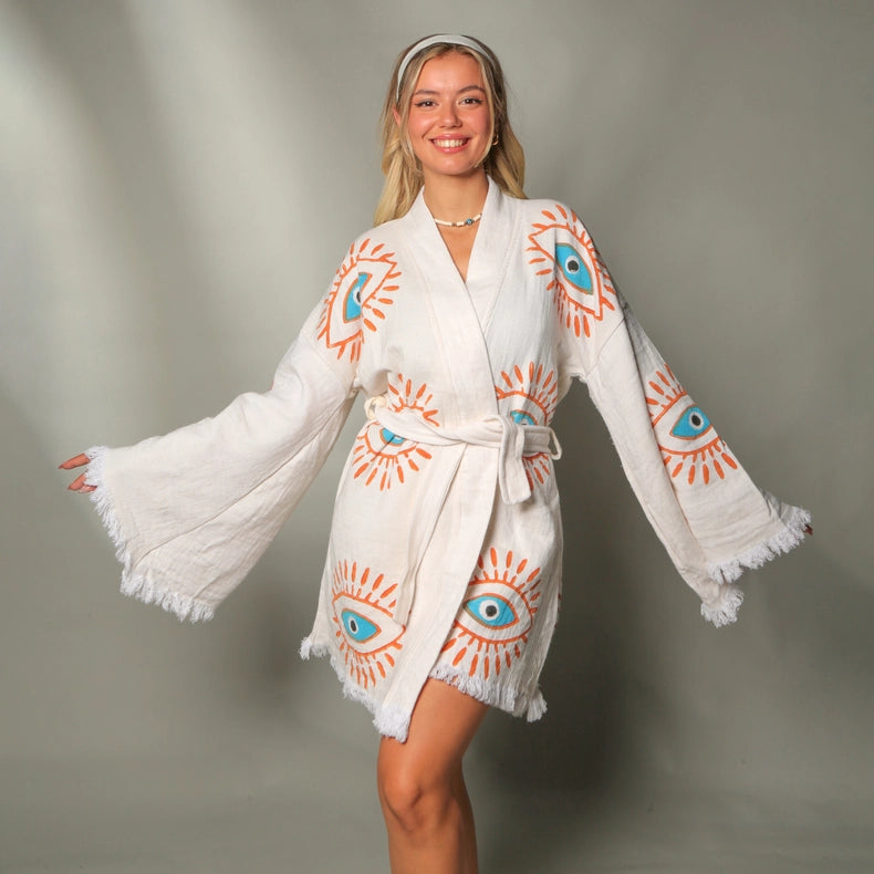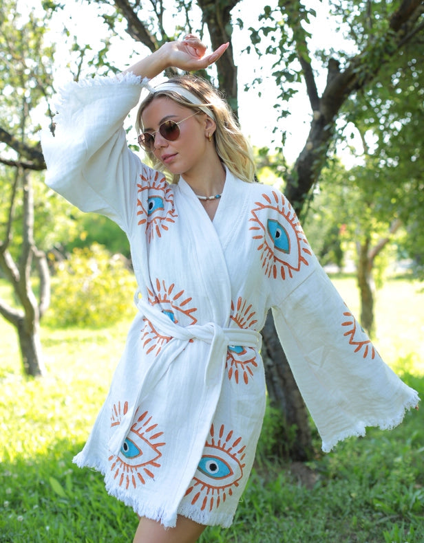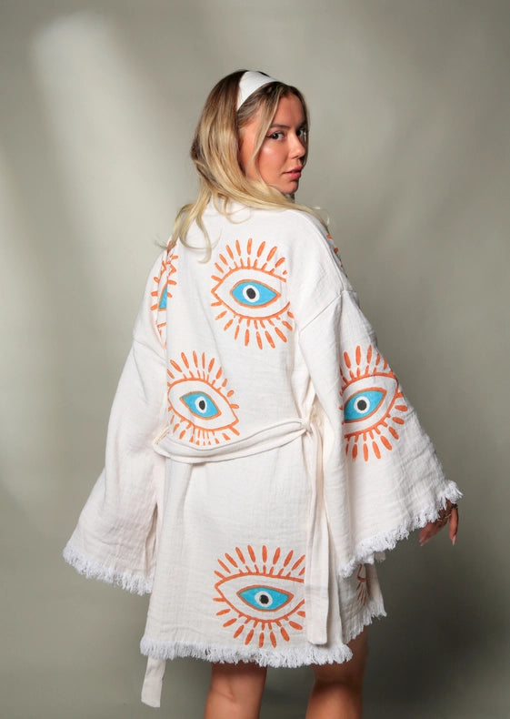Stay stylish and comfortable this summer with our Retro Evil Eye Short Kaftan Kimono. Made from 100% organic cotton, this Greek goddess-style cover-up features a timeless hand-printed evil eye design. Lightweight and breathable, it's perfect for the beach, park, or home. Protect yourself from evil spirits and eyes while being eco-friendly and quick-drying. Available in short or long models.