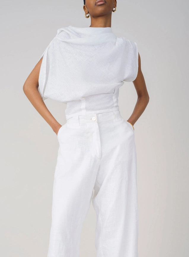 Expertly crafted in India, the Rhea Linen Top exudes effortless elegance. Made from 100% pure linen, its cowl-neck and corset-effect knife pleats at the torso offer a flattering silhouette. With short sleeves and a convenient side zip, this top is ideal for any occasion. Complete the look with the keyhole button and loop closure at the back neckline.