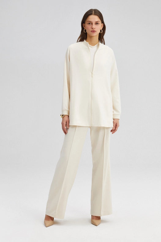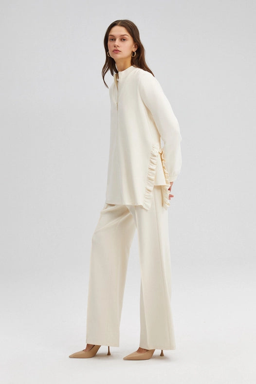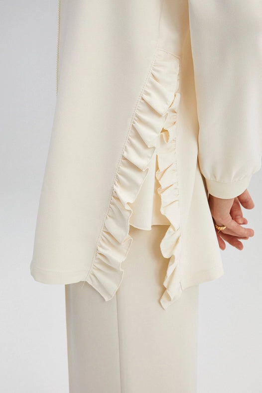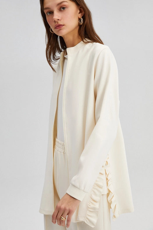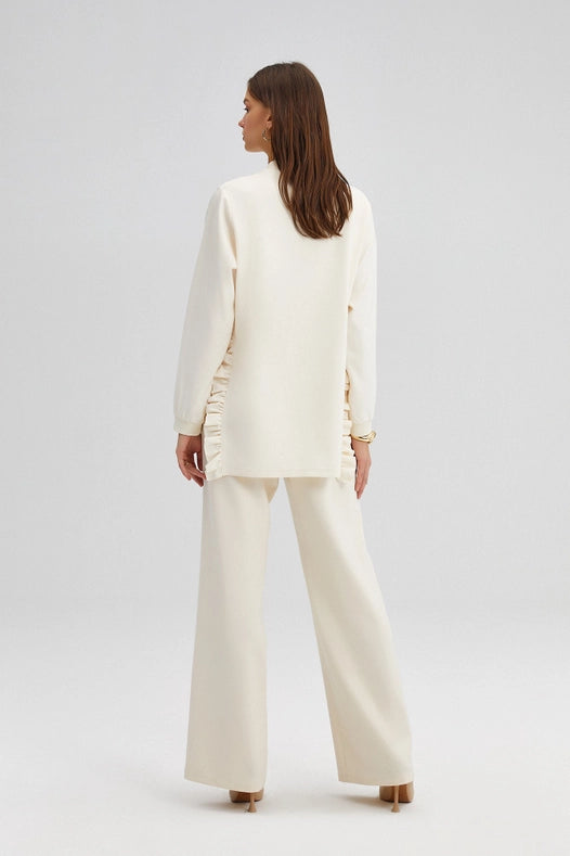 Experience chic comfort and style with our Ruffled Thin Crepe Jacket. Featuring a height of 82 cm and a chest of 108 cm, this jacket is designed to flatter your figure. The 63 cm sleeve length adds a touch of sophistication, and the fabric, made with 95% polyester and 5% Lycra, provides a comfortable and flexible fit. Trust our expert craftsmanship to elevate your wardrobe.