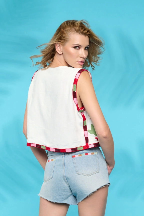 Stay stylish and comfortable with our San Diego Vest. This vest features beautiful embroidered flowers, with a 100% cotton inner lining for a soft and cozy feel. Perfect for spring and summer, this vest is machine washable for easy care. Available in size S, modeled by 1.80 m tall.