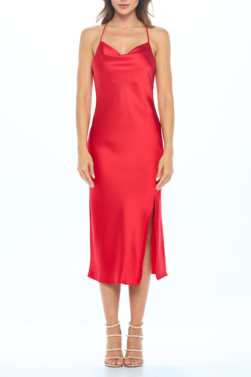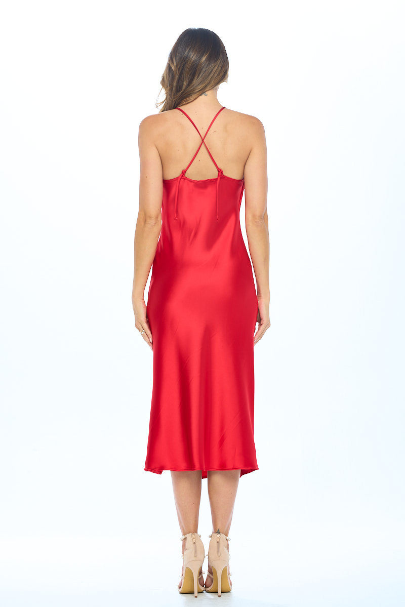 Made in USA Satin Bias Slip Dress with Slit. Fabric content: 97% Polyester, 3% Spandex. Available in other Colors.