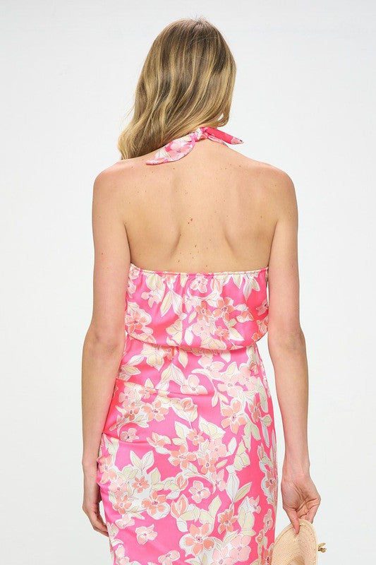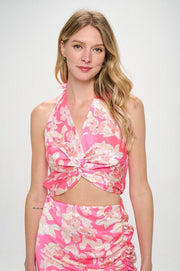Satin No Sleeve Flower Print Top with Front Twist-New Arrival-Reneecollection-Small-PINK-Urbanheer