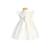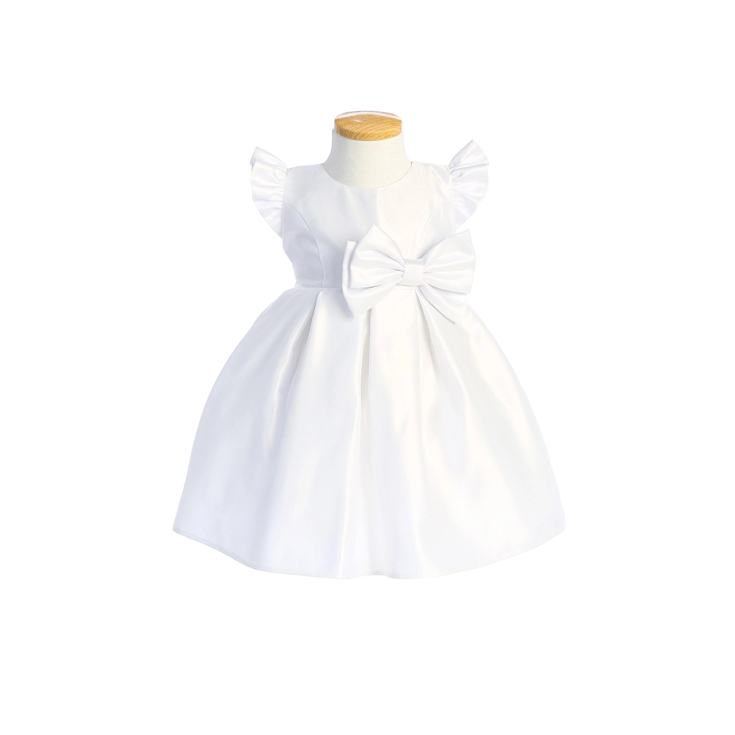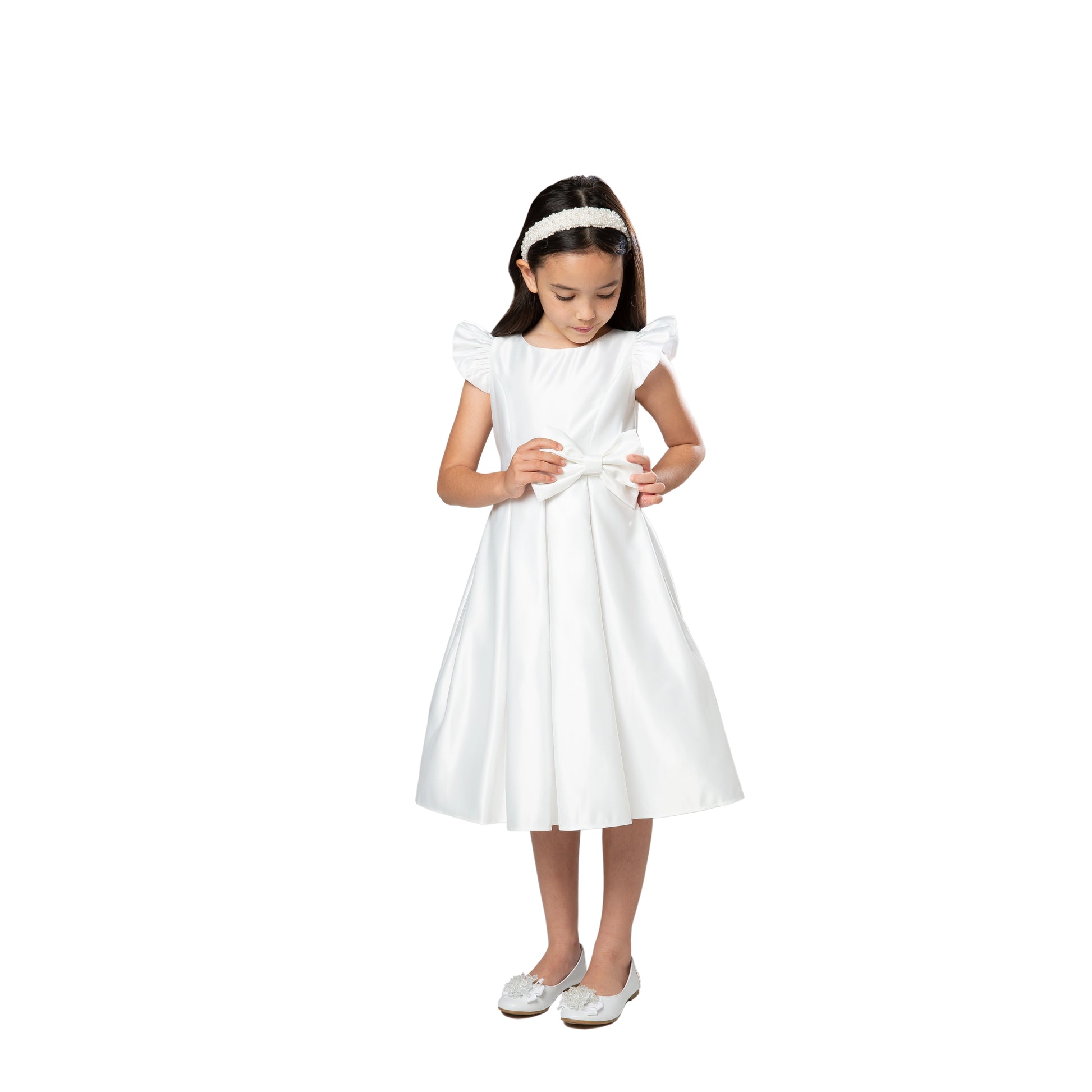 Satin pleated skirt with flutter sleeve top and oversized bow detail at waist. Tea length.