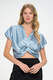 Made in USA Satin Short Sleeve Top with Front Twist. Available in other Colors. Fabric content: 97% Polyester, 3% Spandex.