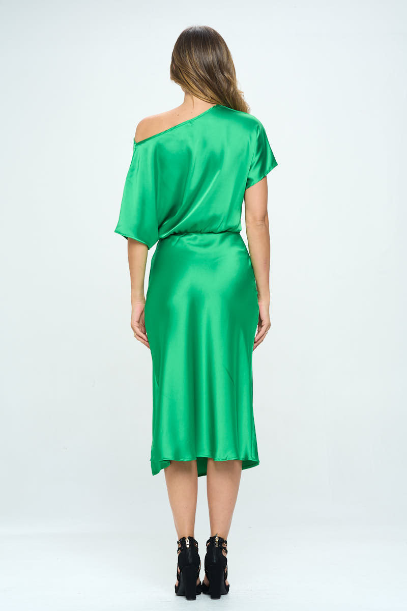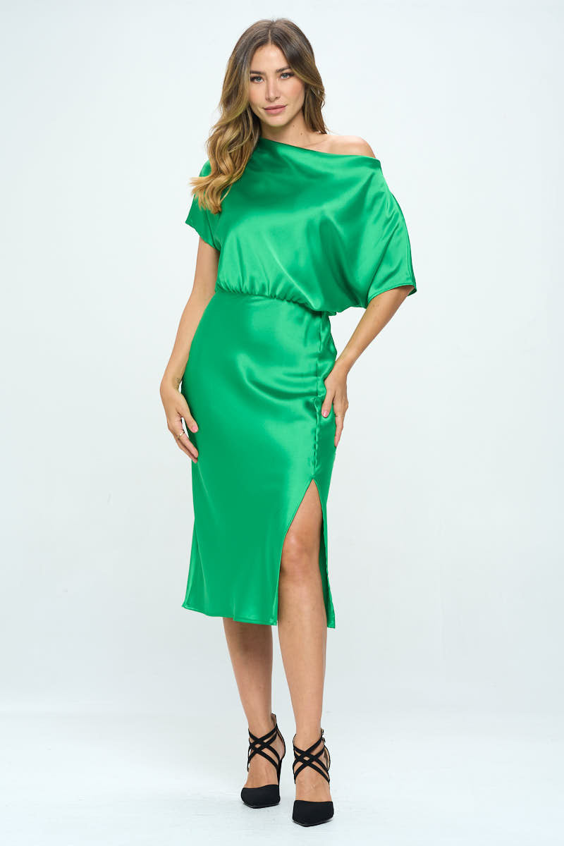 Made in USA Satin Stretch Print Dress with Slit. Available in other Colors. Fabric content: 97% Polyester, 3% Spandex.