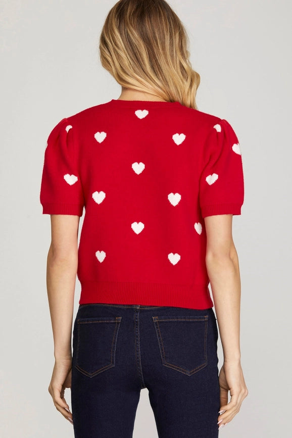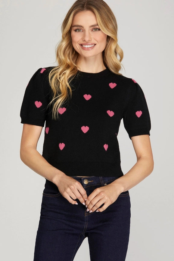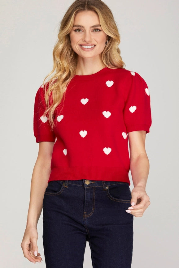 Short Puff Sleeve Heart Pattern Sweater Top