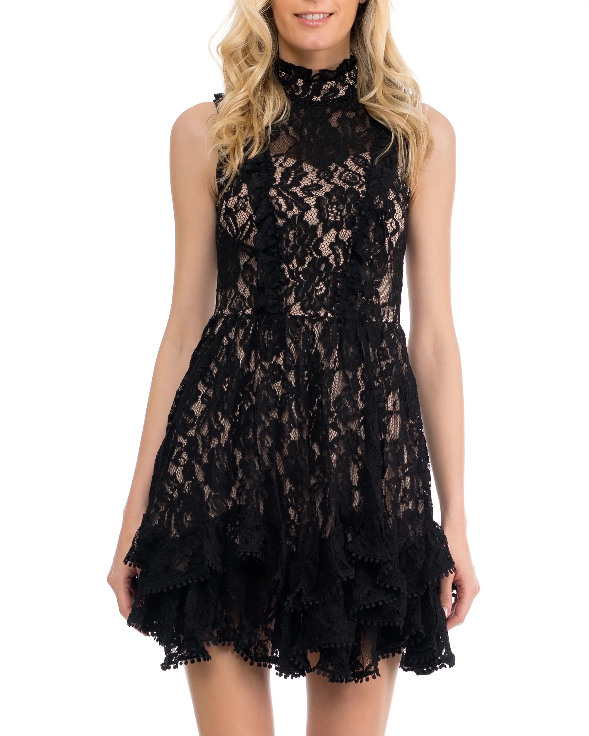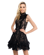 Sleeveless mini lace dress with high neck and ruffles at the bottom, and zipper at the back.
