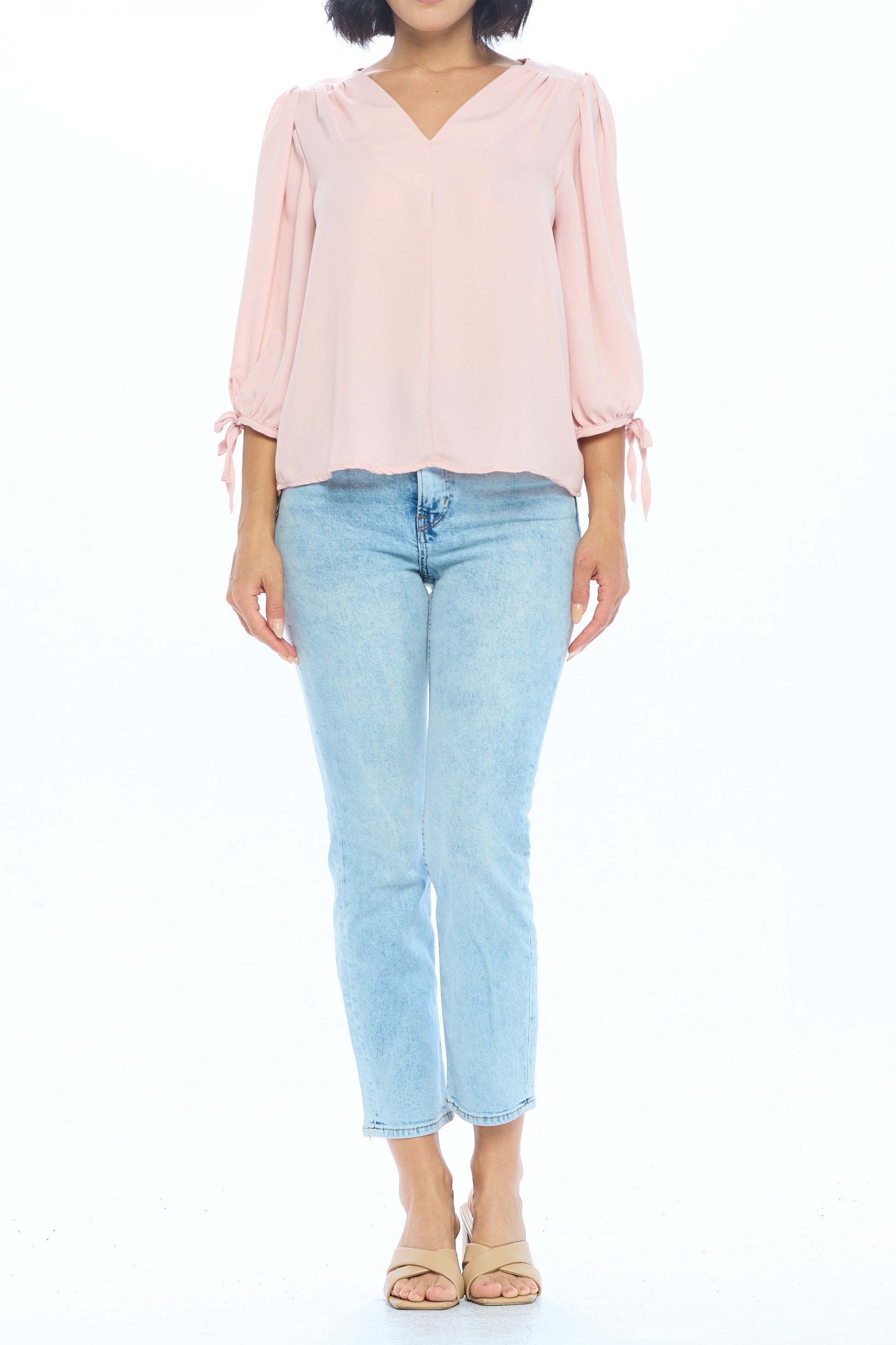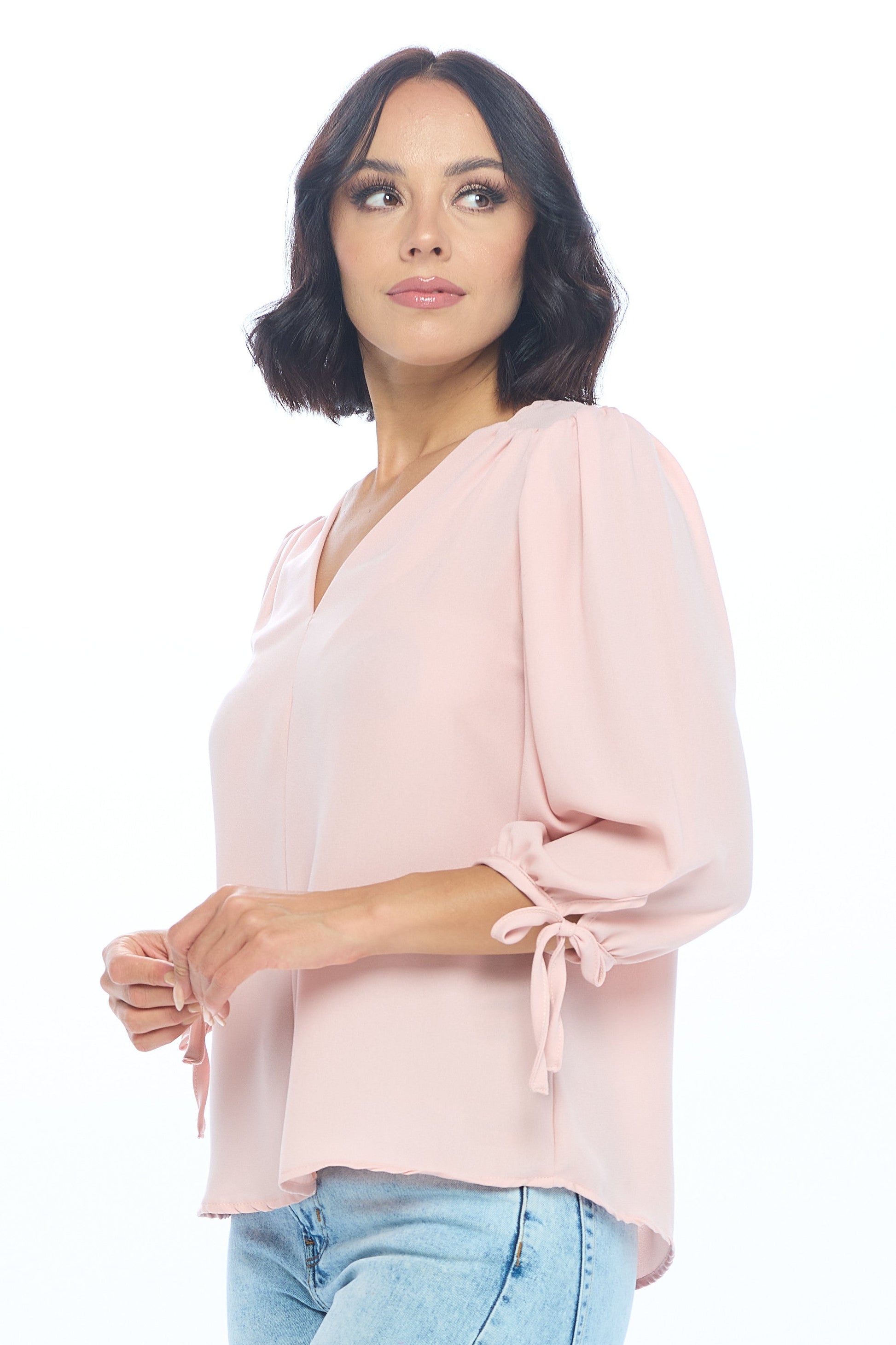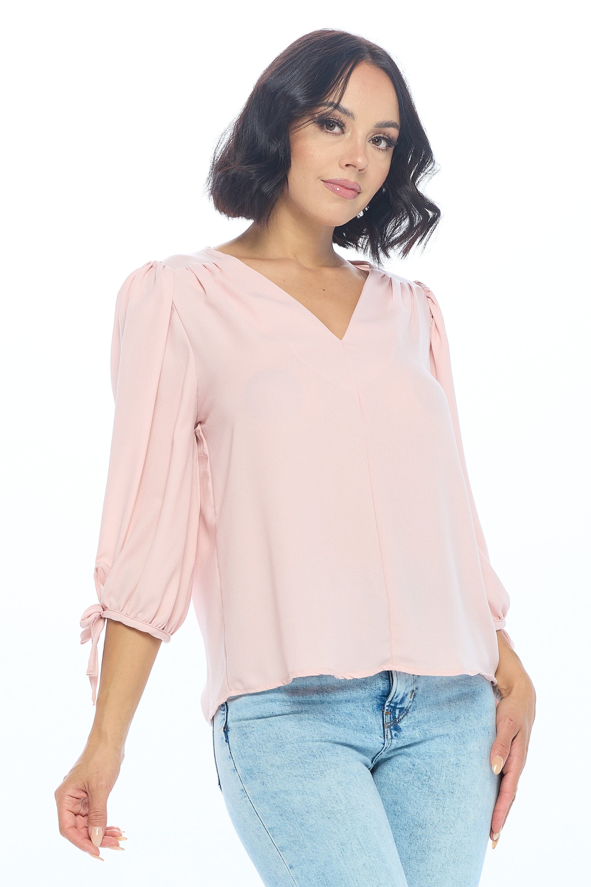 Made in USA Solid V neck Top with Self Tie Sleeves. Fabric content: 100% Polyester.