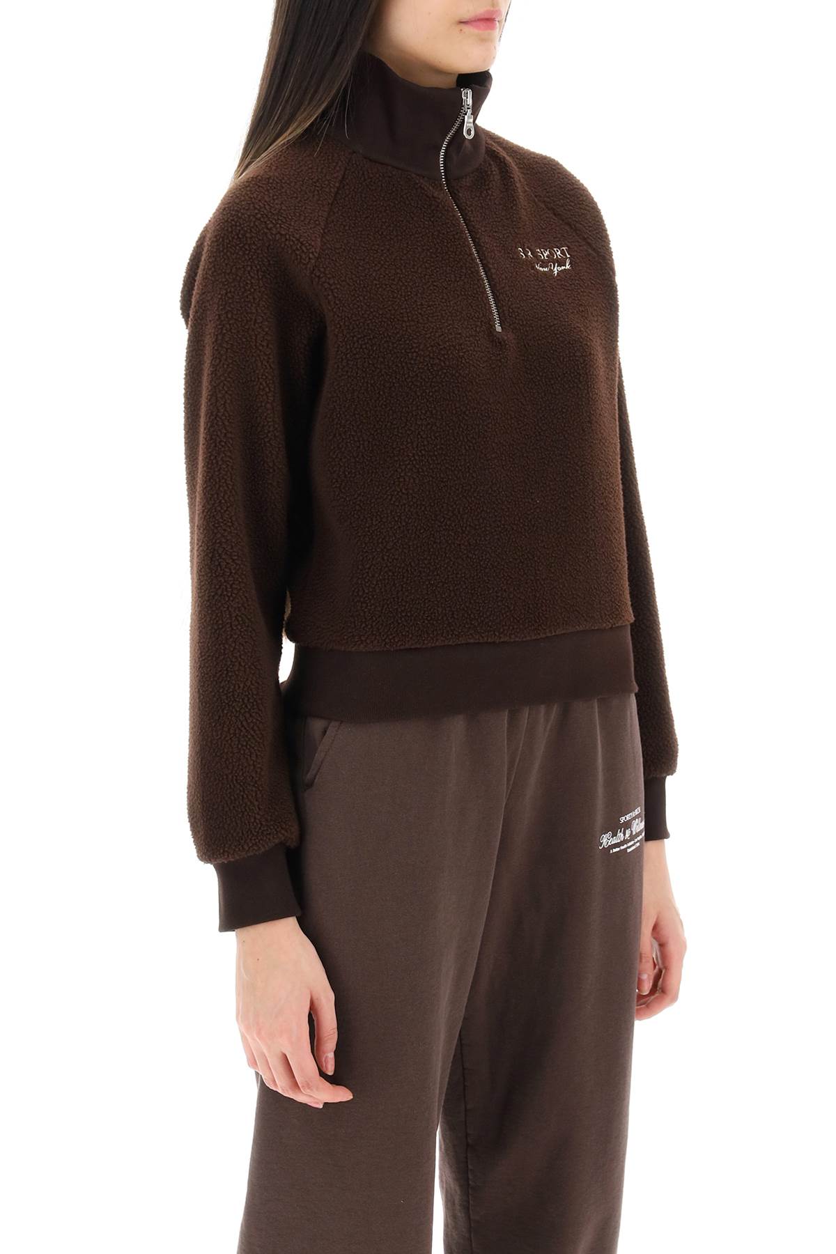 High-necked sherpa fleece sweatshirt by Sporty & Rich with jersey lining and a light padding. It features raglan sleeves, ribbed hems, quarter zip and is finished with contrasting lettering embroidery at chest. Short and relaxed fit. The model is 177 cm tall and wears a size XS.