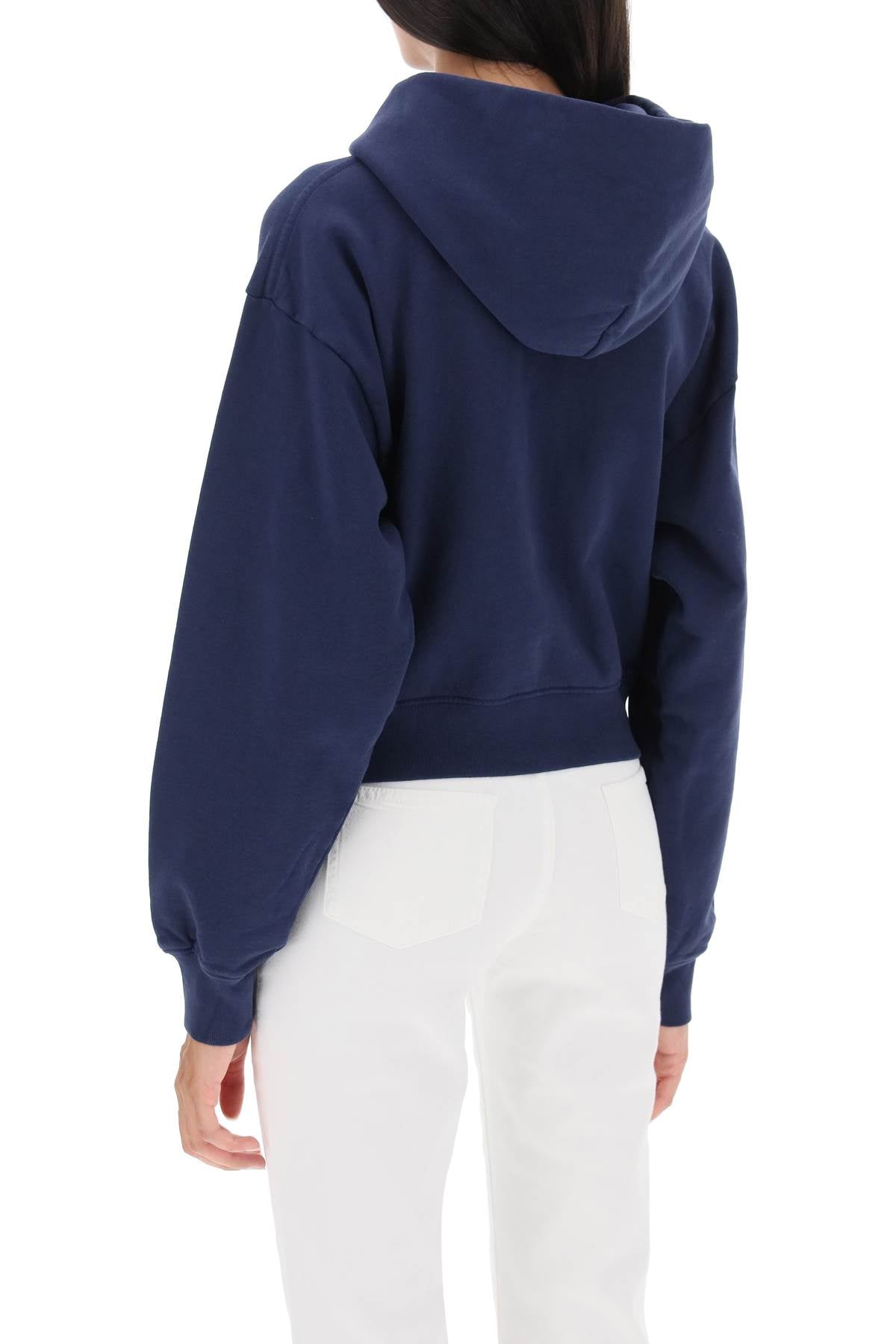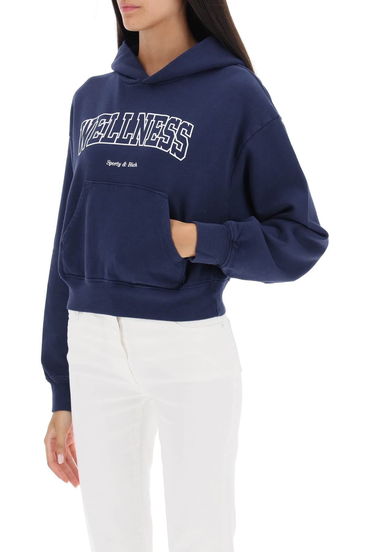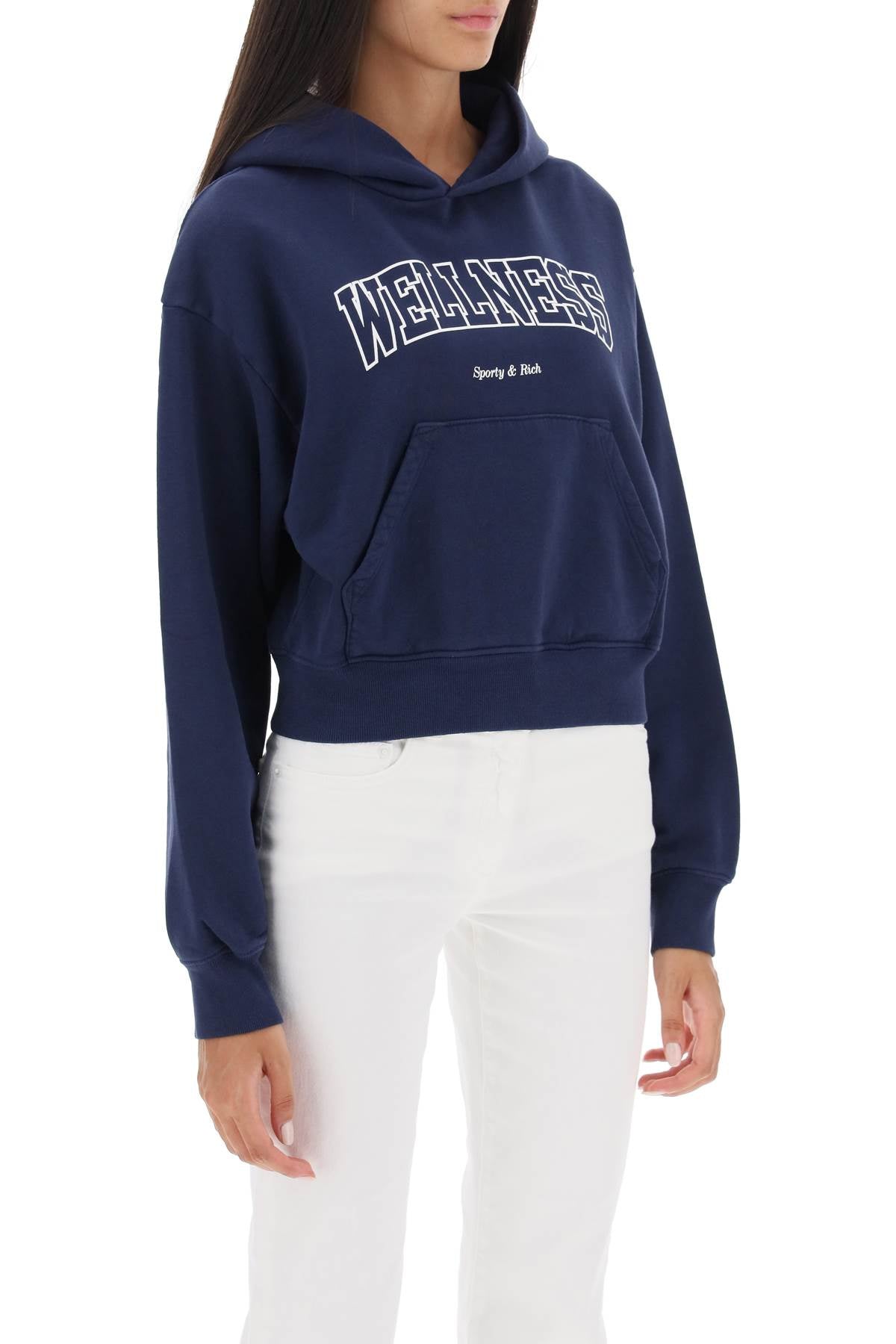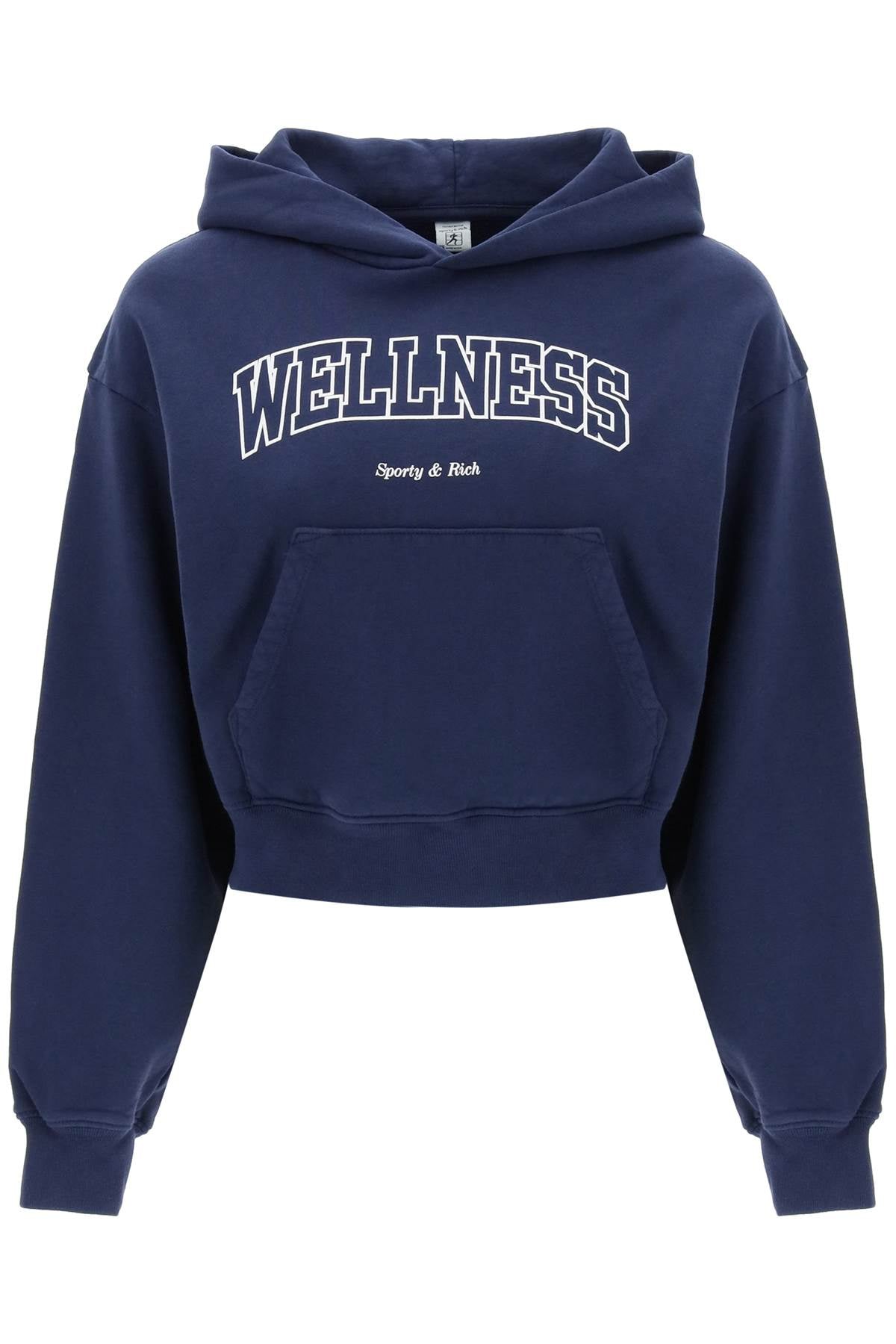 Cropped hoodie by Sporty&Rich crafted in fleece-back cotton with contrasting Wellness print on the chest. It features ribbed cuffs and hem and a front kangaroo pocket. Relaxed fit with low-set sleeves. The model is 177 cm tall and wears size XS.