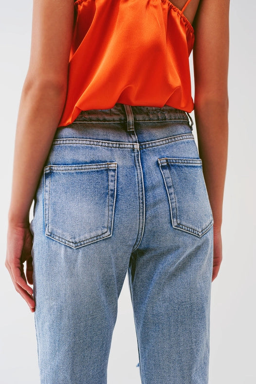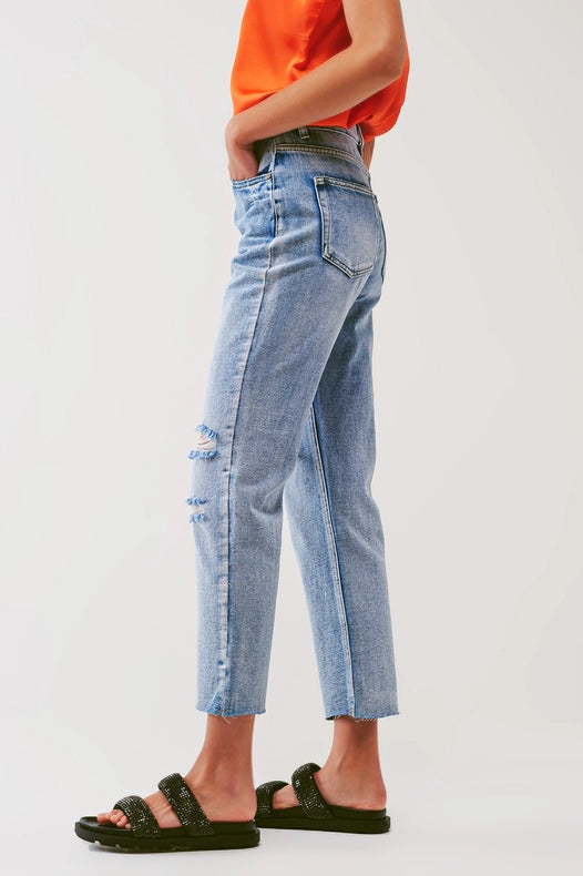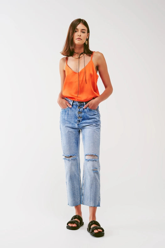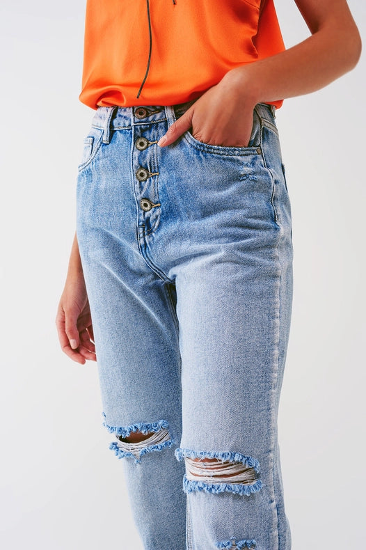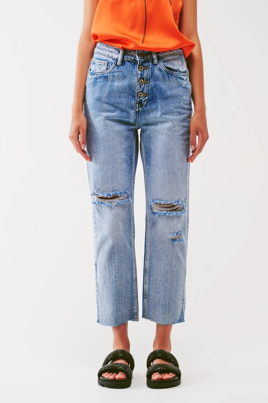 Sraight-Leg Jeans With Exposed Buttons And Ripped Knees