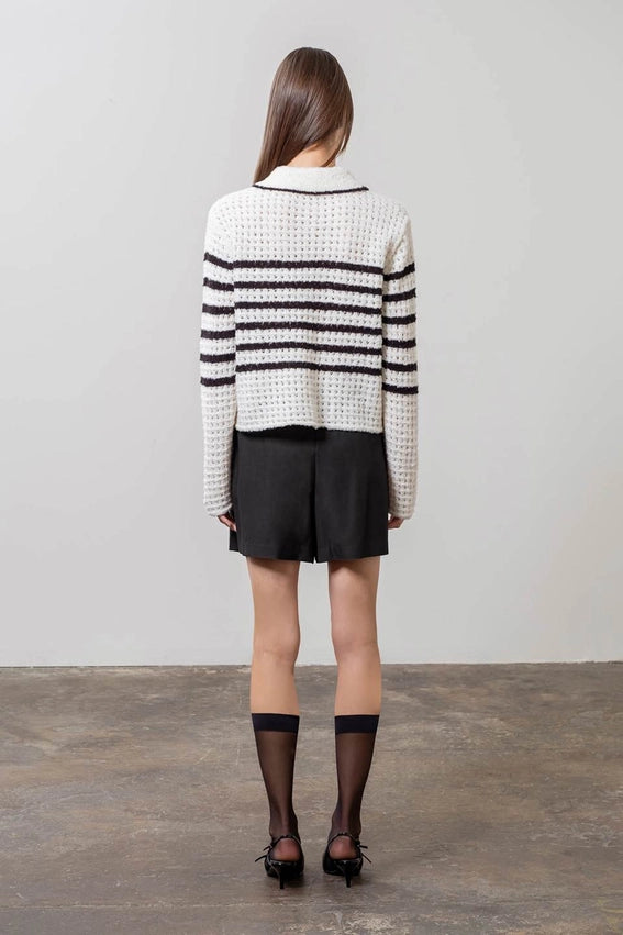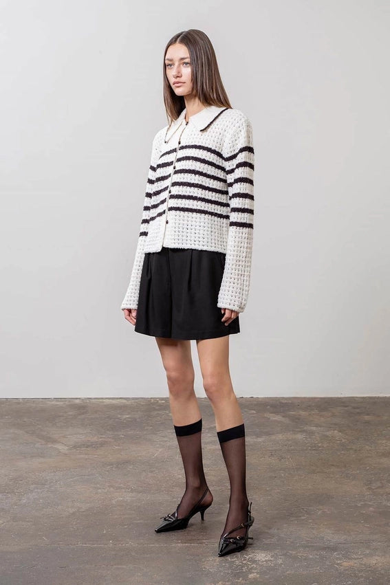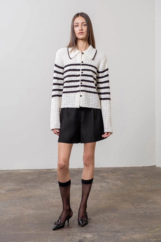 Expertly crafted from 100% polyester, our Striped Collared Button Down Crochet Knit Cardigan is a must-have for any fashion-forward wardrobe. This versatile piece features a stylish collared neckline, classic button-down closure, and chic stripe pattern. The crochet knit adds texture and dimension to the cardigan, making it perfect for any occasion. With its long sleeves and lightweight feel, it's the perfect addition to any outfit.