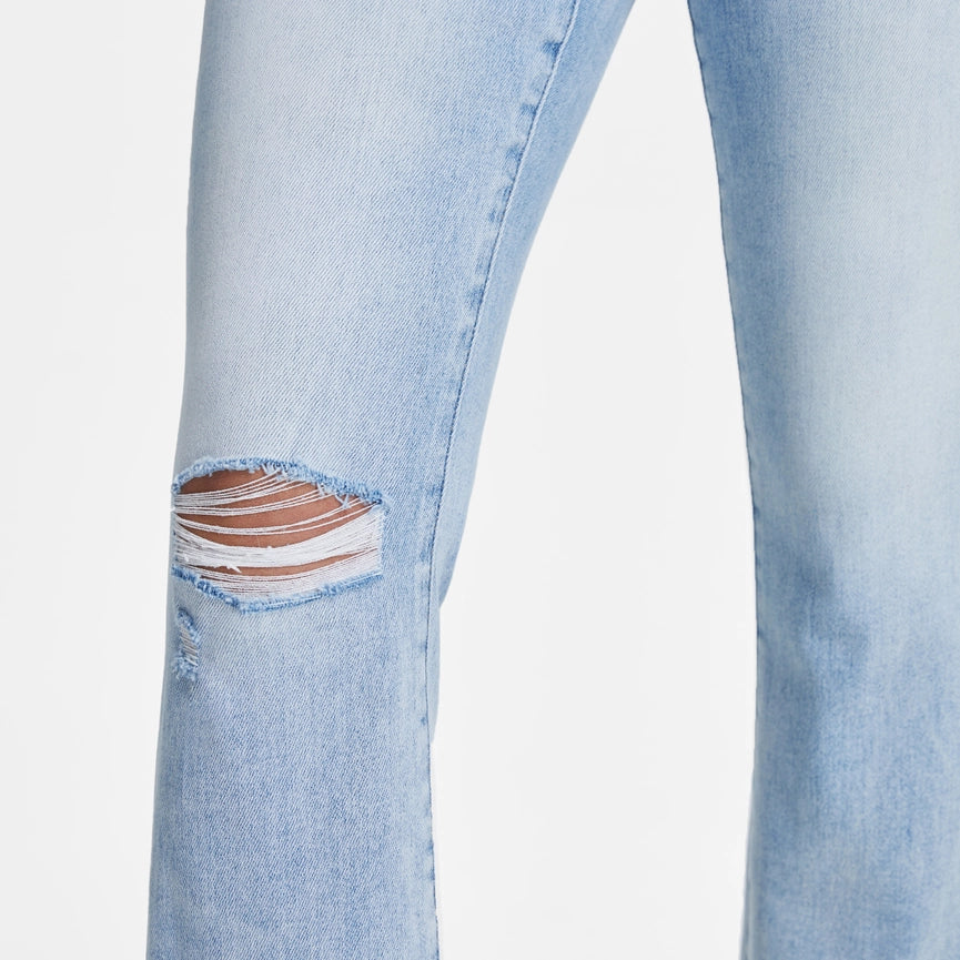 Expertly crafted from super stretch denim, these Cambridge light blue jeans offer a natural washing effect and a distressed hole design for a stylish edge. With a super high rise waist and a raw hem, these straight jeans are both comfortable and fashionable. Machine washable for convenience.