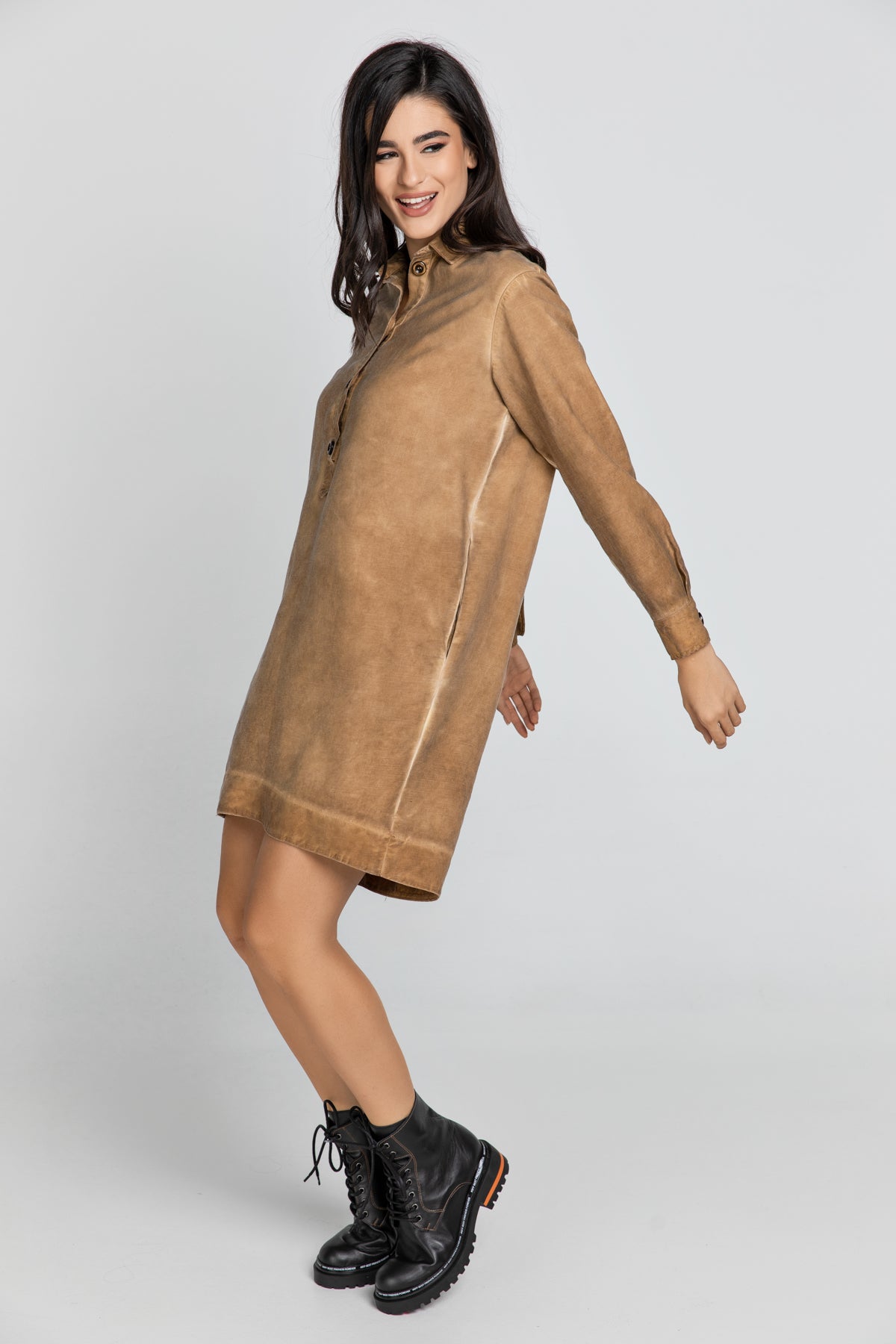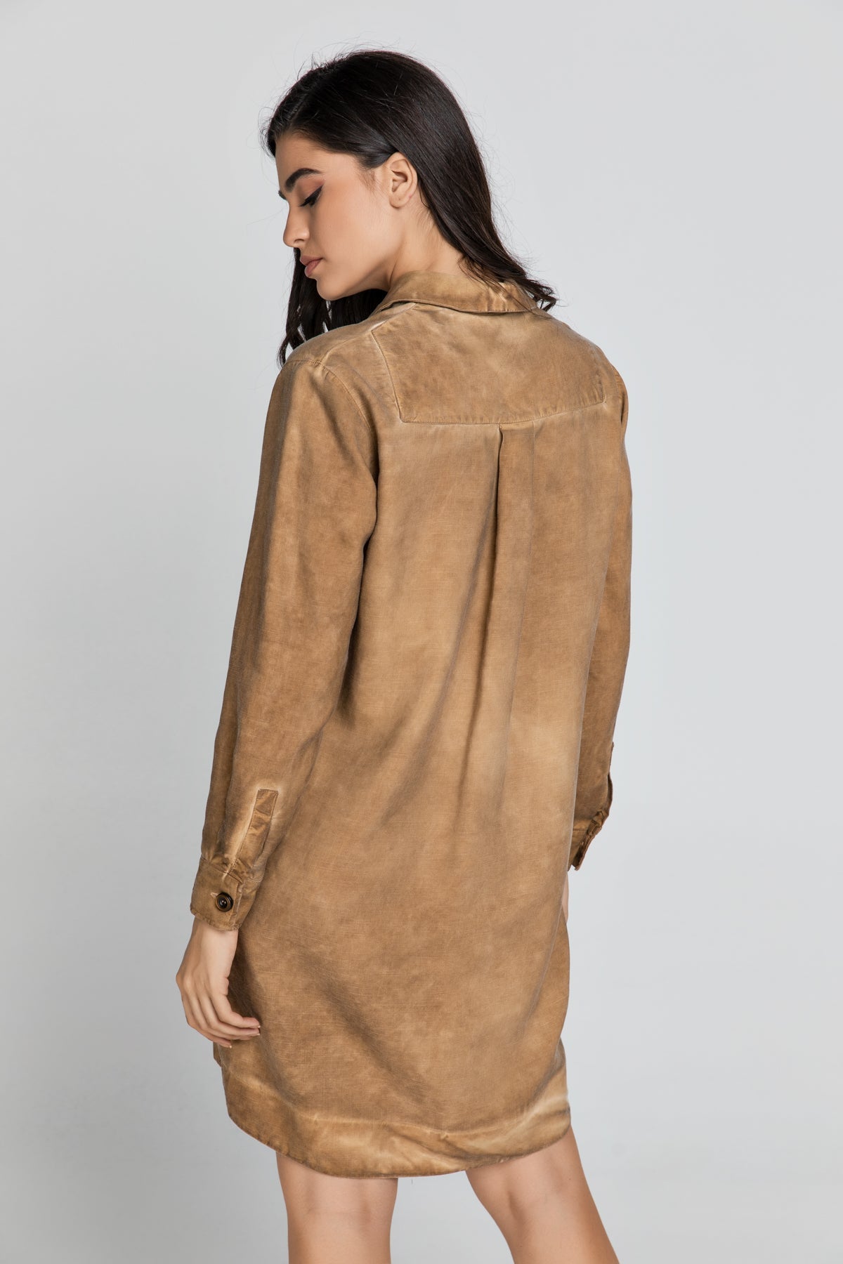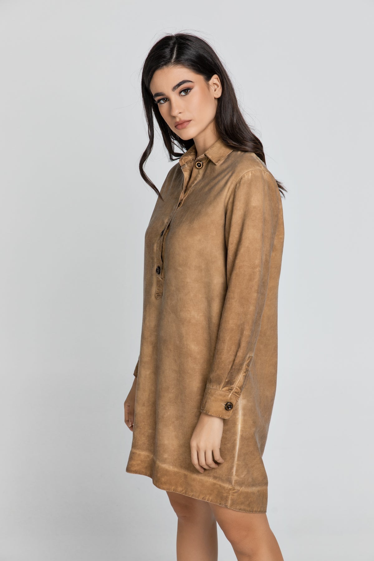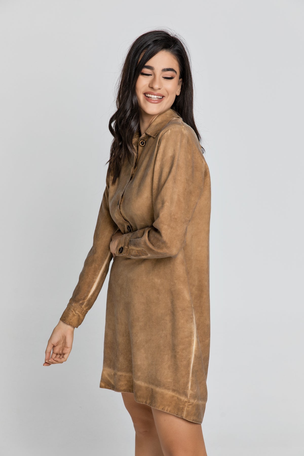Taupe tencel shirt dress. Long sleeves with cuffs which fasten with one button. Shirt collar with a long four button placket in the front. Two side pockets. Sack silhouette. Length: slightly above the knee. Our model is 176cm and is wearing size 36/S. Measurements for size 36/S (in cm): Shoulder -41, Chest-53, Waist-53, Bottom-55, Sleeve Length-58, Body length-89. Accessories are not included. 100%tencel