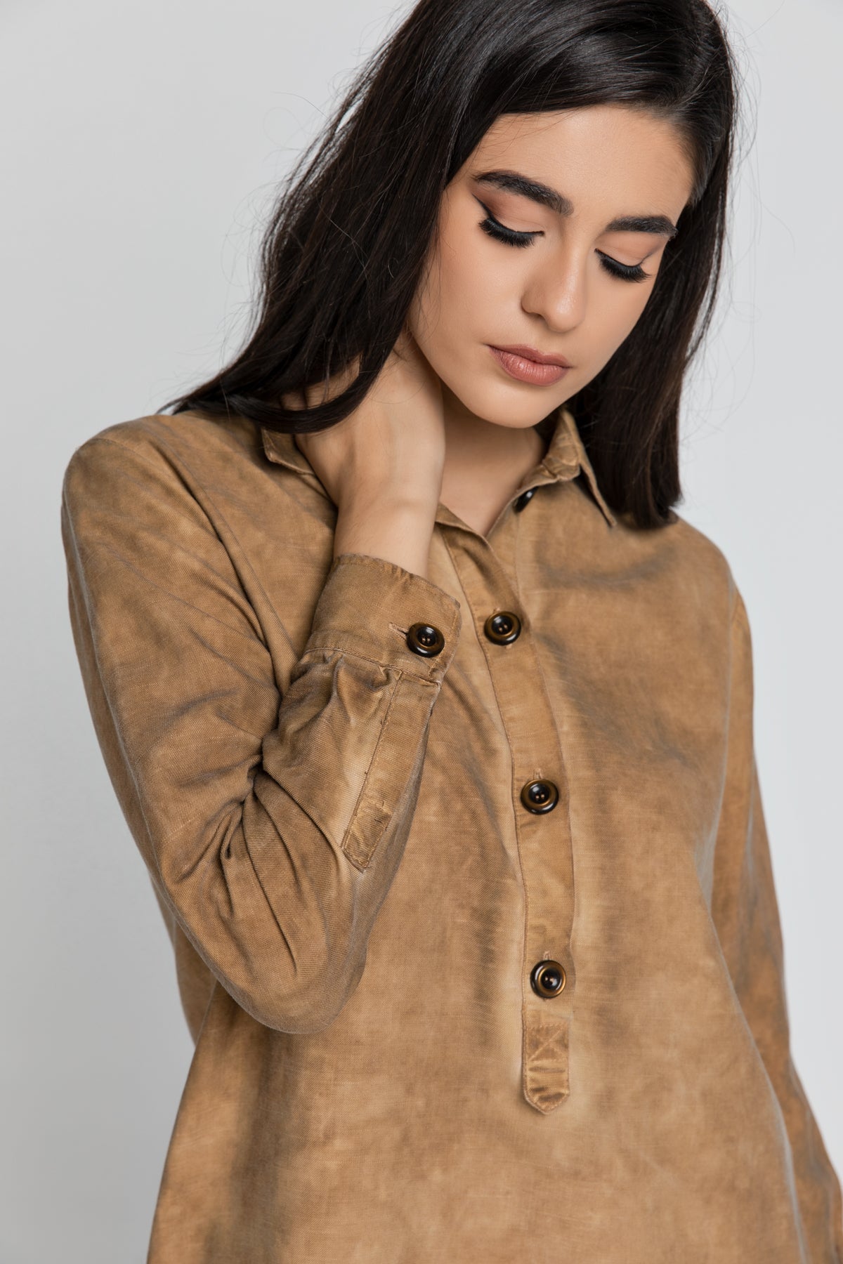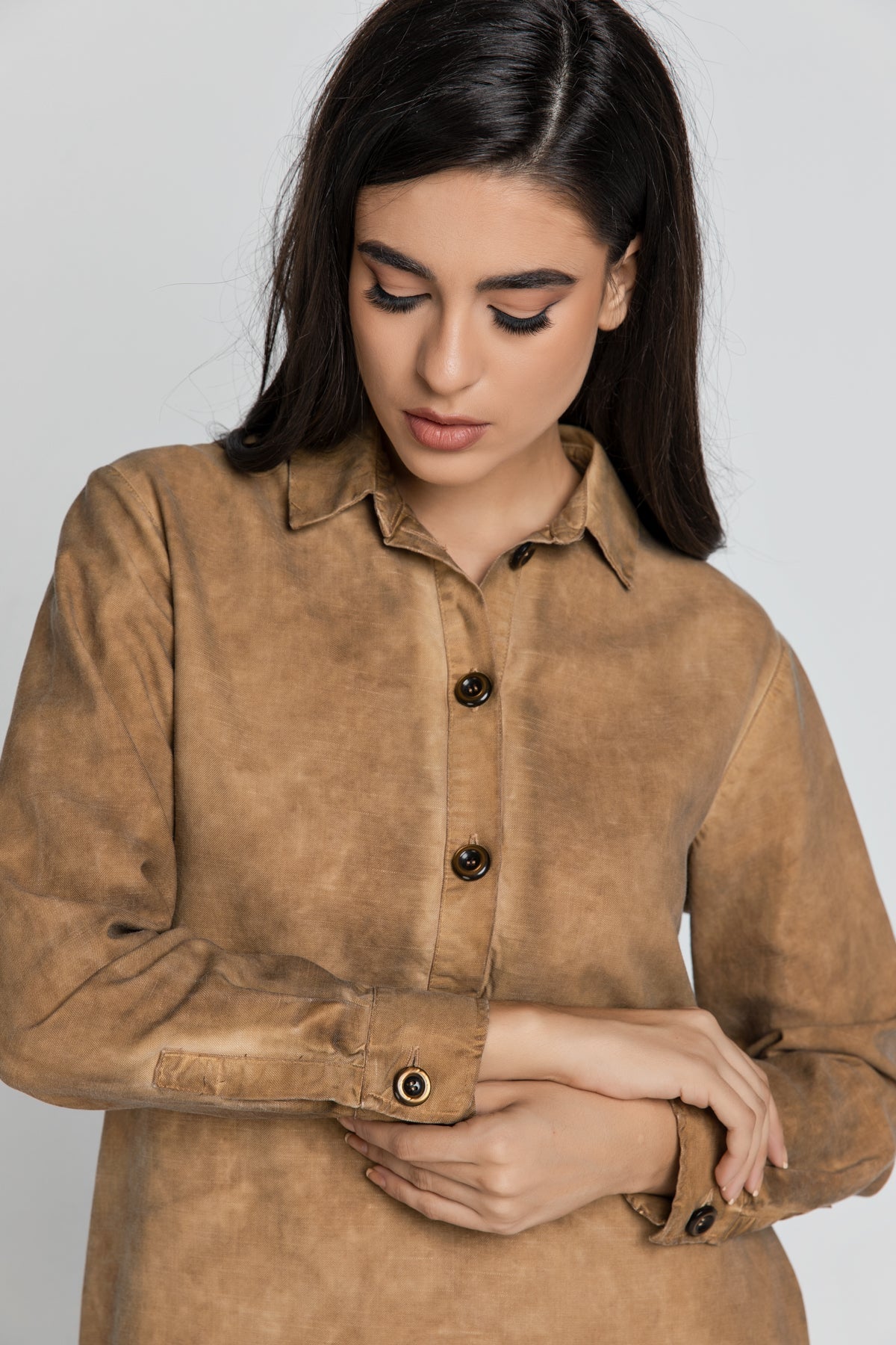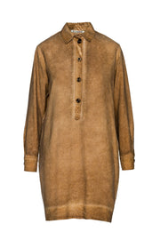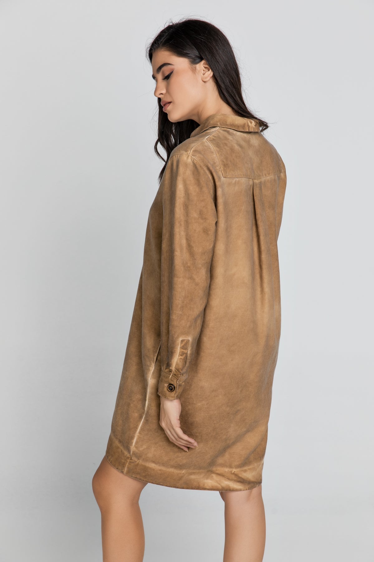 Taupe tencel shirt dress. Long sleeves with cuffs which fasten with one button. Shirt collar with a long four button placket in the front. Two side pockets. Sack silhouette. Length: slightly above the knee. Our model is 176cm and is wearing size 36/S. Measurements for size 36/S (in cm): Shoulder -41, Chest-53, Waist-53, Bottom-55, Sleeve Length-58, Body length-89. Accessories are not included. 100%tencel
