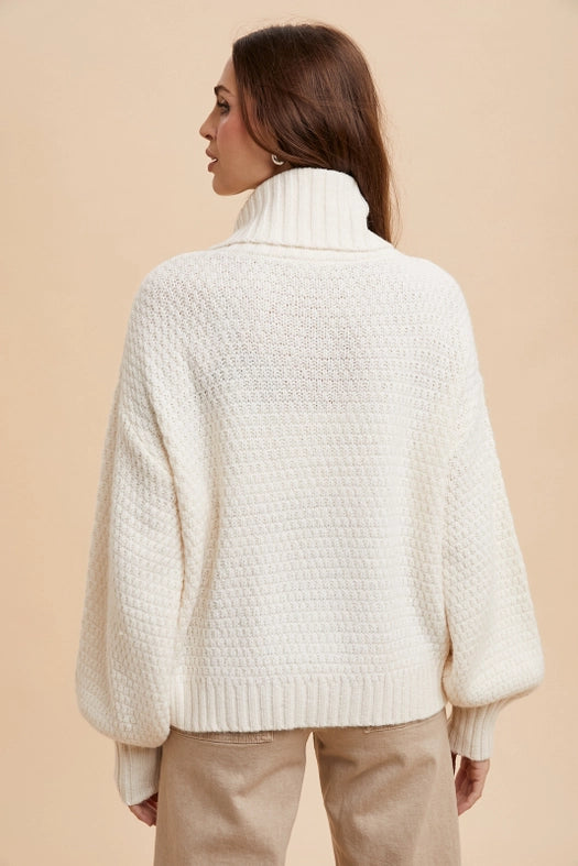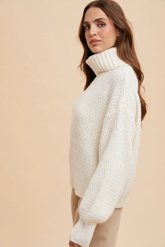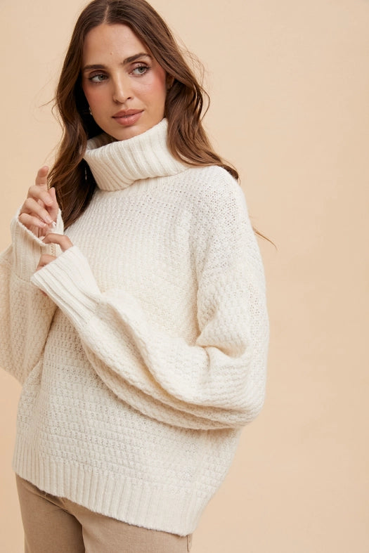 Upgrade your winter wardrobe with our Textured Knitted Turtleneck Sweater. The unique texture, ribbed banding, and drop and balloon sleeves give a modern twist to a classic turtleneck. Stay warm and stylish with this must-have sweater.