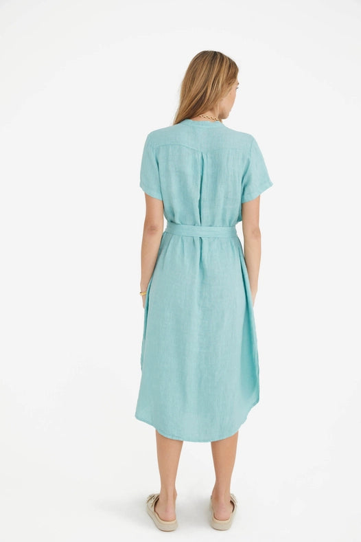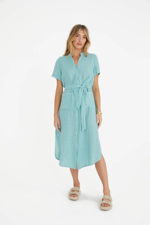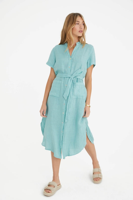 Introducing the Rosemary Linen Dress in Celeste, a versatile and stylish addition to your wardrobe. Crafted from 100% linen, this elegant dress combines structure with comfort. With a lined button-front and pockets, it's both functional and chic. Perfect for any occasion, day or night.