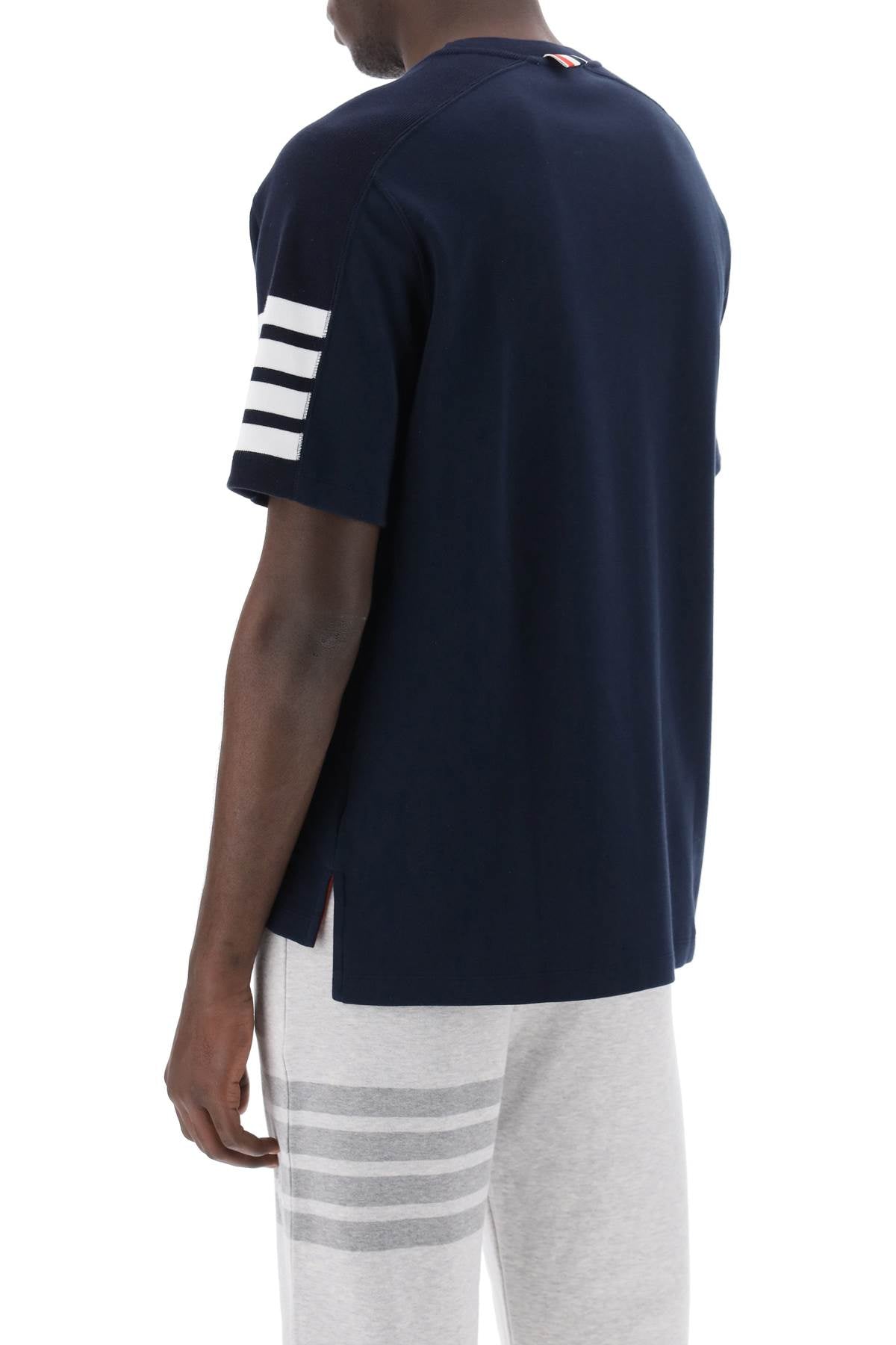 Thom Browne T-shirt crafted in solid cotton jersey with shoulder knitted inserts embellished with 4-Bar motif on the left side. It features crew neck and it is branded with Name Tag on the hem and tricolor grosgrain loop tab on the upper back and on the inside of the slits. Dropped-back hem, regular fit. The model is 187 cm tall.