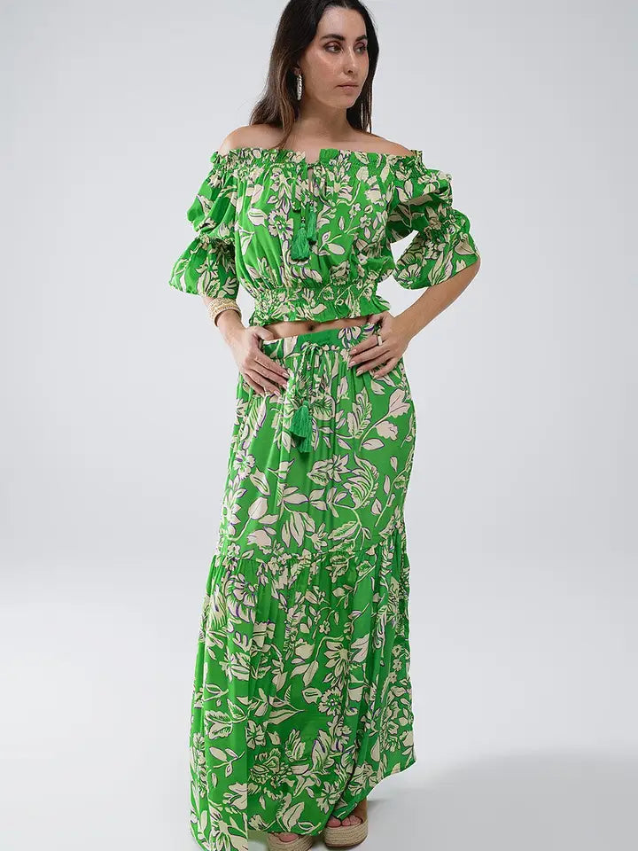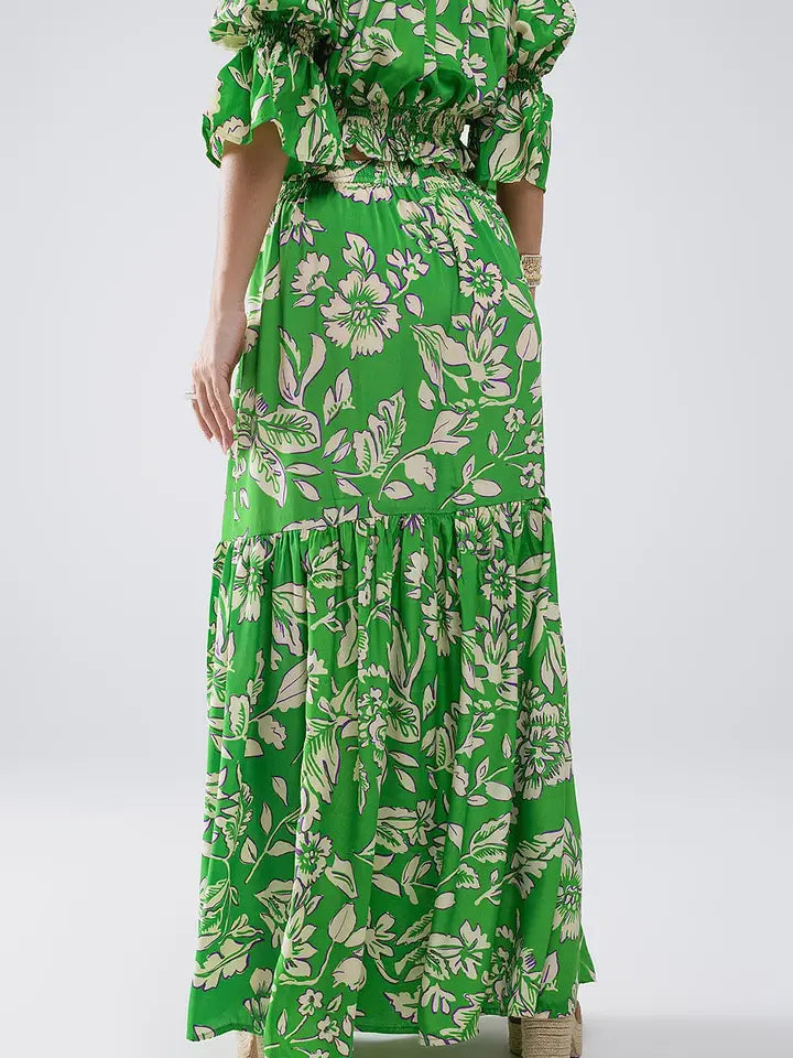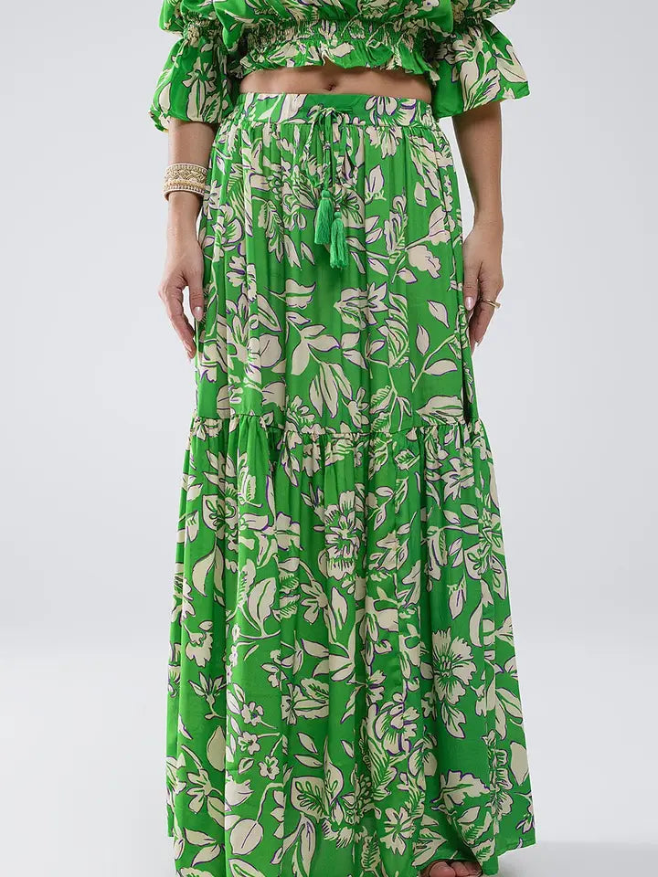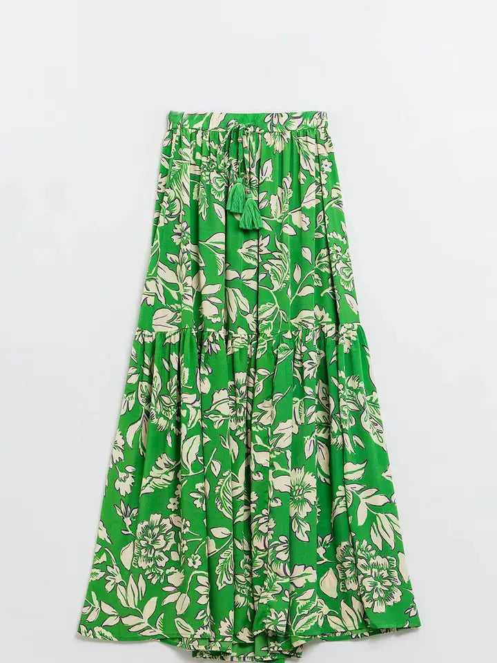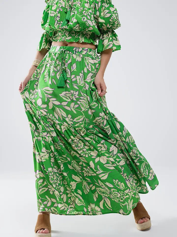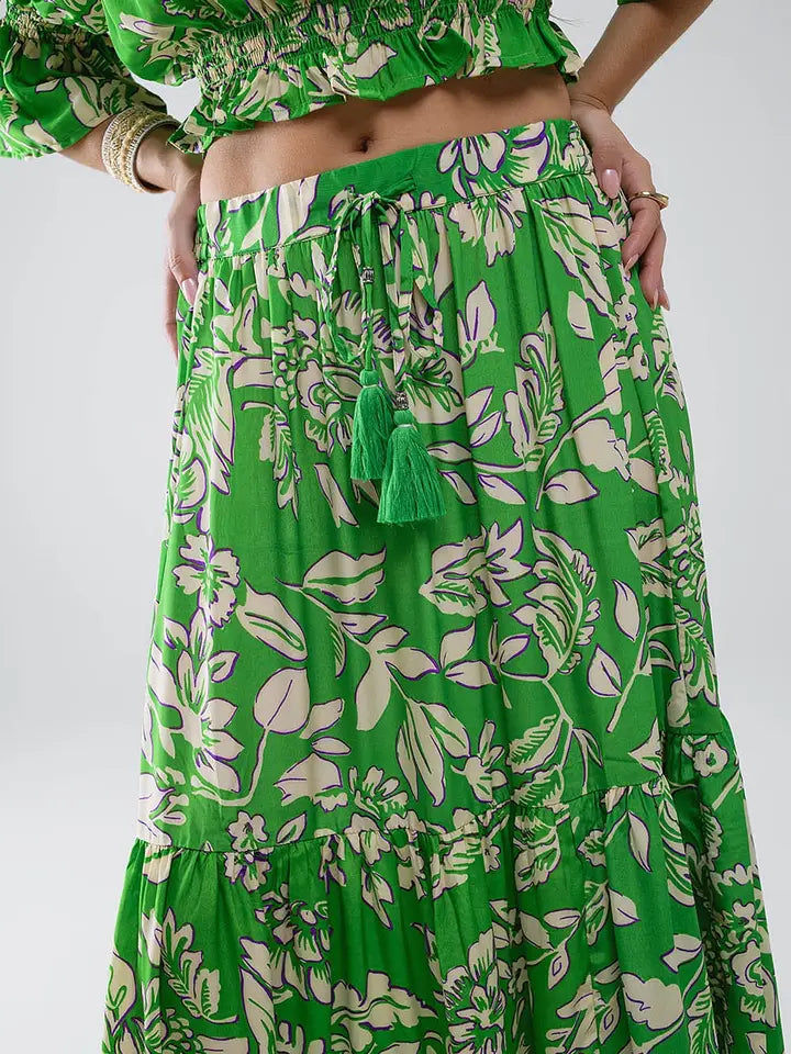 This tiered maxi skirt features a vibrant green floral print that perfectly captures a boho vibe. Made from lightweight woven 100% polyester, it offers comfortable wear throughout spring and summer. The elasticated drawstring waist ensures a customizable fit that runs true to size, combining style with ease. Machine washable for simple care, this skirt is an effortless addition to your warm-weather wardrobe.