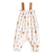 The Tiny Shine on Me Smocked Ruffle Romper is one of our favorite styles for summer. Playful ruffle and smocked details with an adorable golden sun and rainbow pattern!