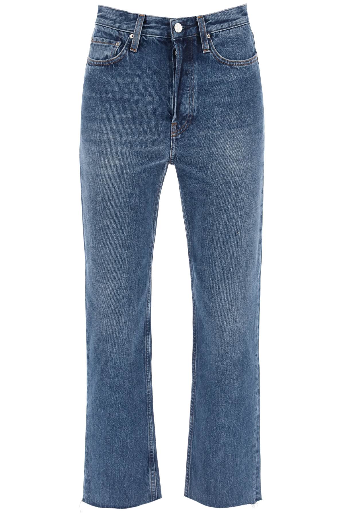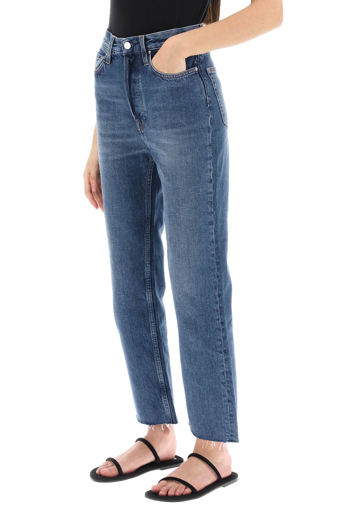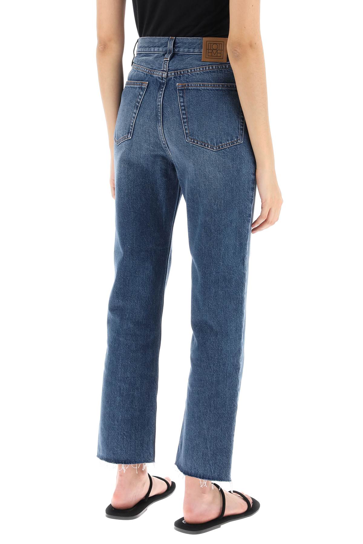 Totême five-pocket jeans cut in a mid-rise from organic cotton denim. This style features a straight-leg silhouette with cropped length, finished with a raw edge. Belt loops, monogram button fly. The model is 177 cm tall and wears a size 27.