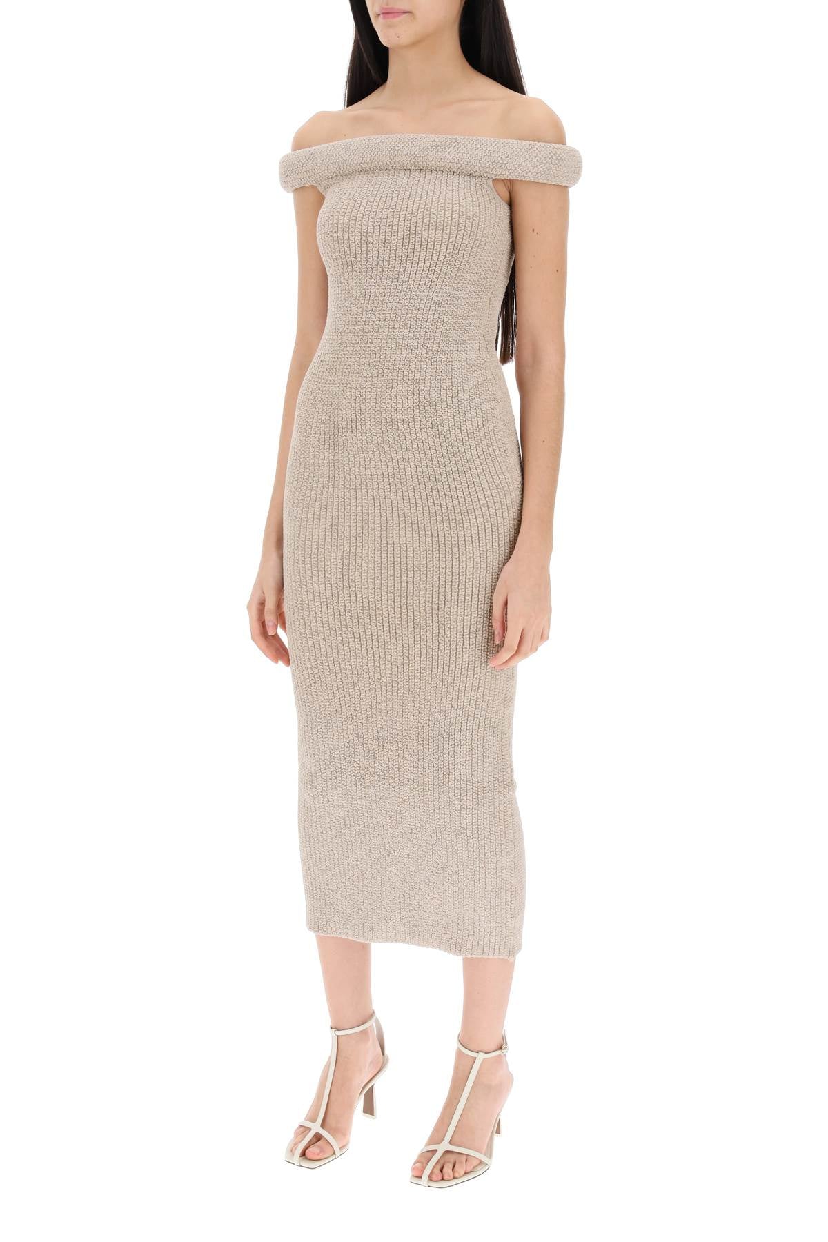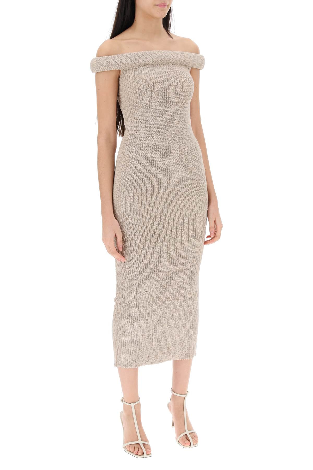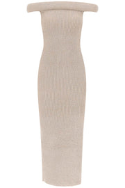 Elevate your evening wear with the Toteme off-shoulder knit dress. The waffle knit lurex fabric adds a touch of sparkle to the fitted tube silhouette, while the off-shoulder neckline with a rolled effect brings a modern twist. Perfect for any special occasion, this midaxi length dress will make you feel confident and stylish. Available in size XS to suit any body type.