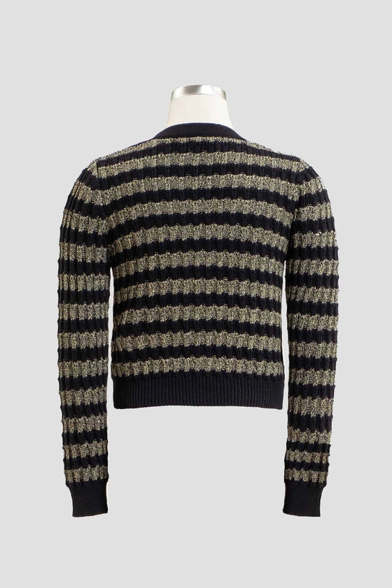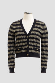 As an industry expert, our Stripe V Neck Button Front Knit Cardigan offers both style and comfort. Made of 100% cotton with a stripe pattern, it features a v neckline, long sleeves, and a button down design. With a cropped fit and mock pocket detail, it's perfect for layering.