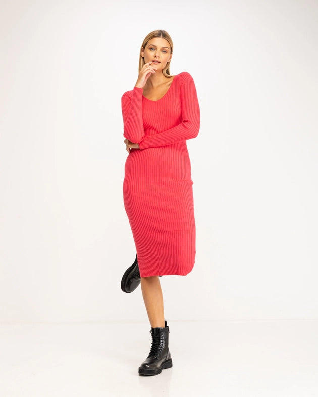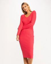 Enhance your professional wardrobe with our V-neck ribbed knit fitted midi dress. The sleek design and figure-flattering fit will elevate your style and confidence. Made with high-quality materials, this dress is perfect for any occasion. Upgrade your look with this must-have dress.