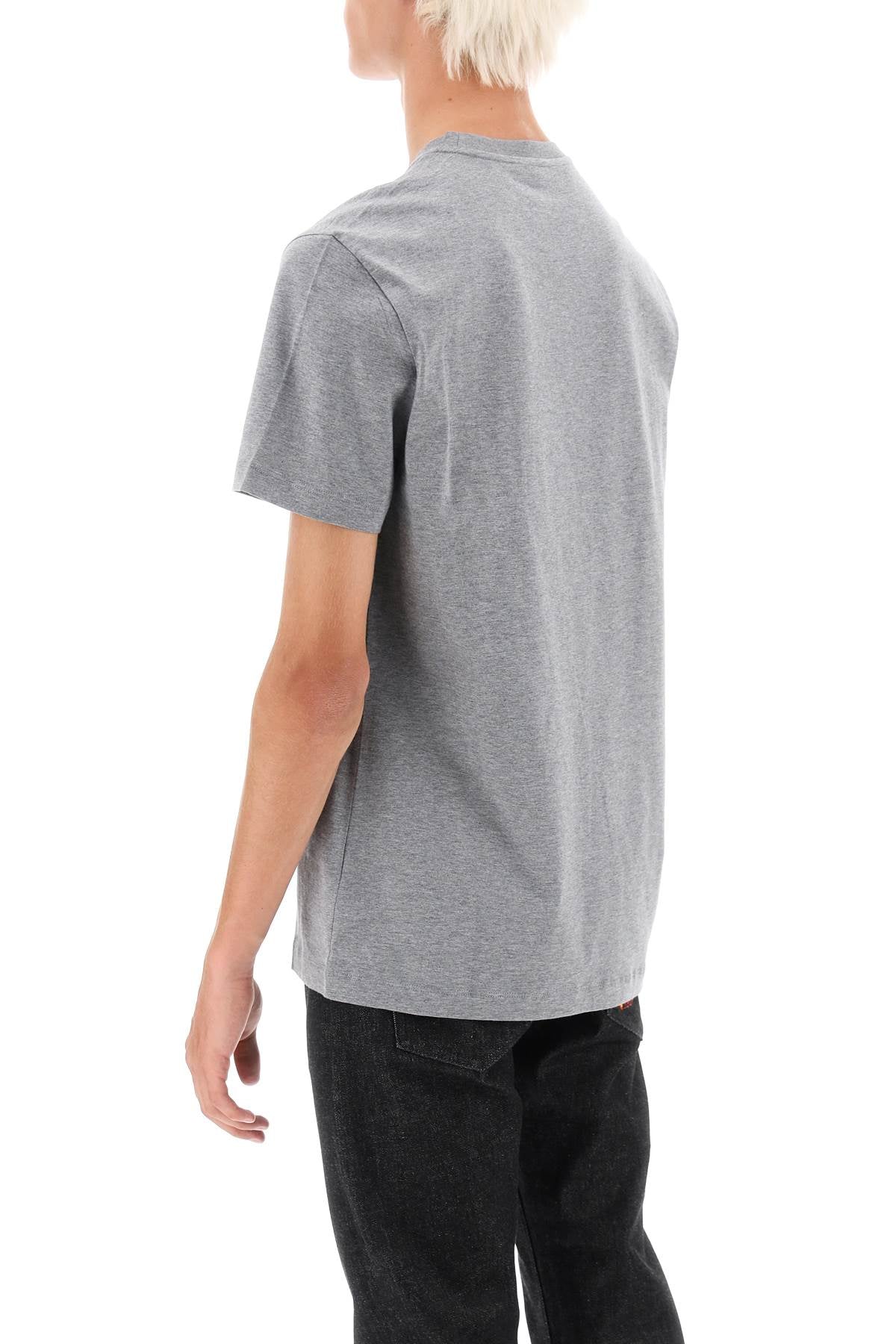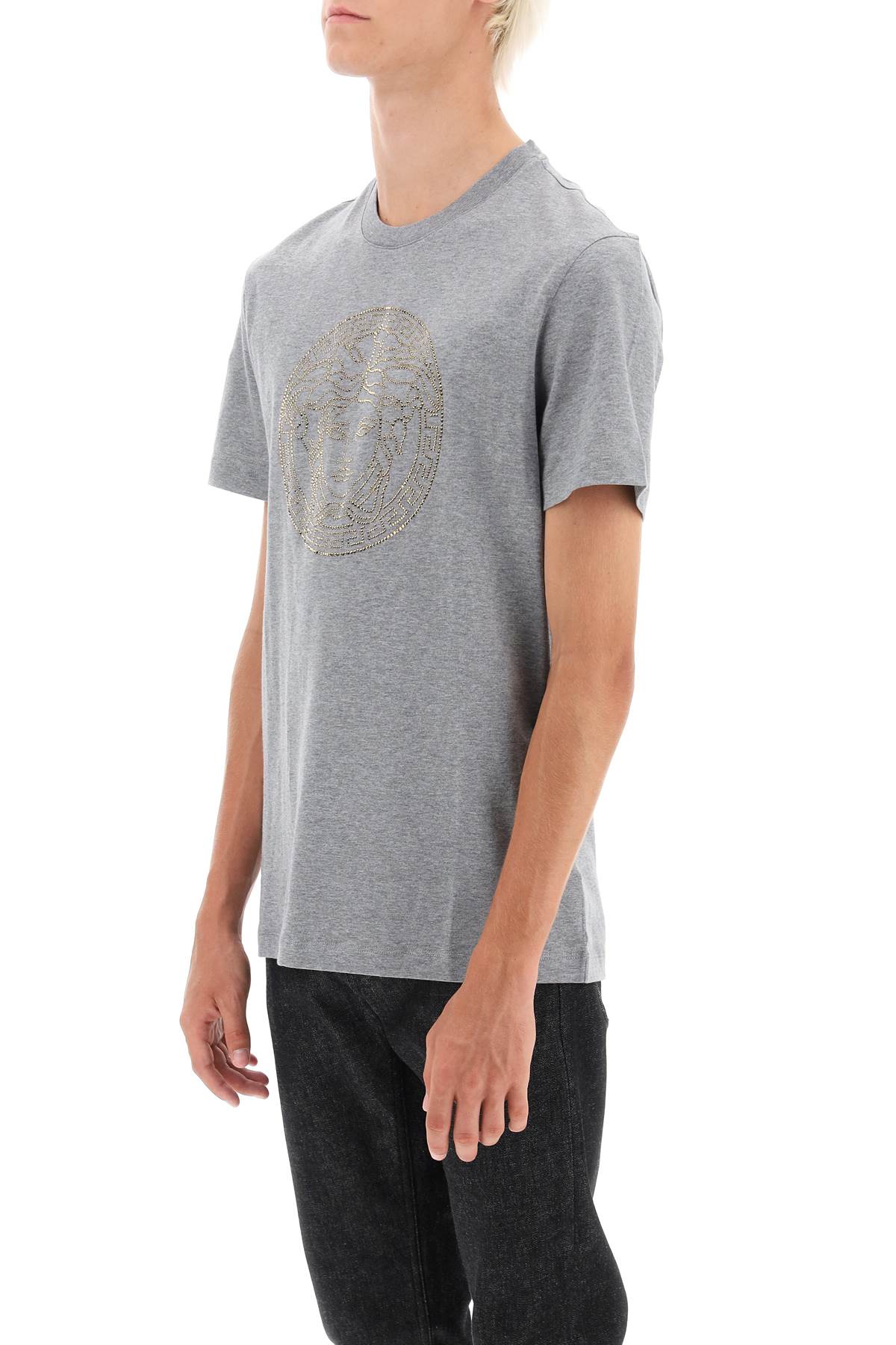 Versace crewneck t-shirt made of pure cotton jersey and characterized by Medusa decoration with gold-tone rhinestones at front. Regular fit. The model is 187 cm tall and wears a size L.