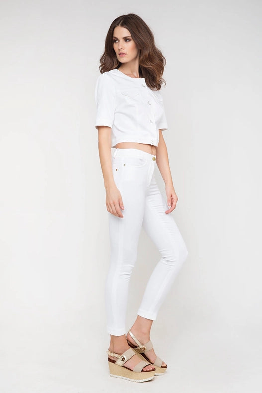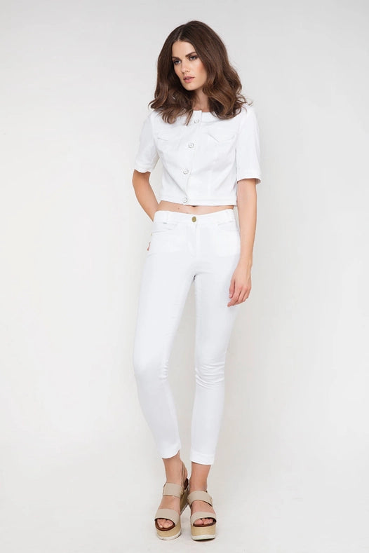Expertly crafted from stretch gabardine fabric, this white cropped jacket boasts a sleek, straight silhouette. The round neckline and 3cm hem add subtle touches of elegance, while the 4 decorative buttons in white and silver and 2 outer pockets offer both style and functionality. Unlined for lightweight comfort. Length for size 38: 42cm.