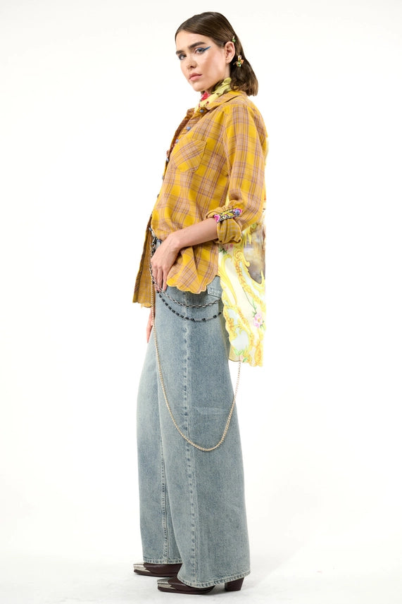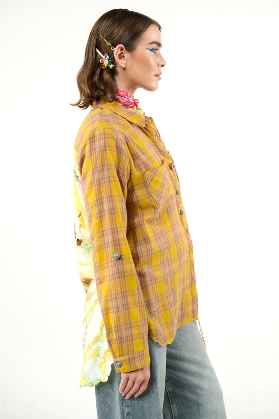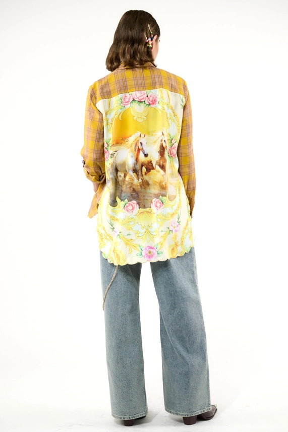The Wild Wild West Shirt features a stylish plaid design with a unique contrast horses and floral print on the back. With a crystal button attached to the front and roll-over sleeve tabs, this shirt is perfect for any formal occasion. Its high-low metallic gold scallop hem adds a touch of sophistication to the mustard and ivory color combo. Made from 100% cotton and rayon, it's easy to care for with a hand-wash and line dry method. Upgrade your wardrobe with this must-have shirt.