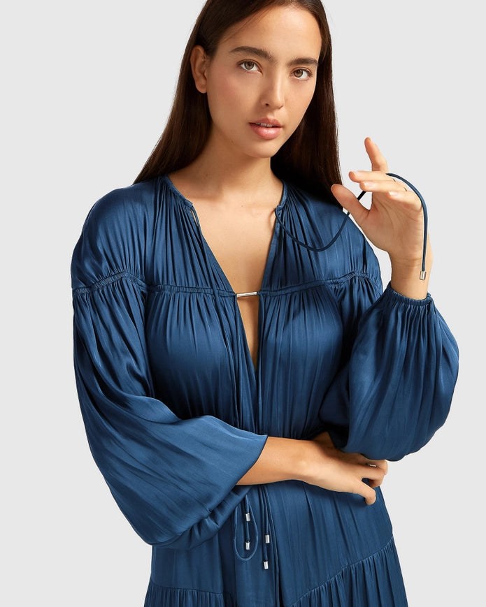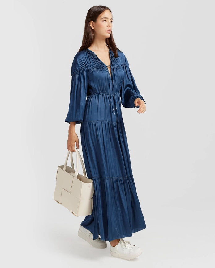 Indulge in comfort and beauty with our Window Seat Tiered Maxi Dress in blue. With voluminous bishop sleeves, a plunging neckline, and a tiered skirt, this dress exudes effortless elegance. Made from 100% recycled polyester and featuring neck and waist ties, elastic cuffs, and a maxi length of 140cm, you'll feel like you're walking through a field of flowers.