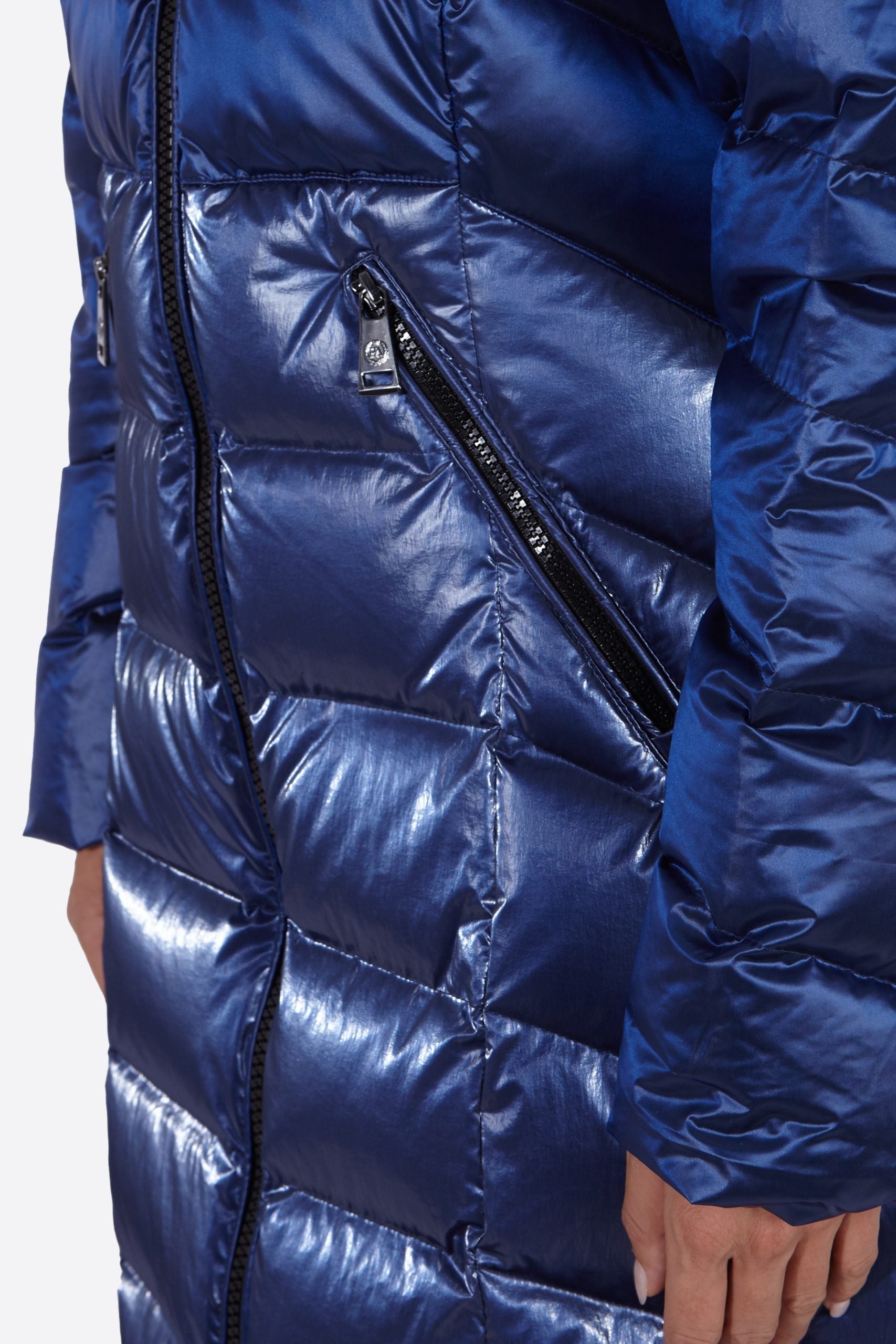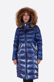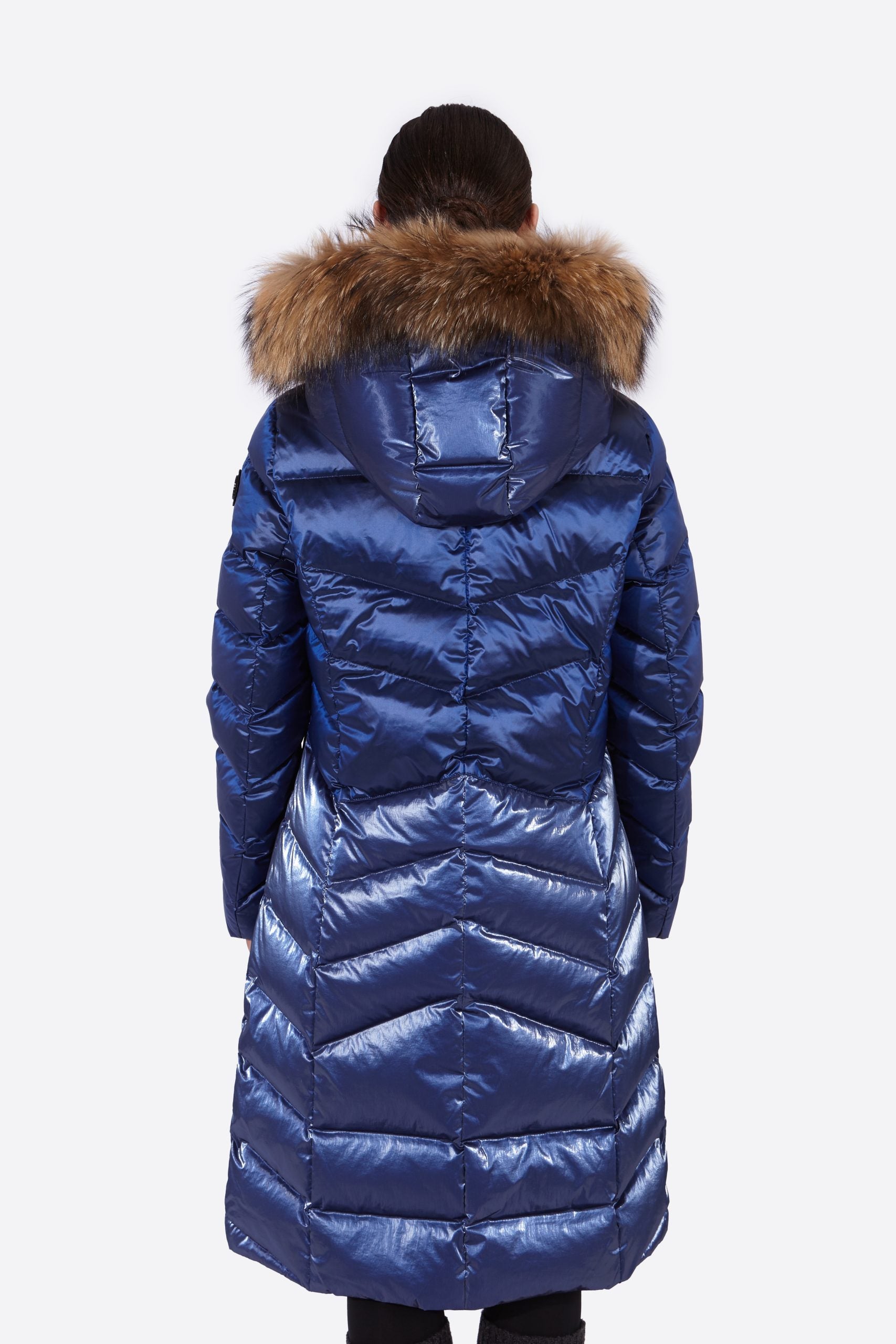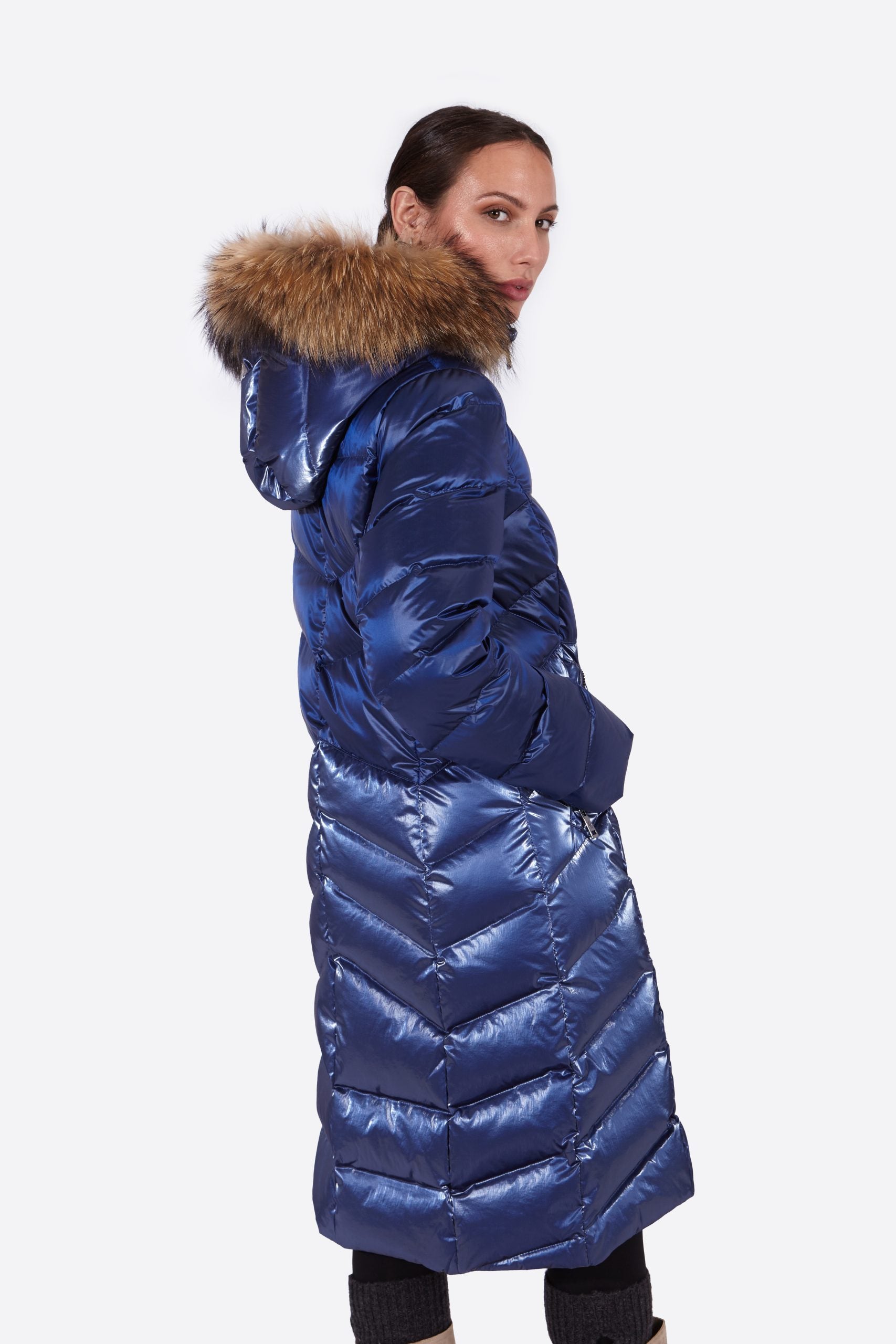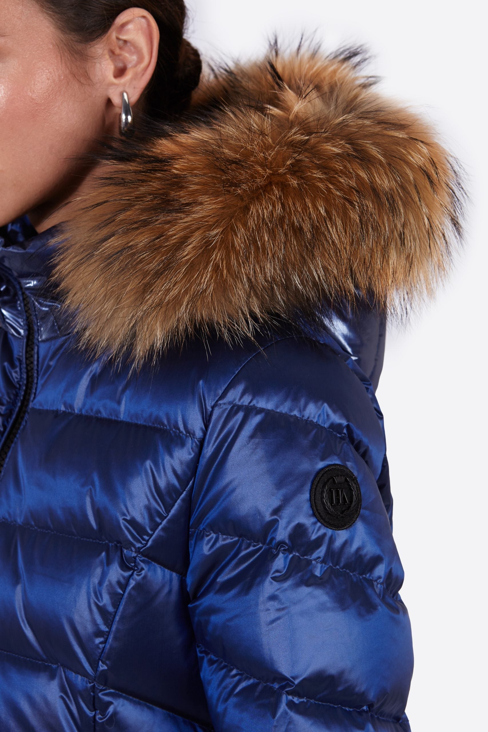 Stay warm and stylish this winter with our women's fitted down jacket, featuring zig-zag quilting and a water repellent and windproof fabric. The fixed hood with detachable racoon fur adds a touch of elegance, while the double slider zipper and inner sock provide extra protection against the cold. Made with 90% down and 10% feather filling, this jacket will keep you cozy all season long. Length: 95cm.