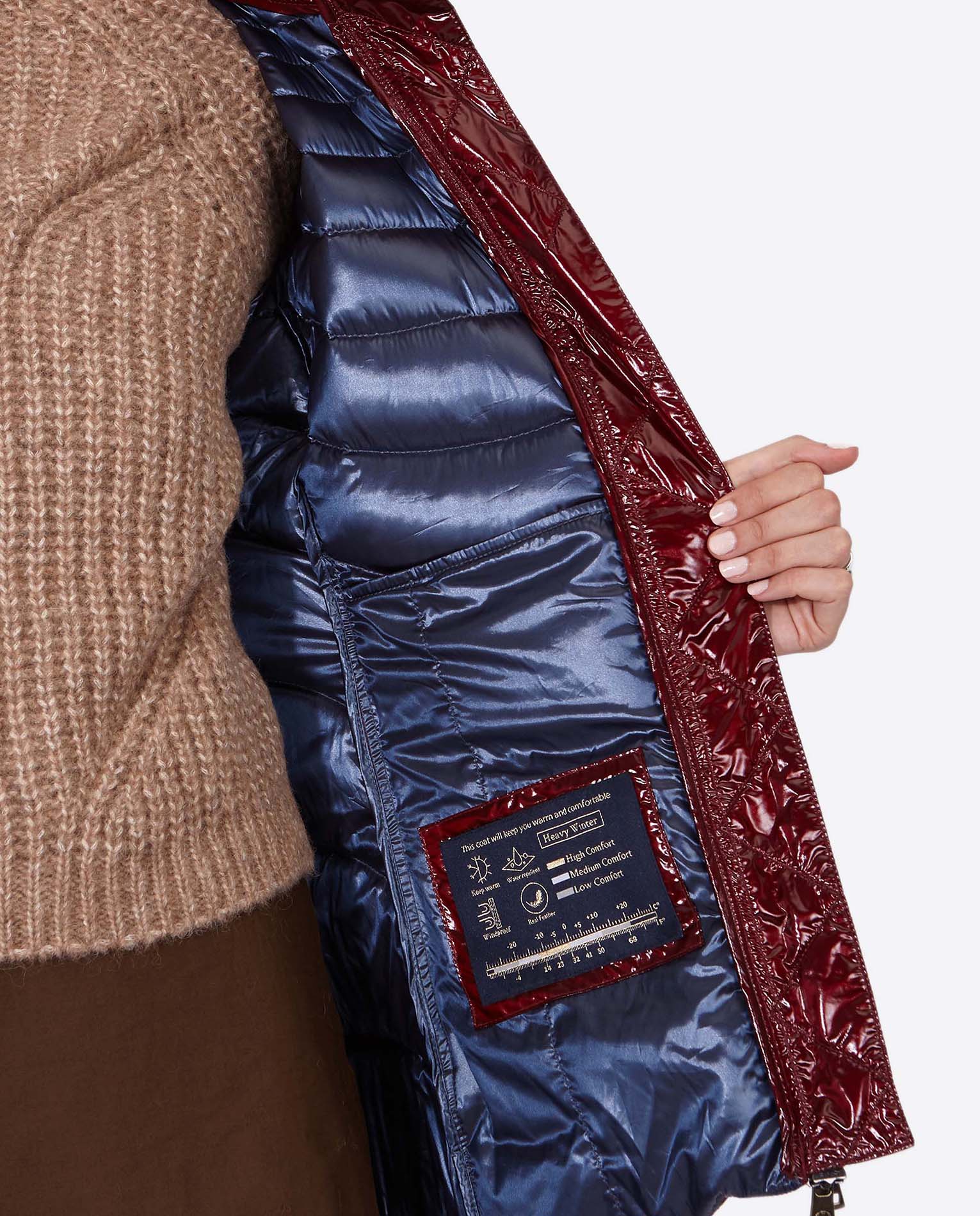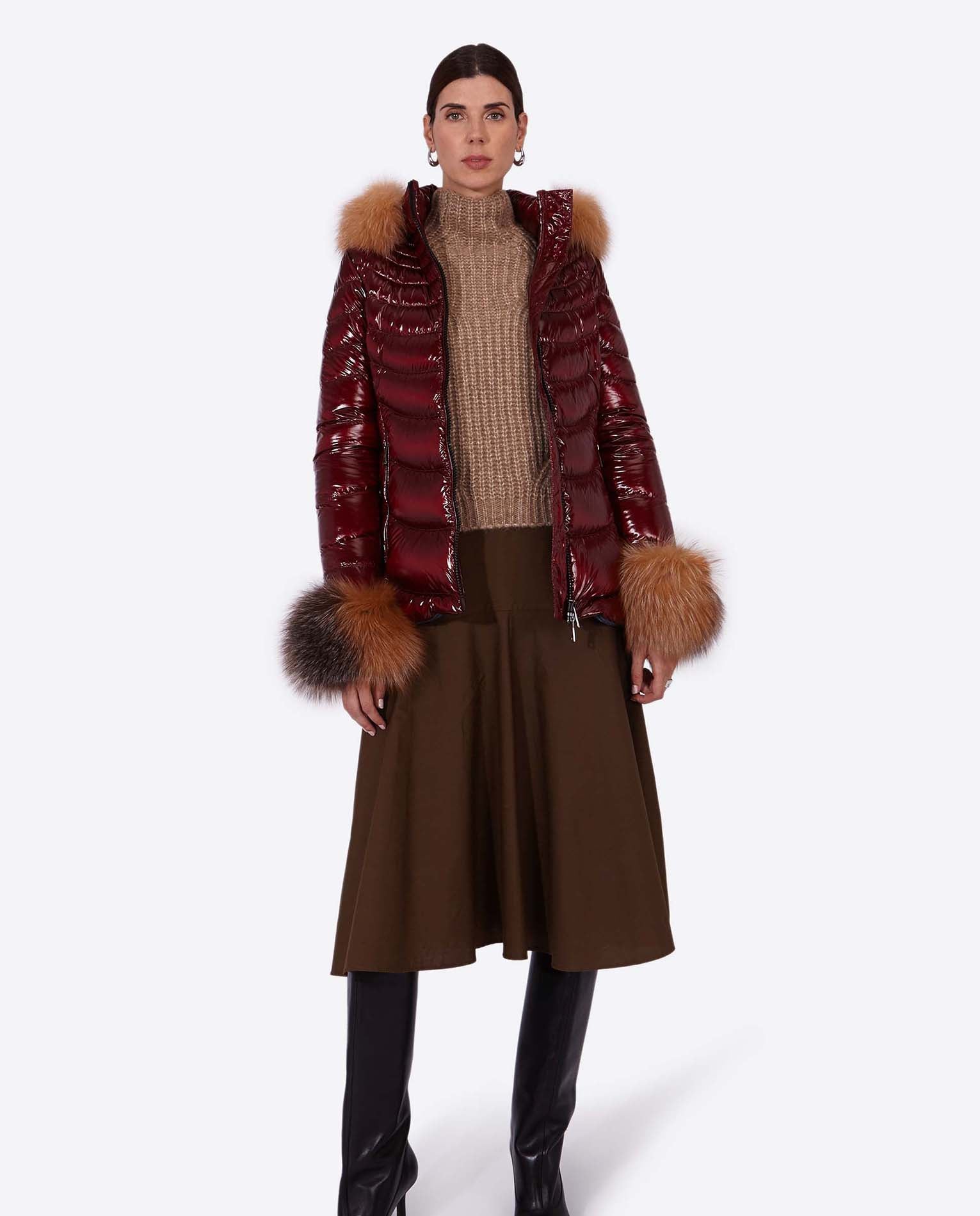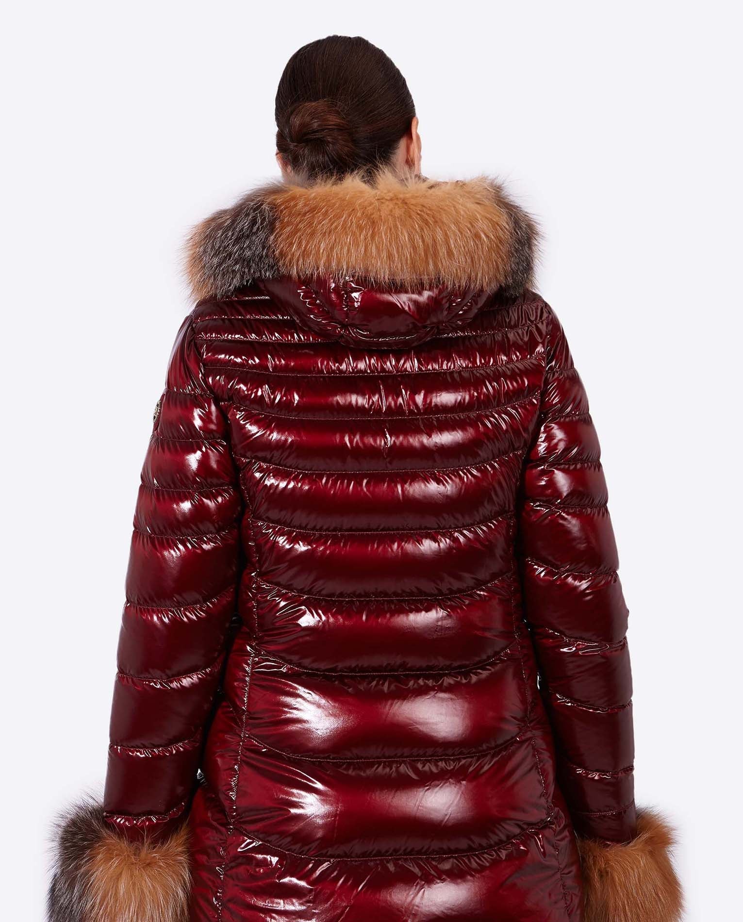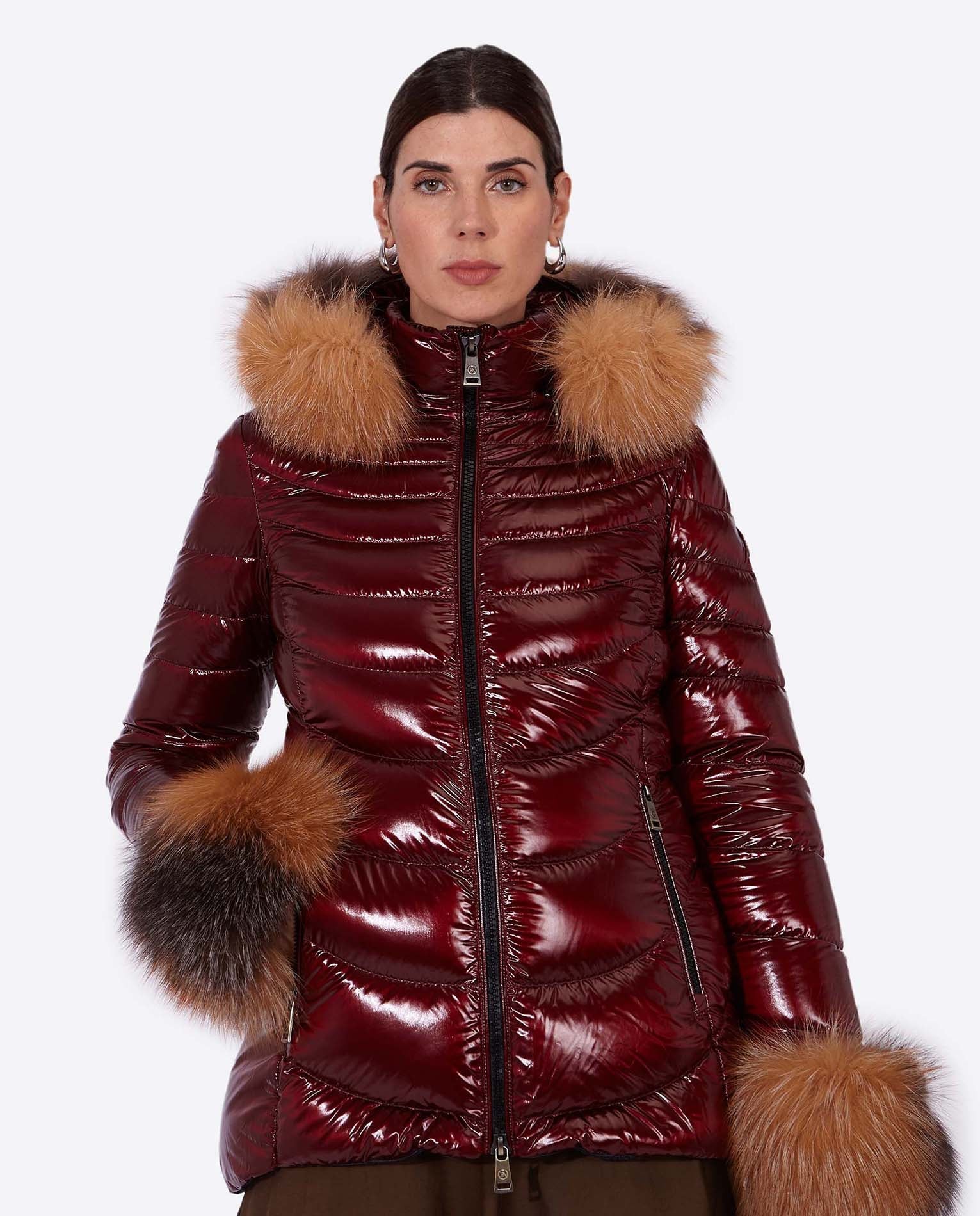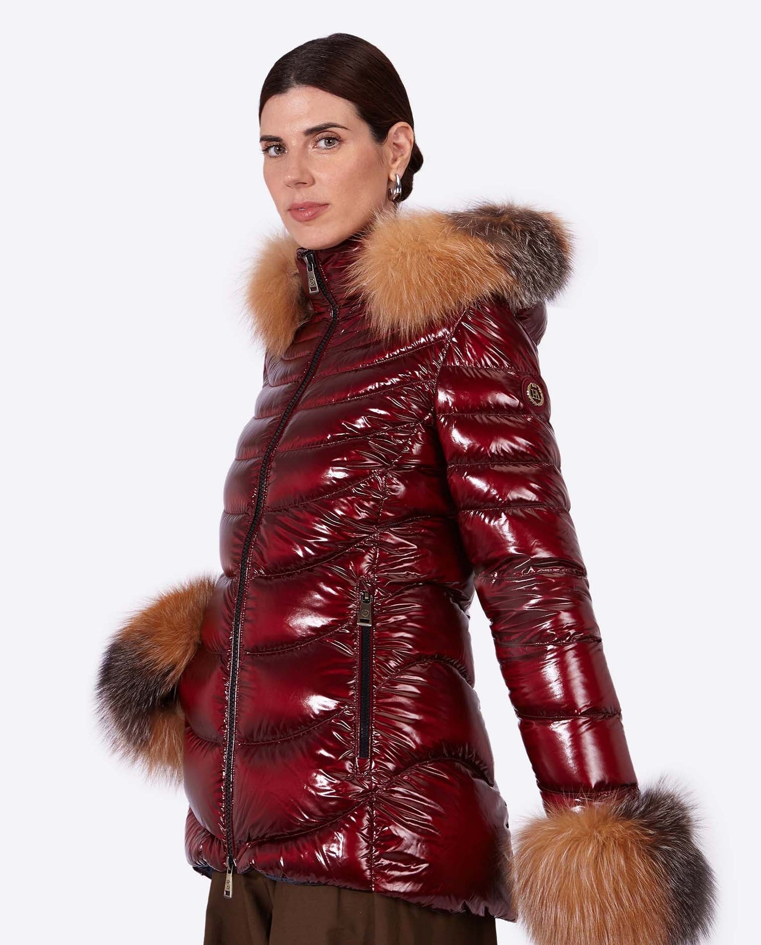 Upgrade your winter wardrobe with the Women's down jacket ELIZABETH. Expertly designed in waves for a snug fit, with water repellent and windproof fabric to keep you warm and dry. Enjoy added versatility with a detachable hood and cuffs featuring detachable crystal fox fur. Made with 90% down and 10% feather filling, and a lacquered gloss fabric finish for a luxurious touch.