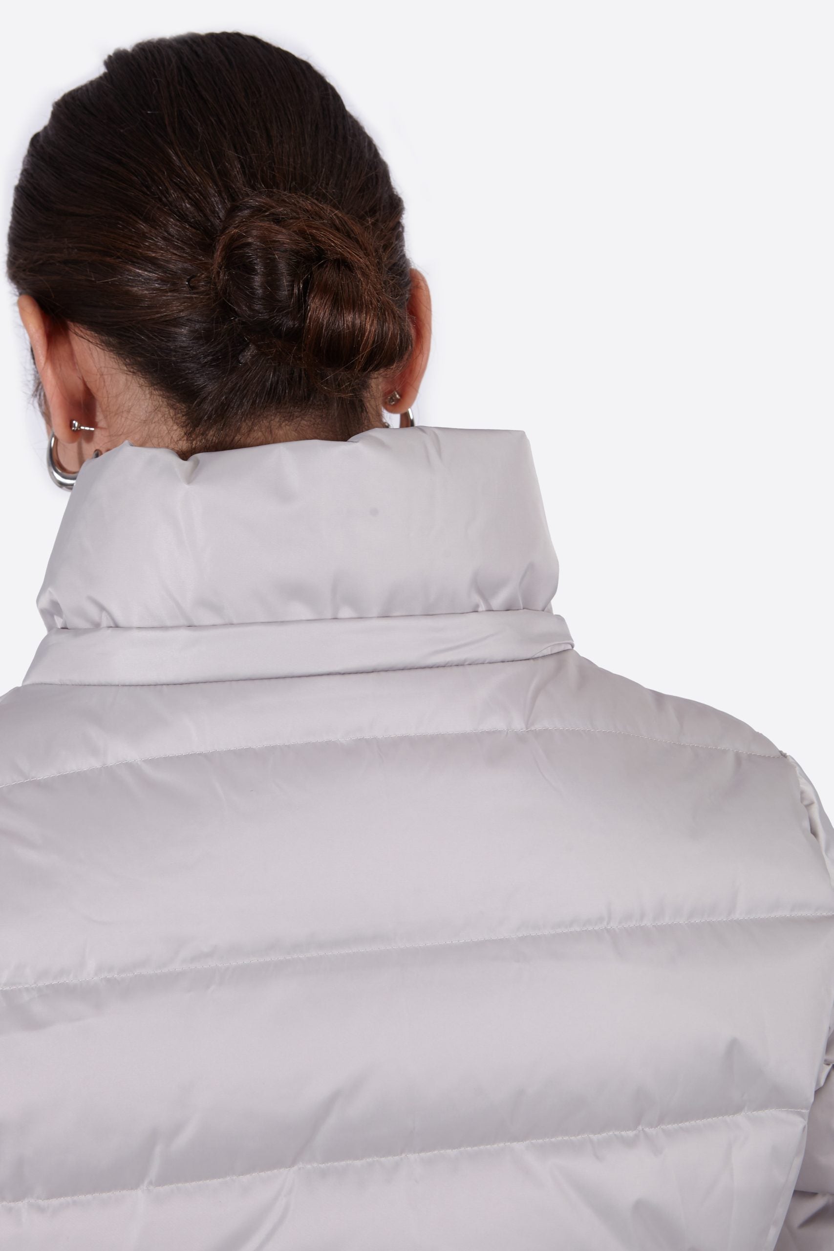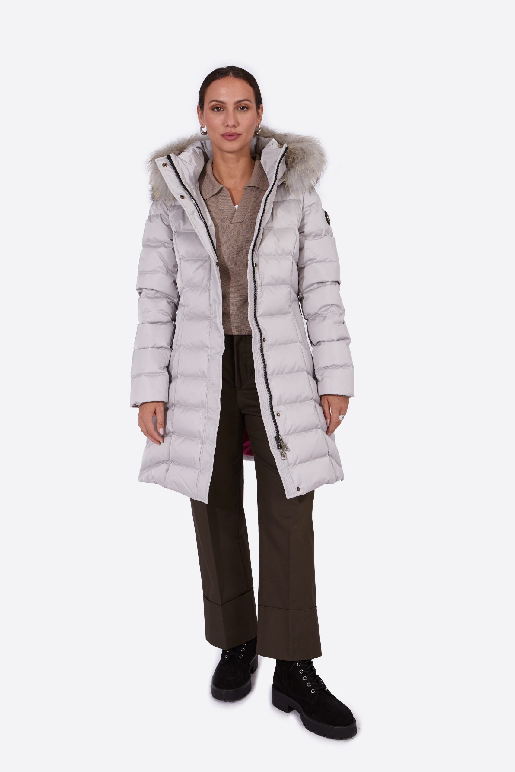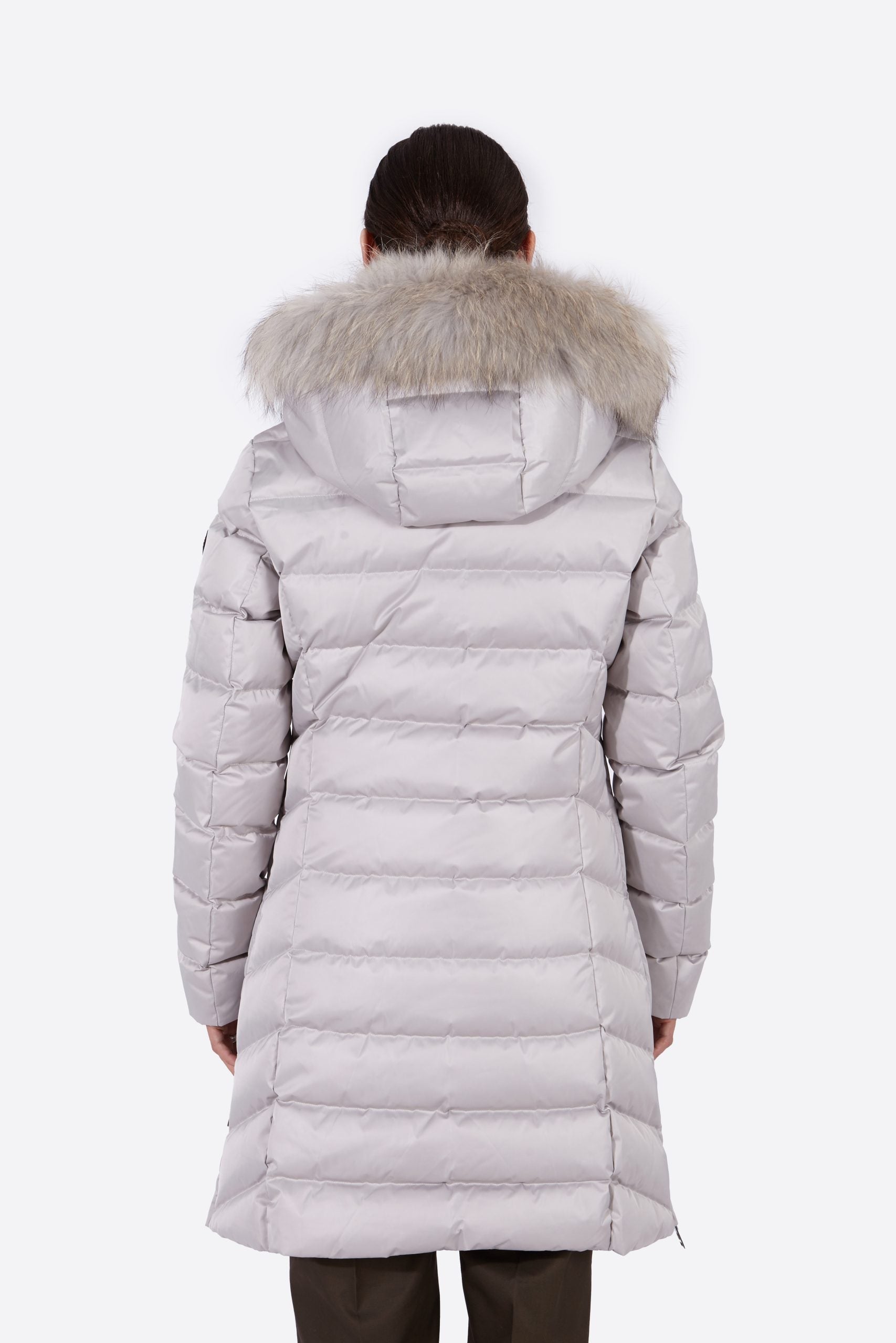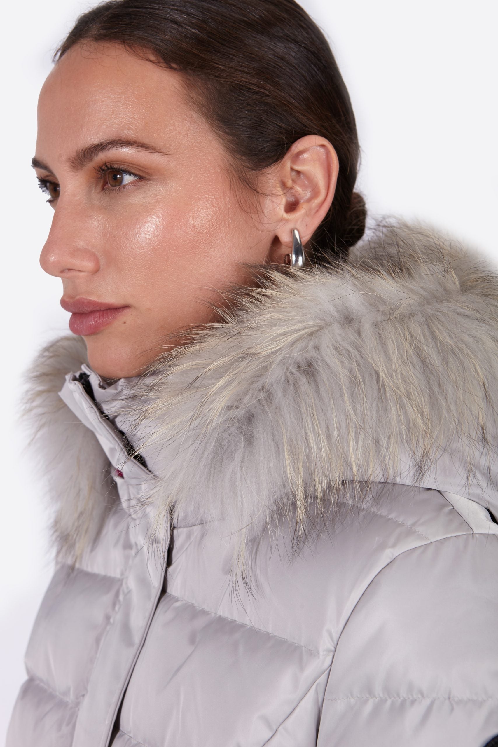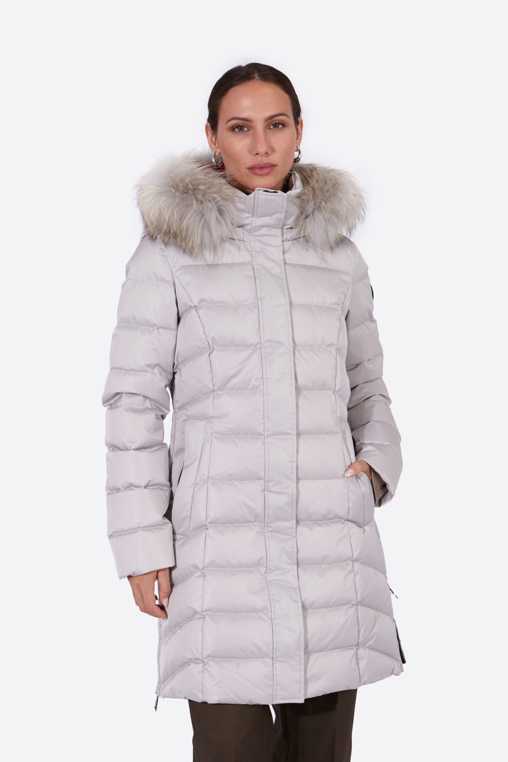 Expertly crafted with a flared cut and striped design, the Women's down jacket MANHATTAN is the perfect blend of style and functionality. Made with a matte finish, water repellent fabric, and windproof design, it will keep you warm and dry in any weather. Features a detachable racoon fur hood, central closure with zipper and inner strap, and a zippered pocket with drawstring piping. Filled with 90% down and 10% feathers, it provides superior warmth and comfort. Length 86 cm.