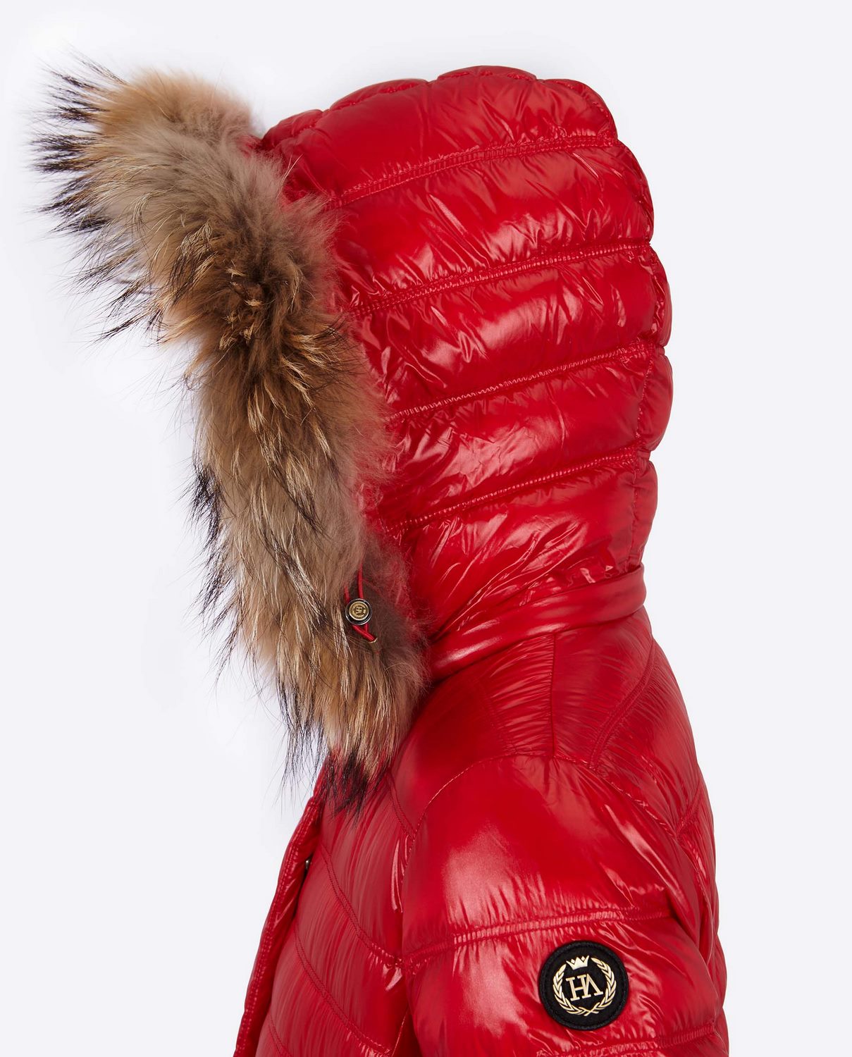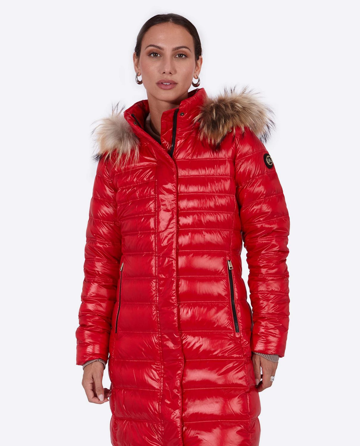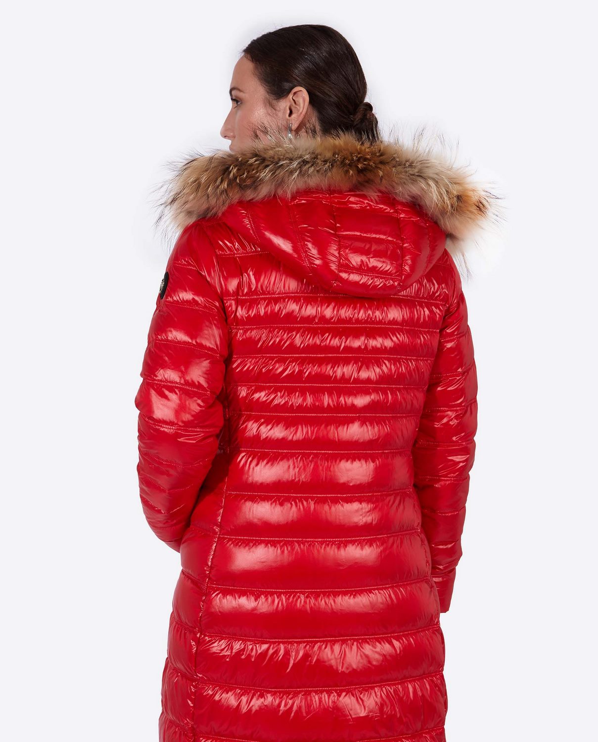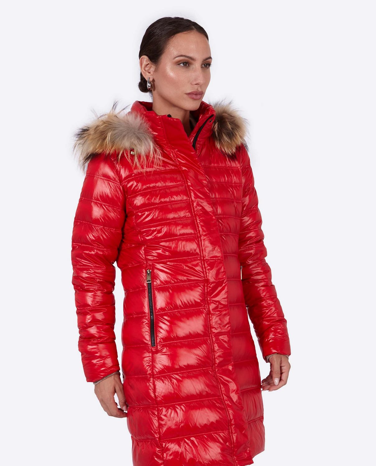Effortlessly stylish and functional, the Women's Down Jacket ZOE is designed with a slim fit and striped pattern. Crafted with water repellent and windproof fabric, it features a double slider zipper, zippered pockets, and a detachable hood with natural raccoon fur. The glossy finish adds a touch of sophistication. Stay warm with 90% down and 10% feather filling. Length 86 cm.