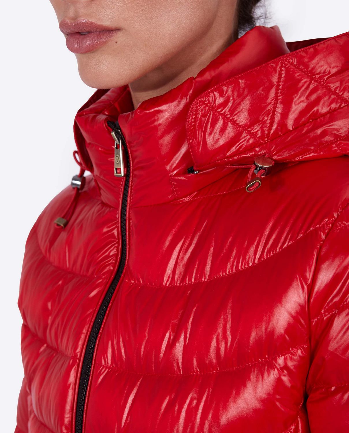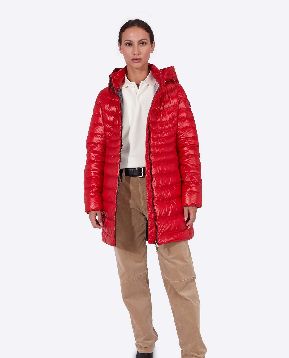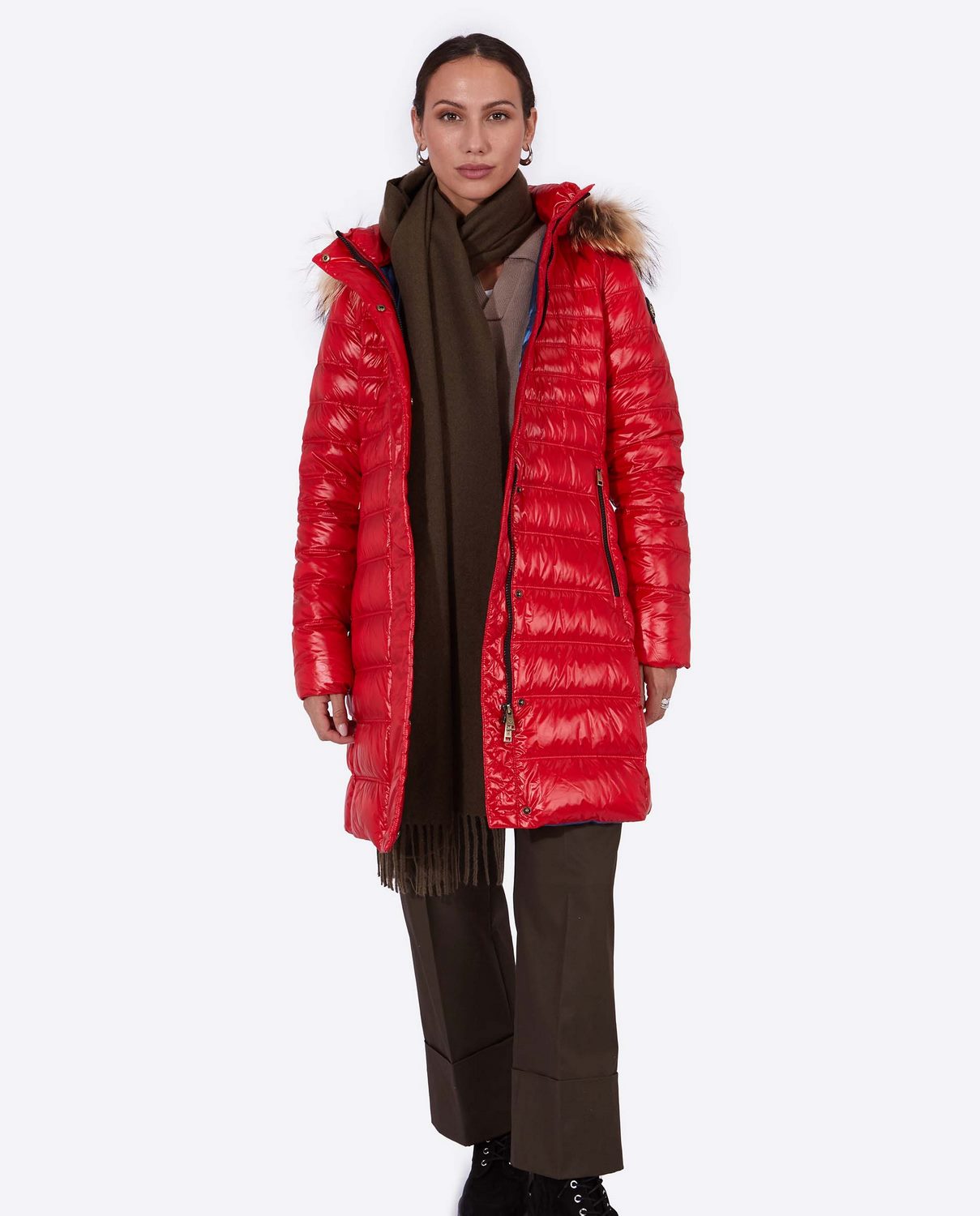 Effortlessly stylish and functional, the Women's Down Jacket ZOE is designed with a slim fit and striped pattern. Crafted with water repellent and windproof fabric, it features a double slider zipper, zippered pockets, and a detachable hood with natural raccoon fur. The glossy finish adds a touch of sophistication. Stay warm with 90% down and 10% feather filling. Length 86 cm.