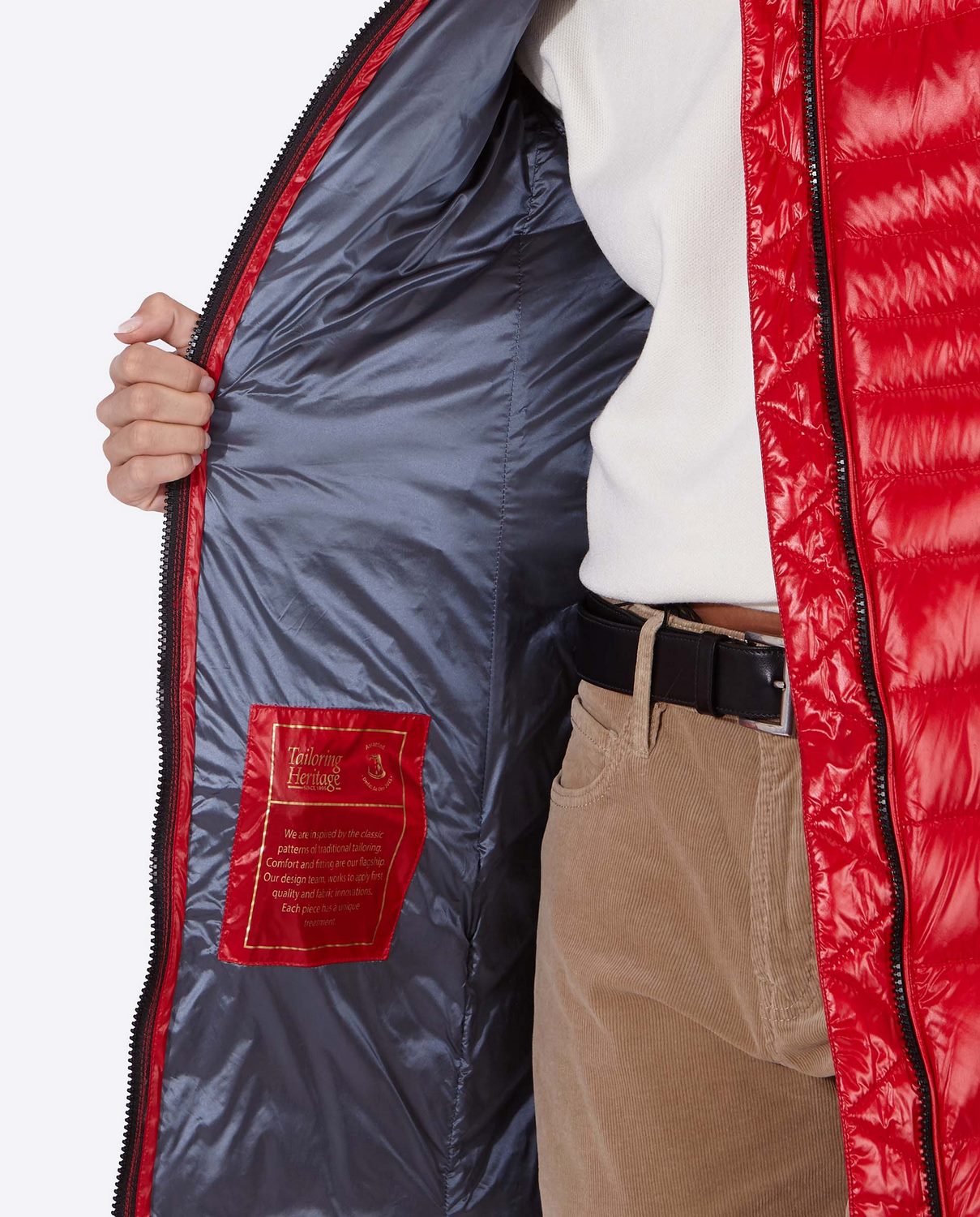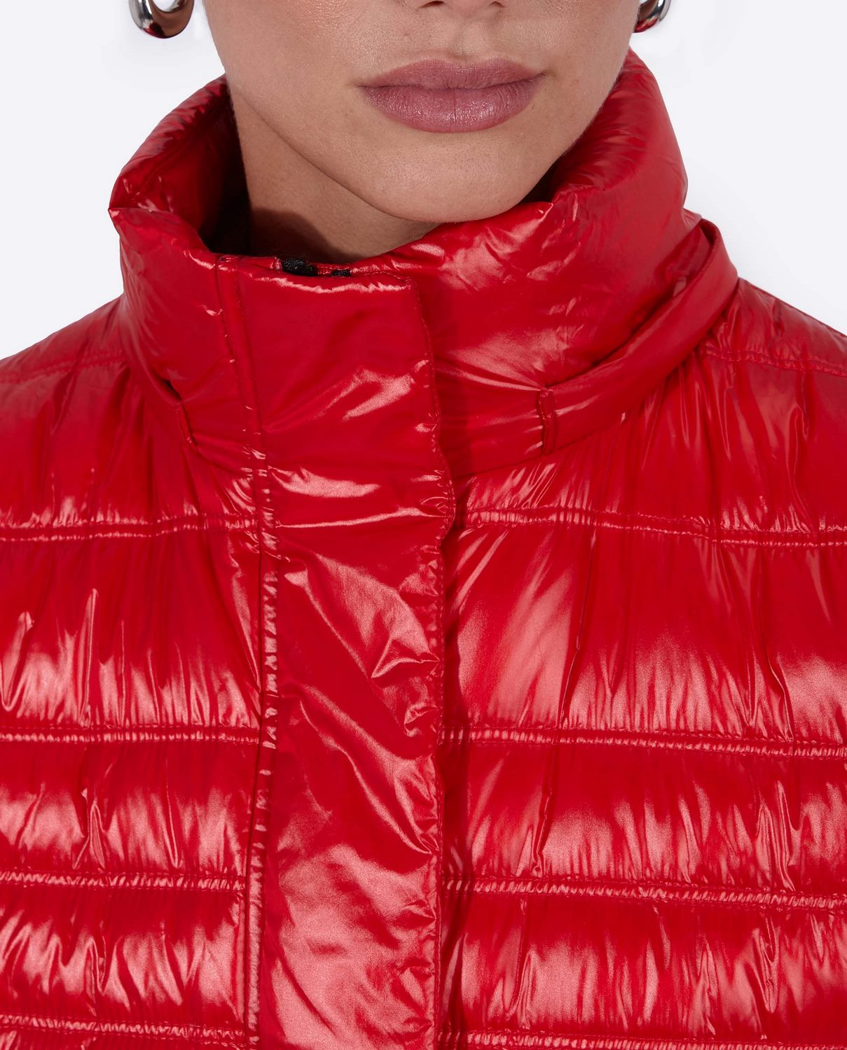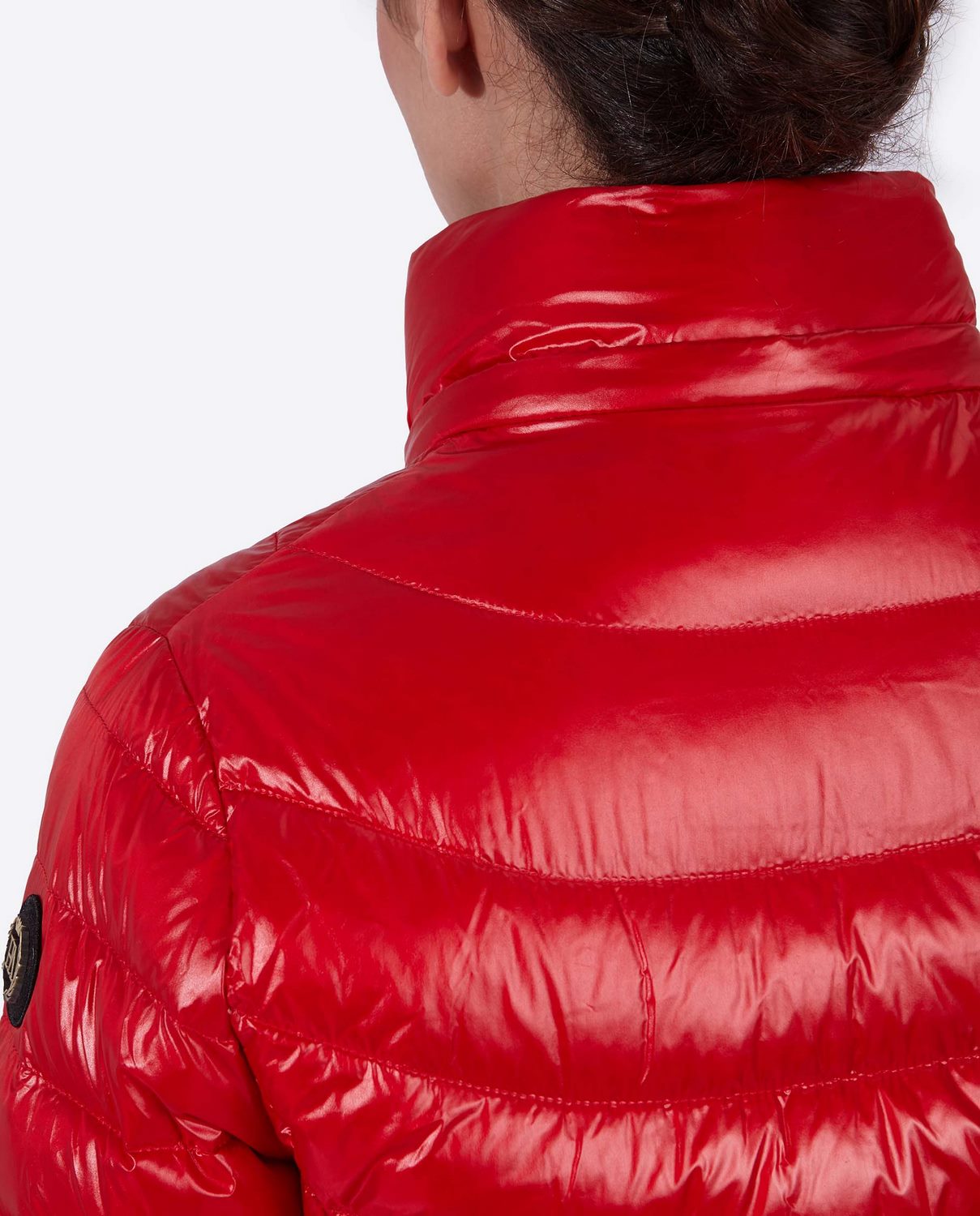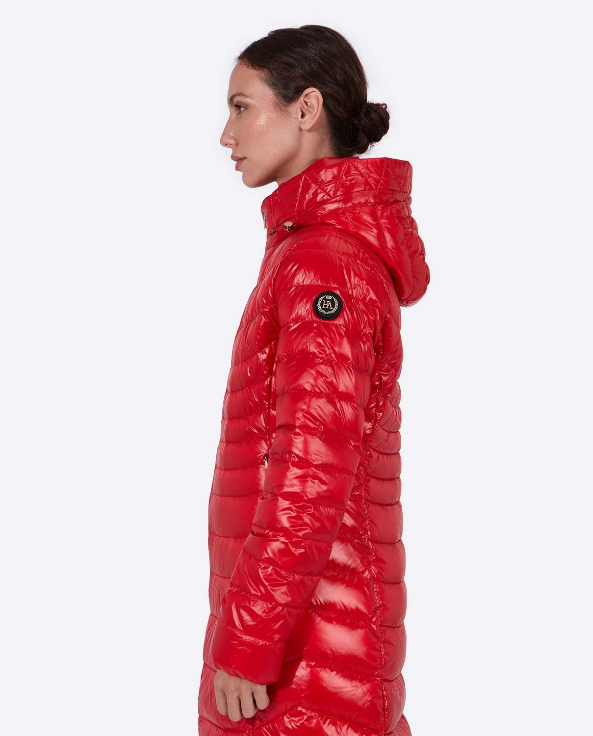Effortlessly stylish and functional, the Women's Down Jacket ZOE is designed with a slim fit and striped pattern. Crafted with water repellent and windproof fabric, it features a double slider zipper, zippered pockets, and a detachable hood with natural raccoon fur. The glossy finish adds a touch of sophistication. Stay warm with 90% down and 10% feather filling. Length 86 cm.