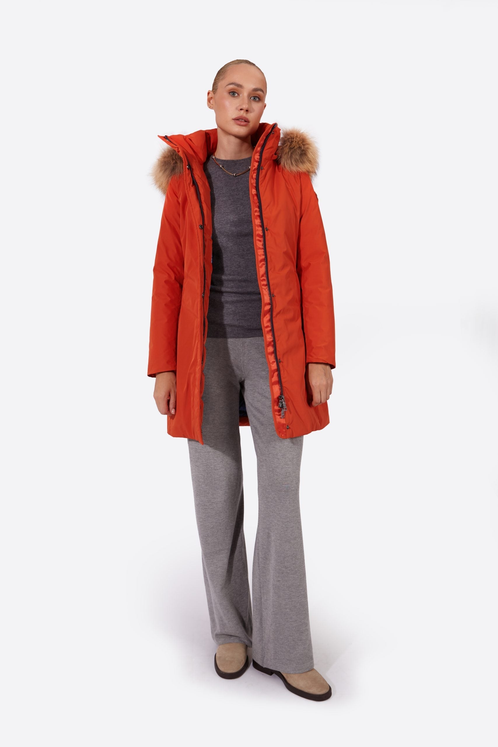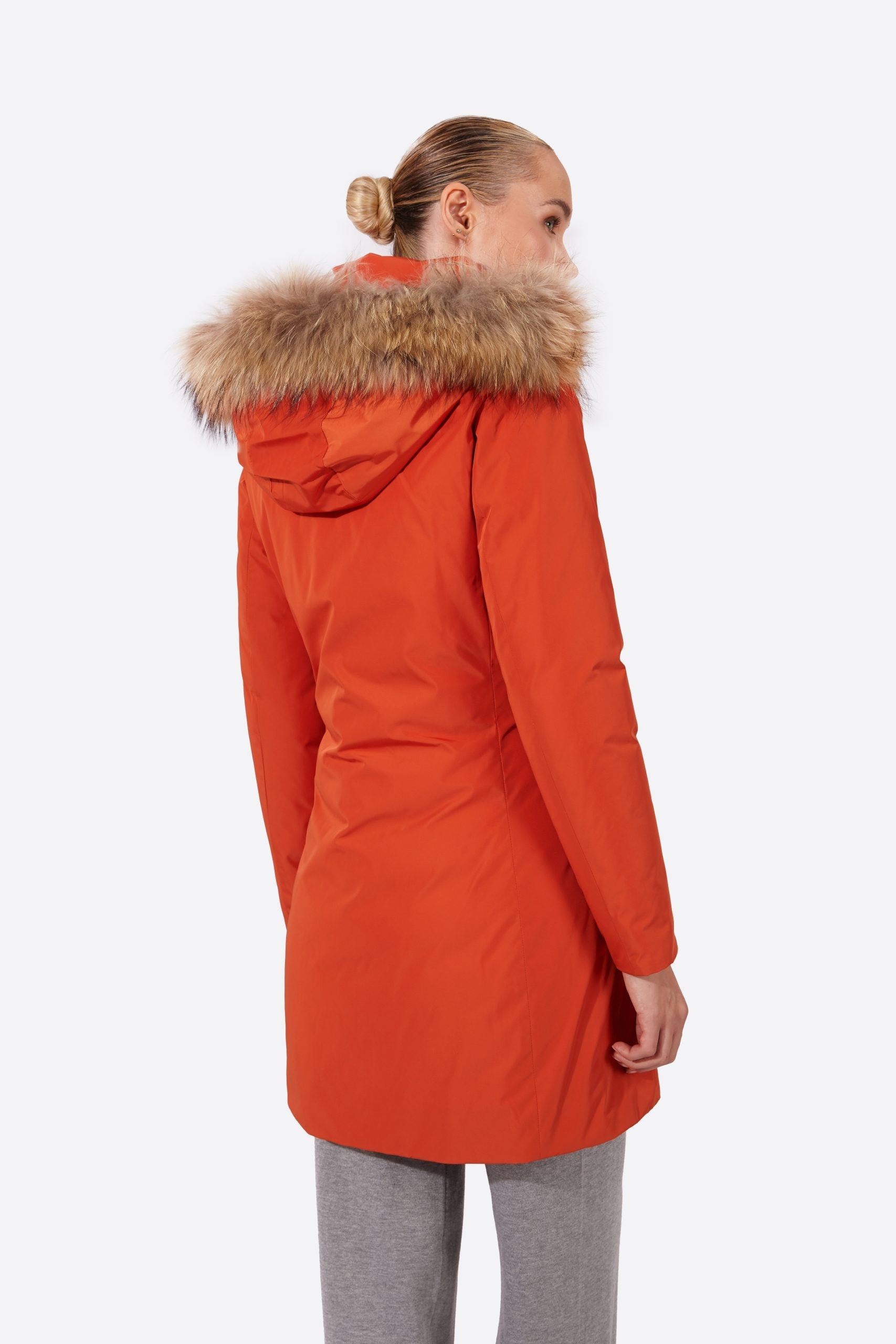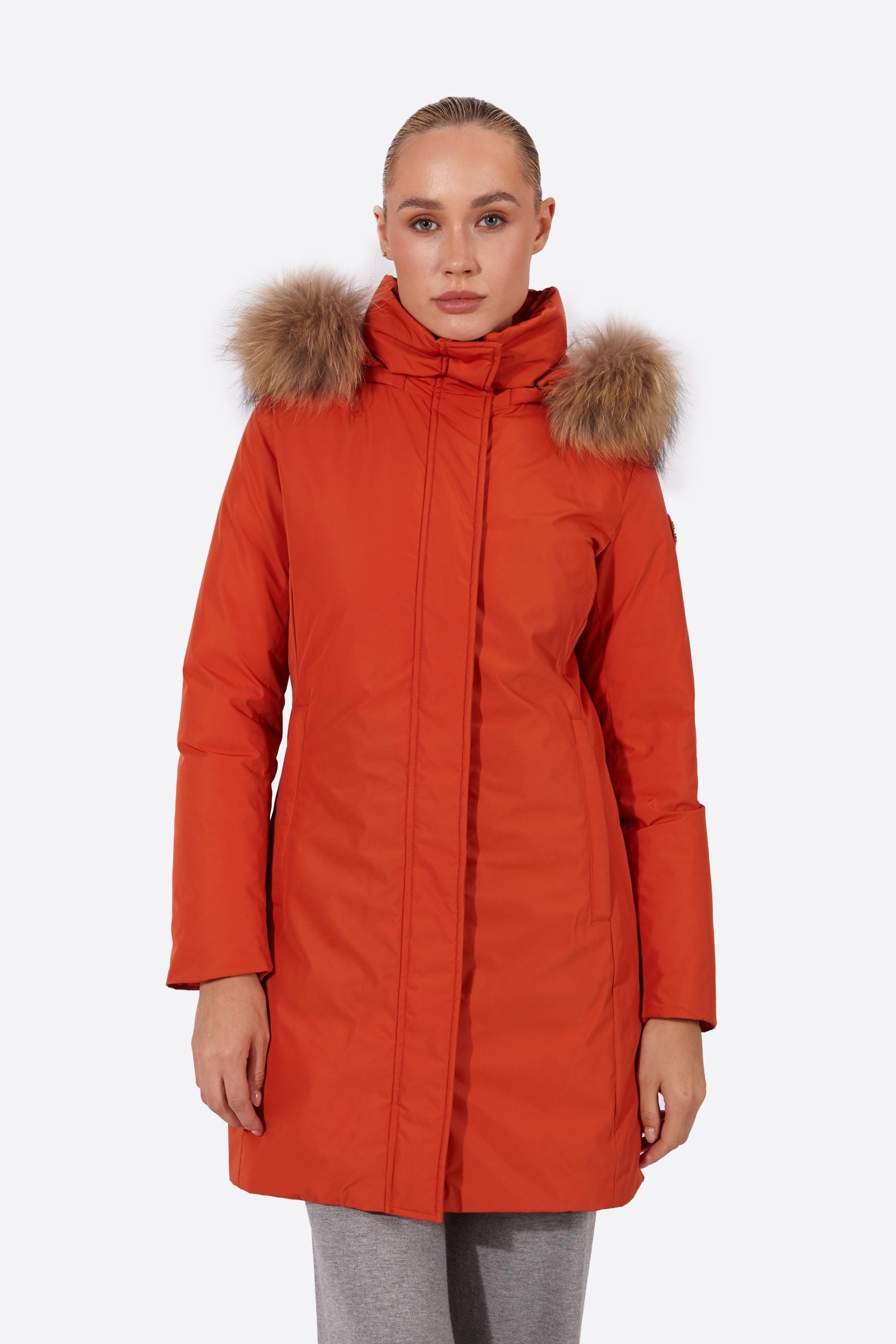 The Women's parka SNOWFALL offers a flattering slim fit and is made with water repellent fabric and an inner windproof membrane for maximum protection. A detachable hood with racoon fur provides added warmth and style. The central closure features a double zipper and inner sock, while zippered pockets and piping add functional details. Filled with 90% down and 10% feather, this parka guarantees warmth and comfort.