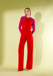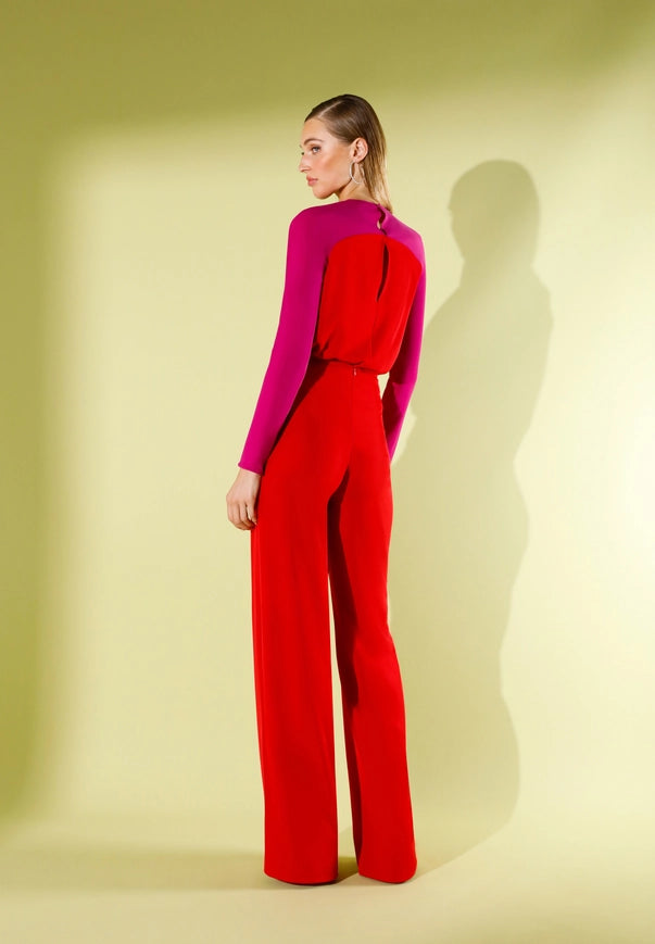 Expertly designed Yanel Red Bougainvillea Pants offer a high-waisted fit and feature a back zipper for easy wear. Made with thin crepe material, these fluid pants provide both style and comfort. Elevate your wardrobe with these versatile and chic pants.