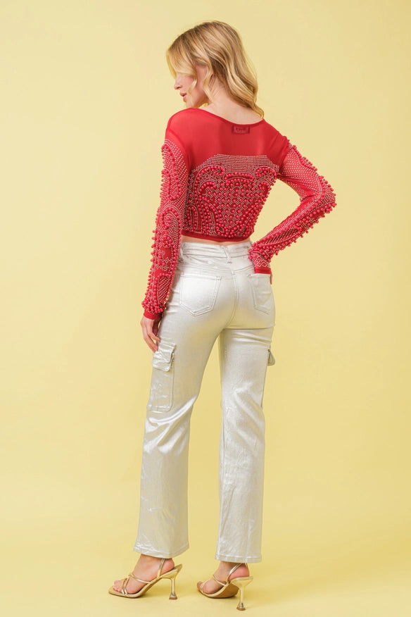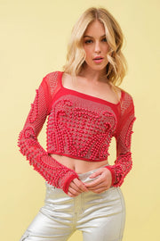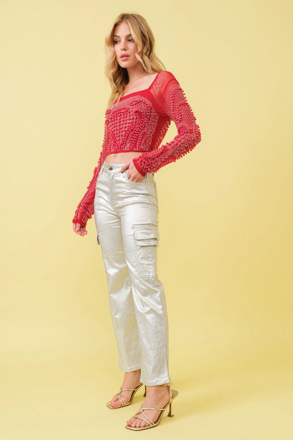 Crop Long Sleeve Fitted Pearl Embellished Top