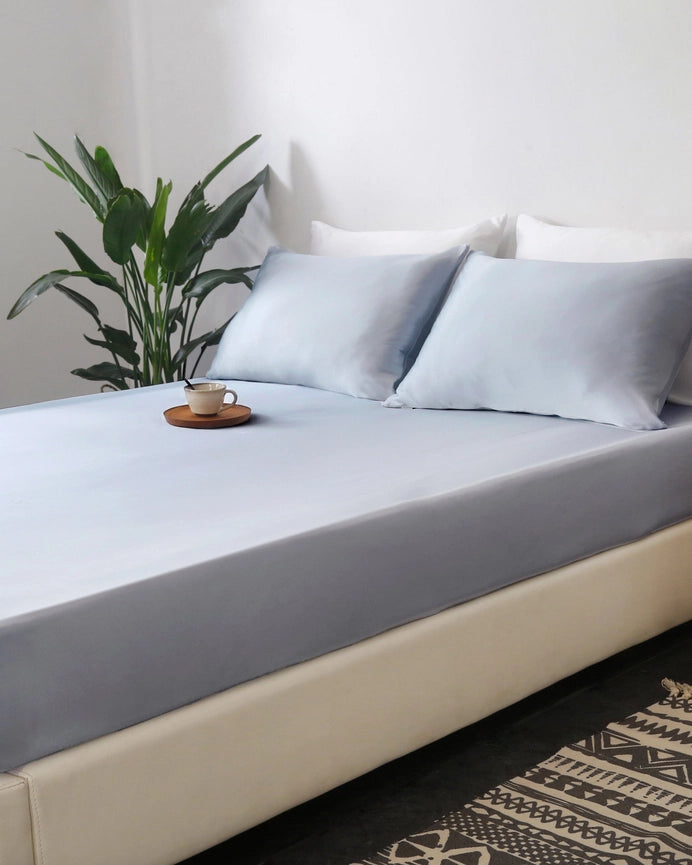 Indulge in ultimate luxury with our 22 mm 3PCS Fitted Sheet Set. Featuring 30% more silk than 19mm sheets, our hypoallergenic and breathable bedding will give you the perfect night's sleep. The fitted sheet accommodates mattresses up to 16" deep, and the set includes two silk pillowcases with a concealed zipper closing. All packaged consciously for re-use.