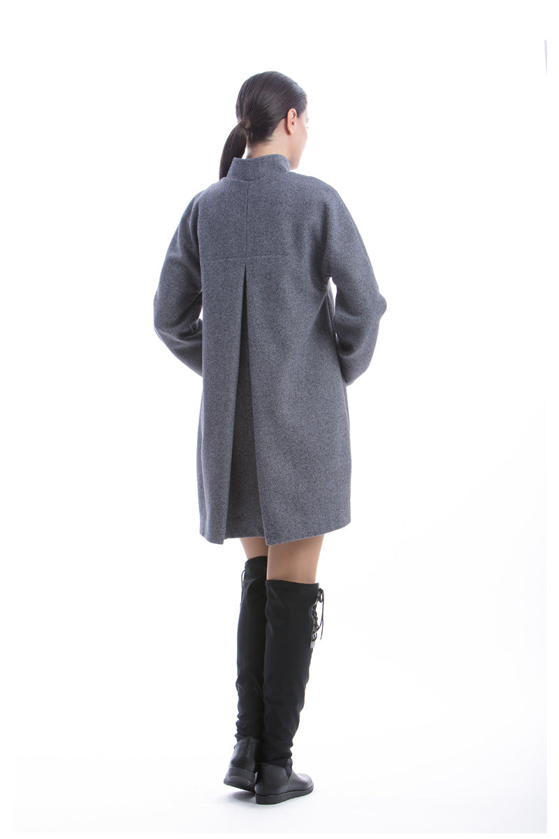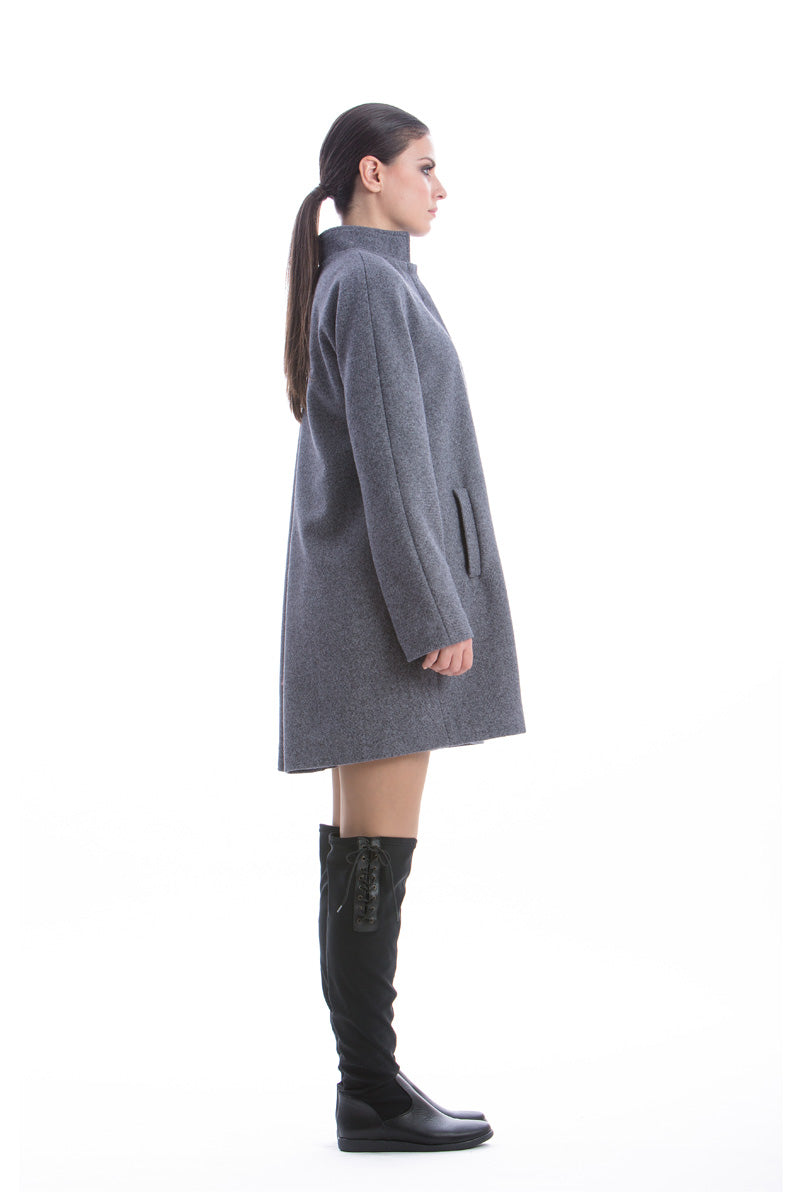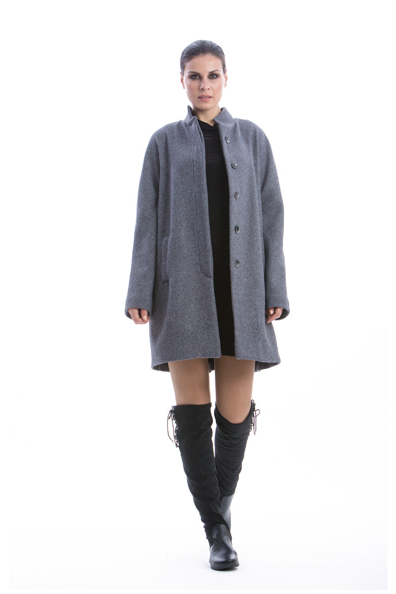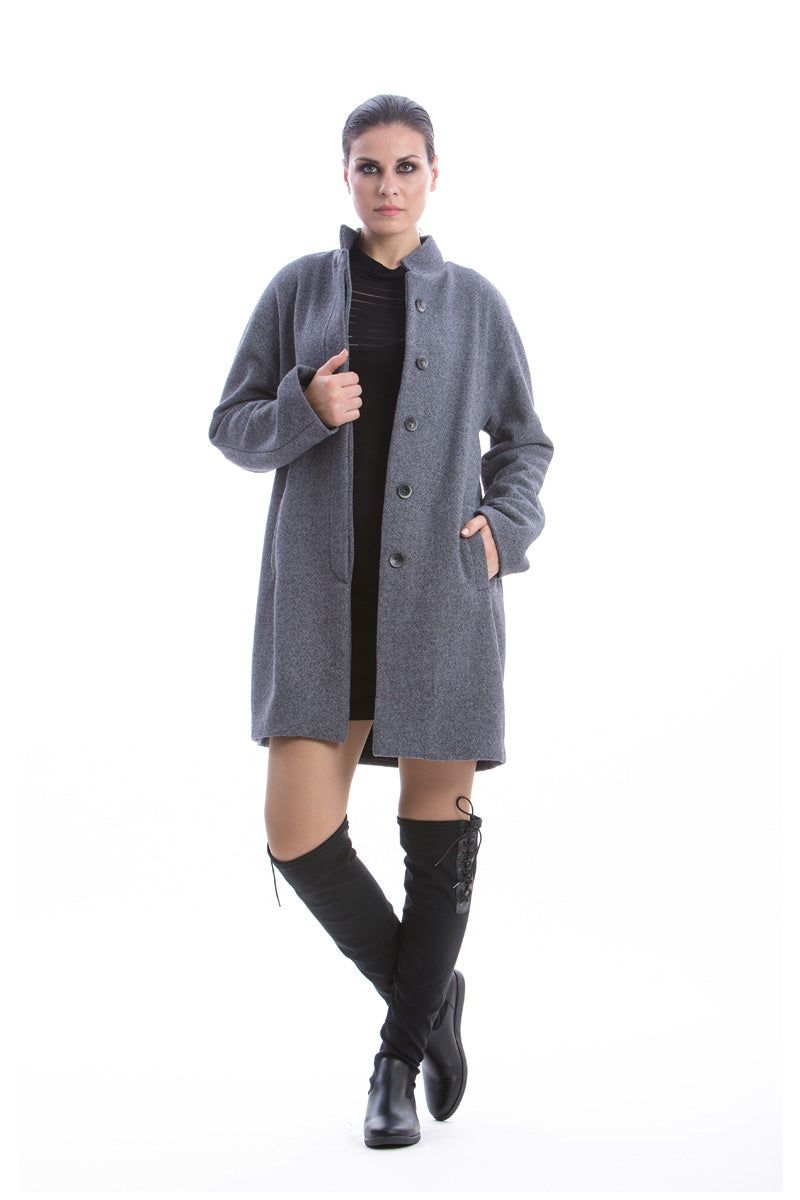 Coat CONQUISTA in black color. A line silhouette. Stand-up collar and concealed buttons on the front placket. Two side pockets. A pleat in the back. Black stretch polyester lining. Length above the knee. The model is 1.77m and is wearing size 36/S. 40%wool-60%viscose+100%polyester.
