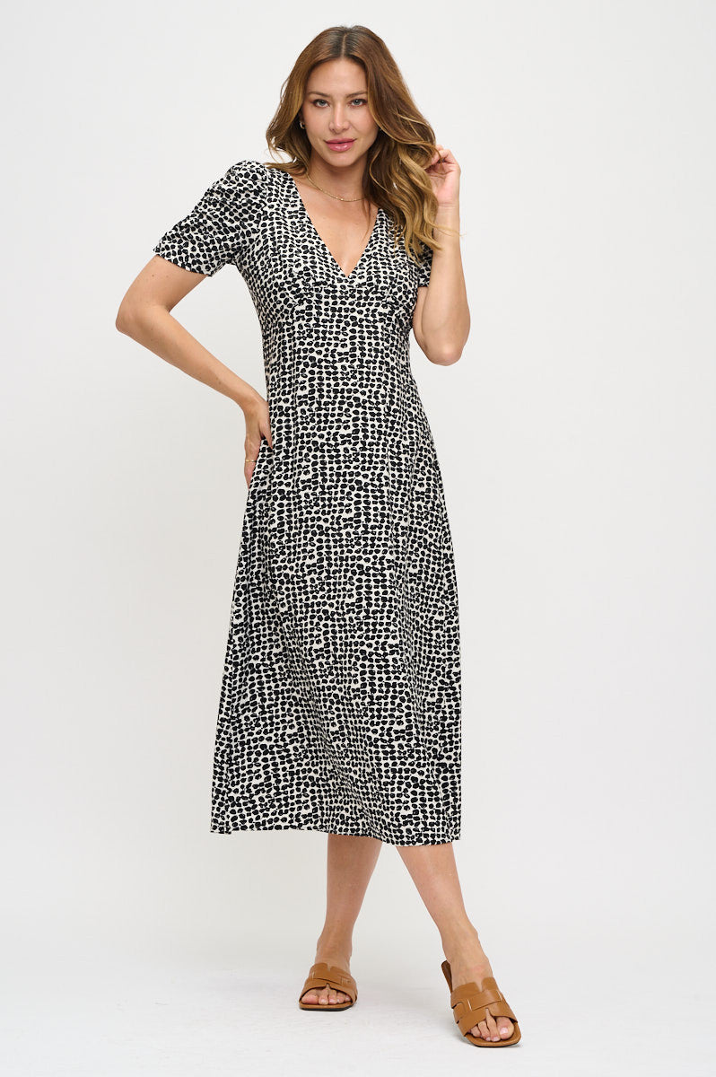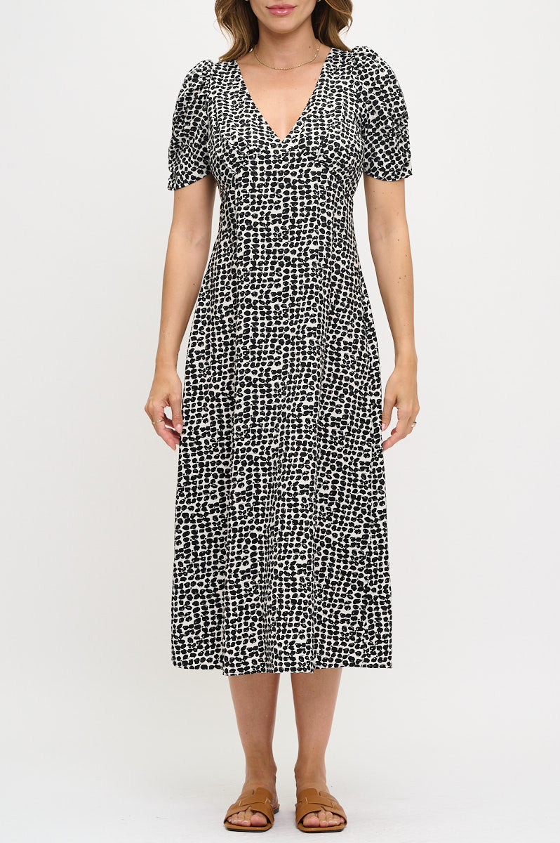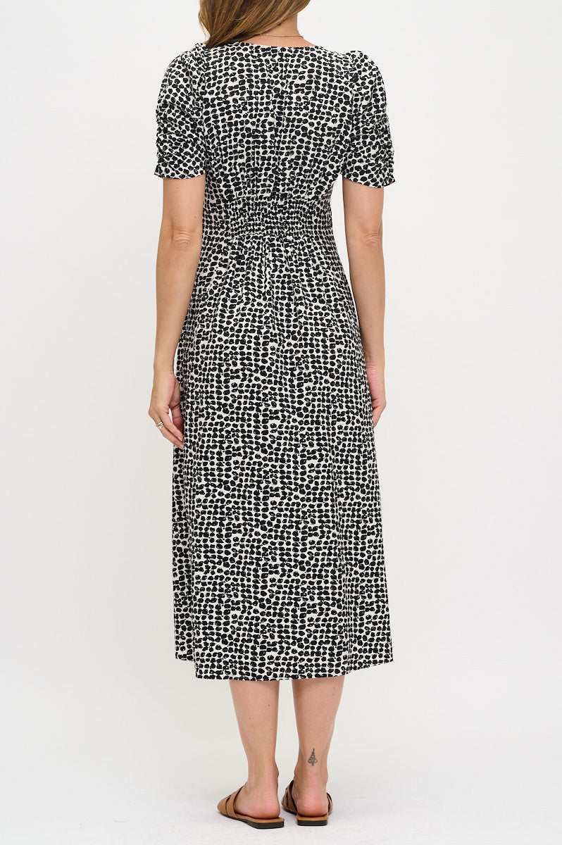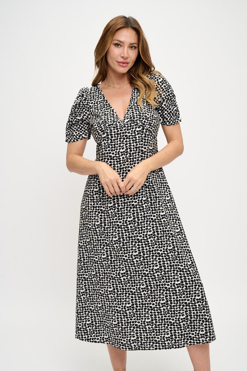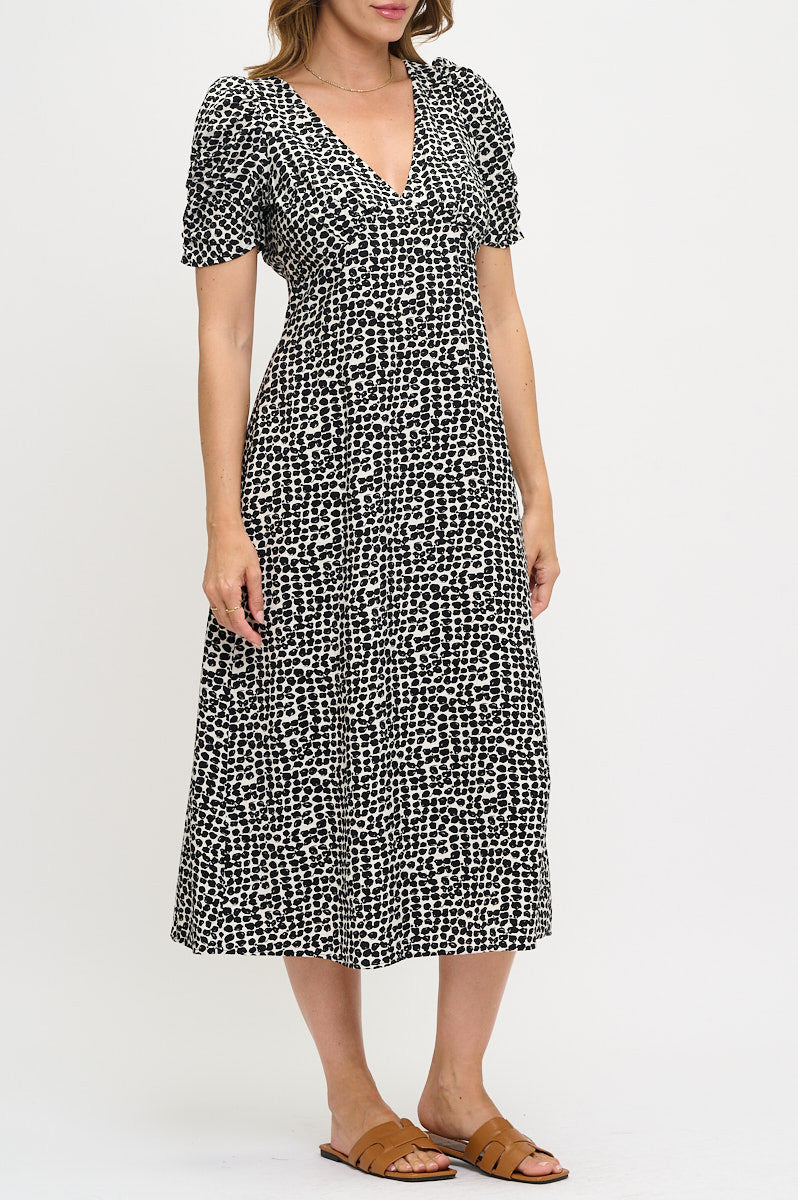 Made in USA Abstract Print V neck Midi Dress with Scrunch Sleeve.