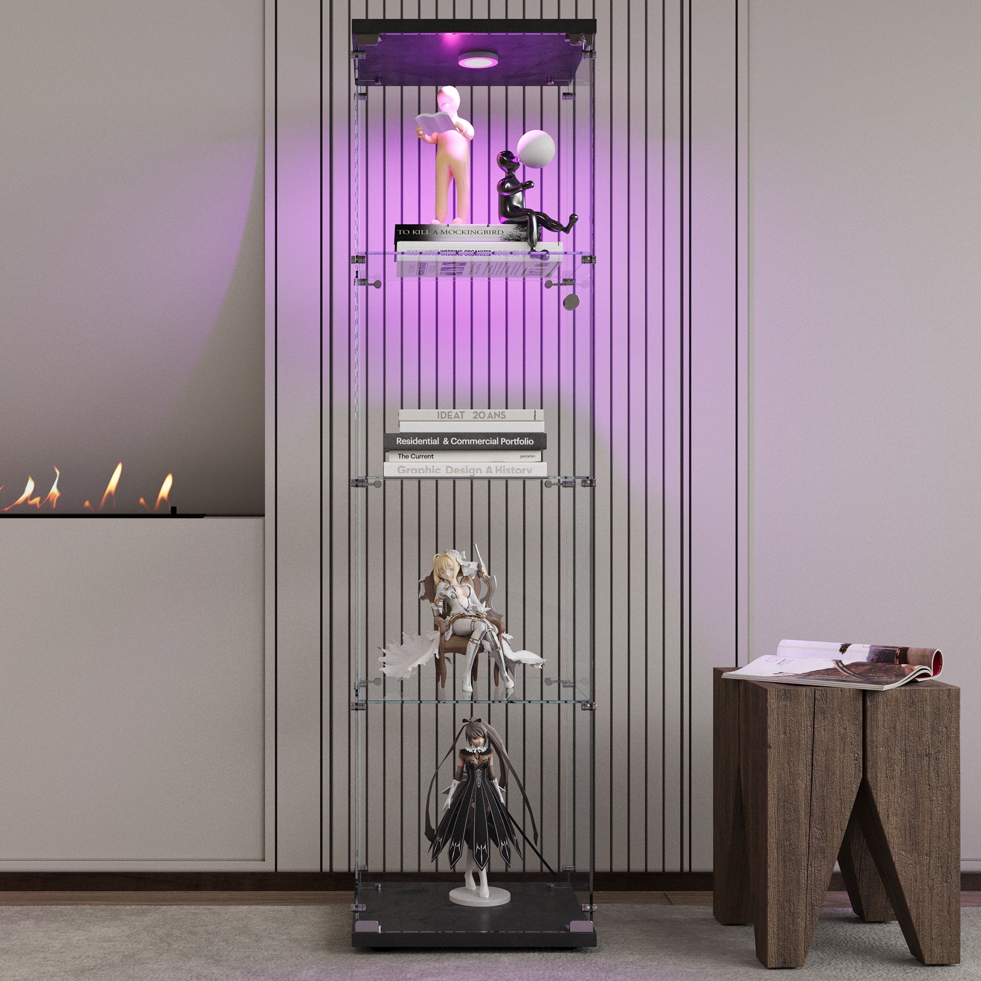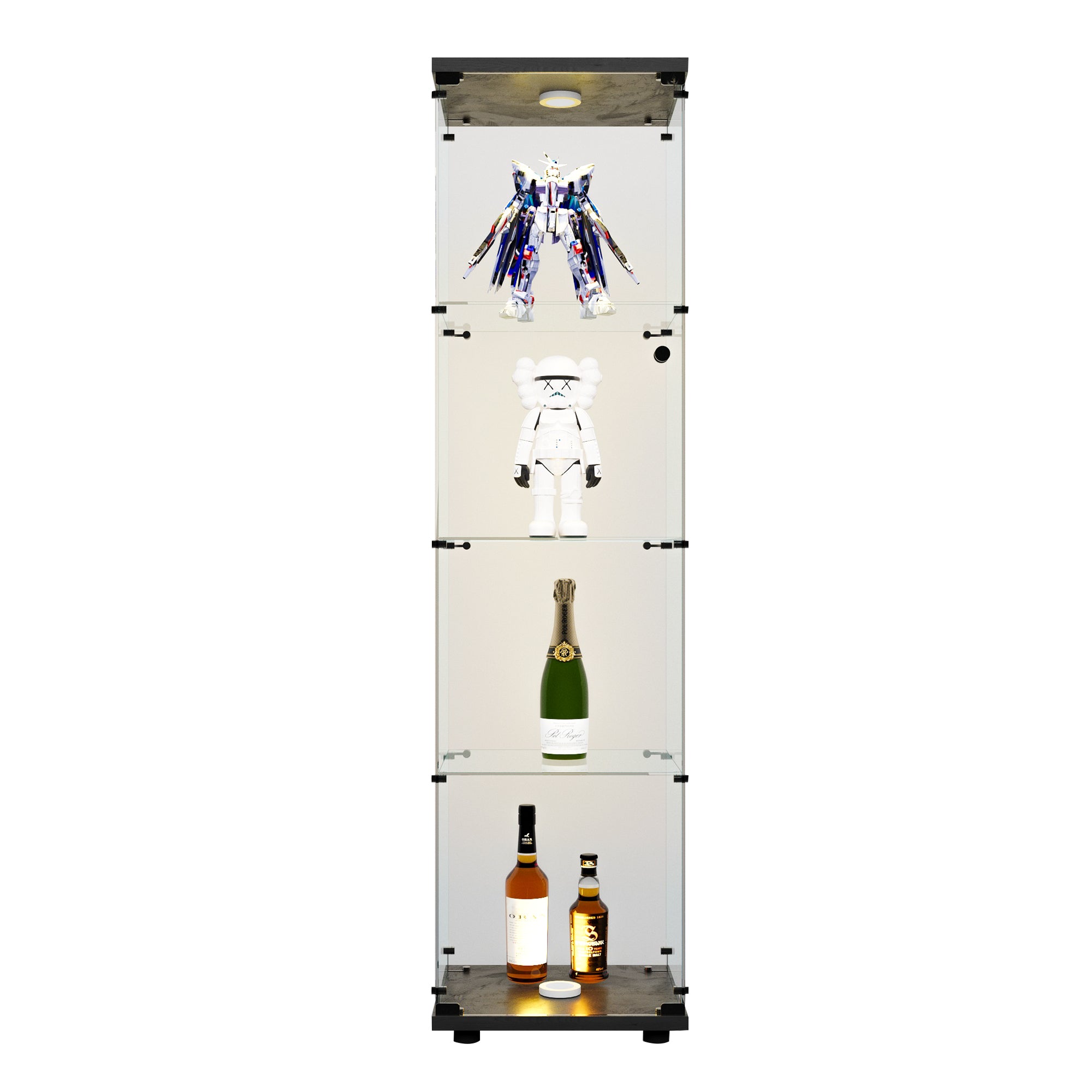 - Glass Display Cabinet: Size 64.7'(H) x 16.7'(L) x 14.3'(W) inches, each tempered glass is 4mm thick. 4-shelf design is sturdy and stylish to display photos, books, action figures, wine and whisky; glass door is easy to open and close. Three colors available: White, Black and Natural Wood
