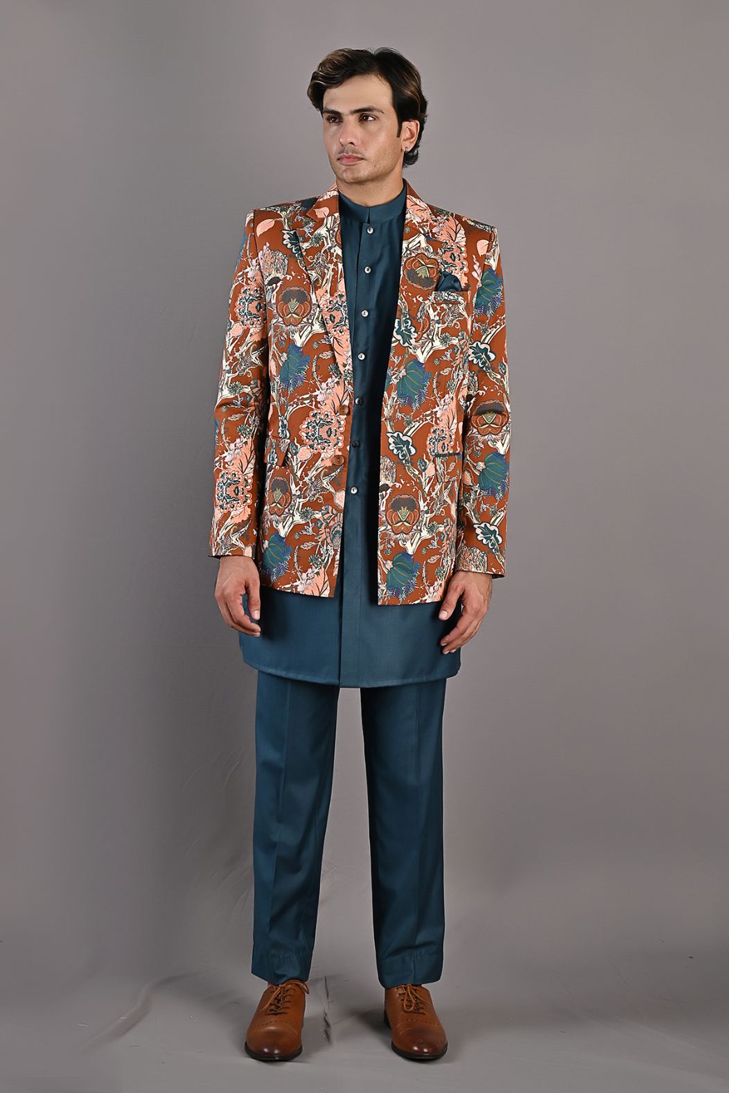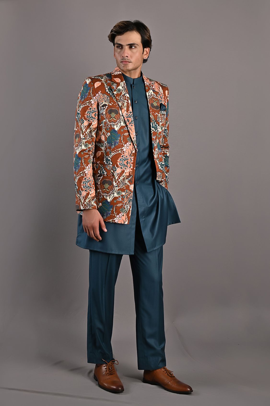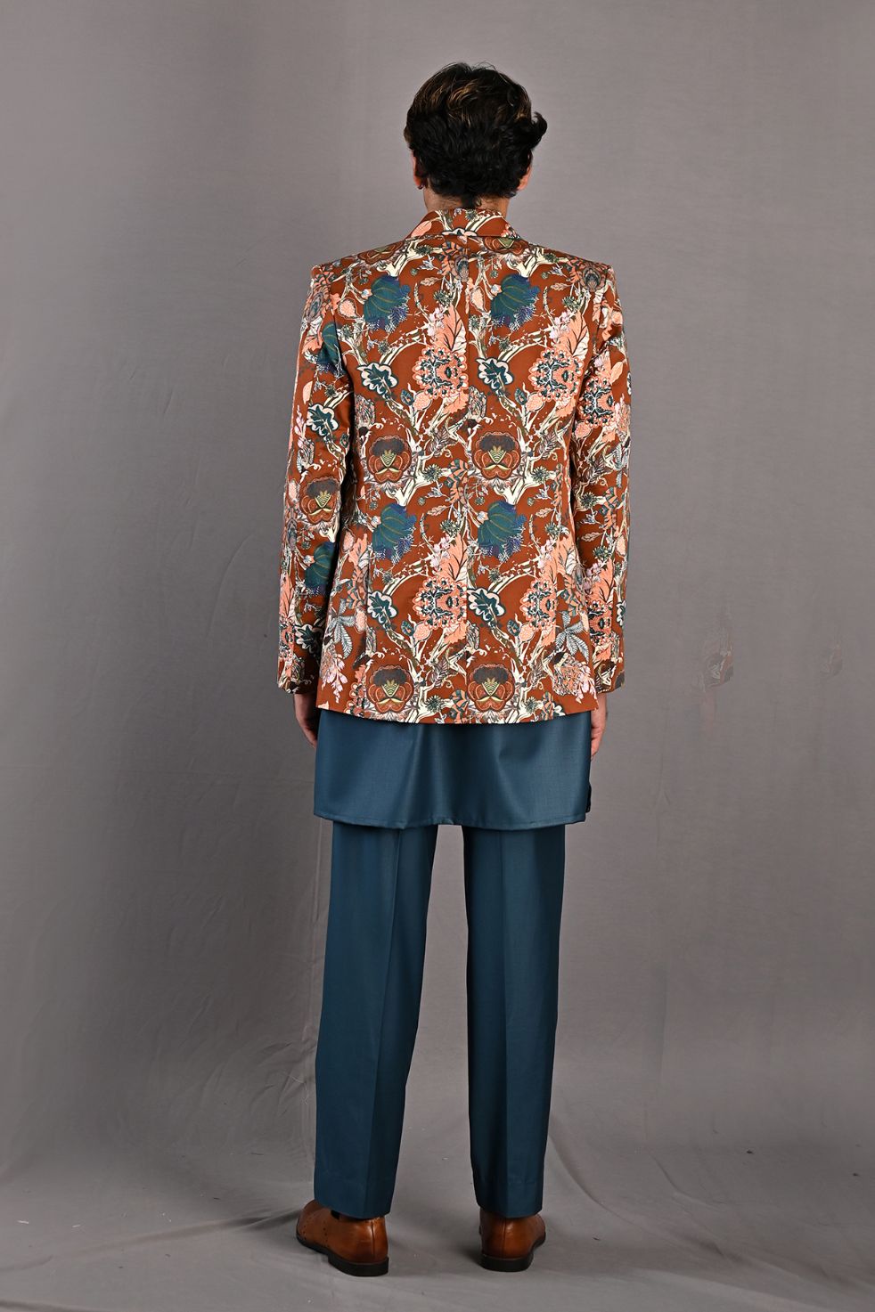 Admon - Maroon & Multi Printed Jacket With Teal Green Kurta & Pant Set