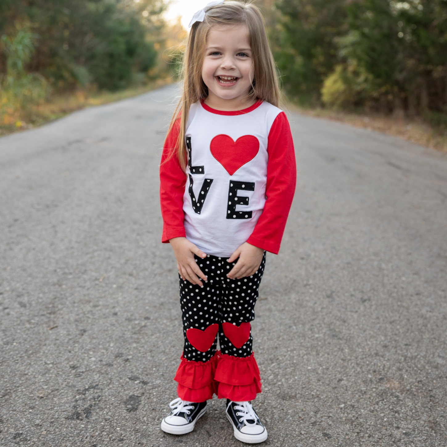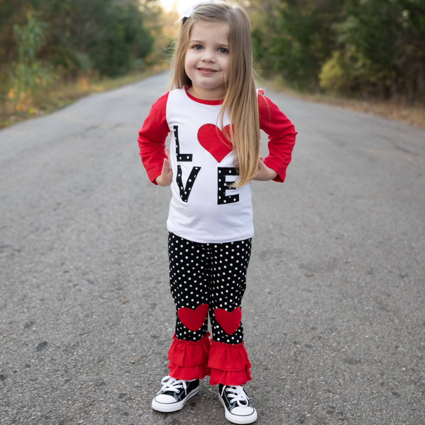 AL Limited 2 piece Girls Valentine's Day Outfit. Red & White Long T Shirt with LOVE patch applique. Black Polka Dot Knit Ruffle Pants with Red Hearts on the knees and Red Ruffle finish. Made with 97% Cotton/3% Spandex stretch. and Machine Washable.