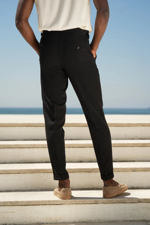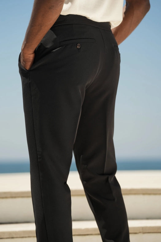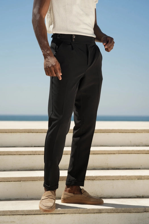 Expertly tailored and stylish, the Alpha Pants with Black Studs offer a functional and sophisticated design. With a high-waisted design and adjustable buckle straps for a personalized fit, these trousers also feature a sturdy zipper and three buttons for added practicality. Elevate your wardrobe with these elegant and versatile pants.