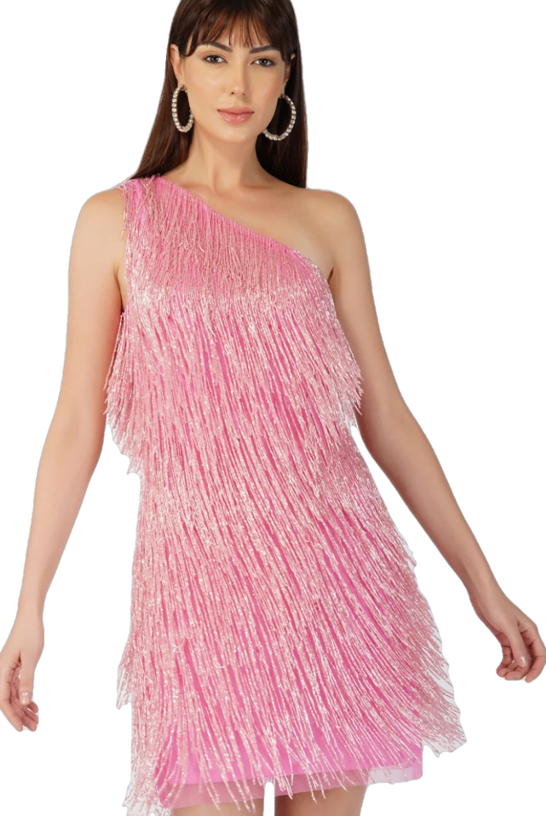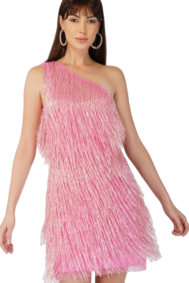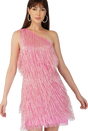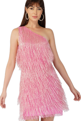 Lace & Beads Amarato one-shoulder pink embellished mini dress. This pink tassel dress features hand-embellished crystal waterfall beading throughout and a statement one-shoulder neckline with a zip-back closure. Adorned in pink beaded fringing and finished with a tassel hem creating a beautiful illusion as you walk, making it an unbeatable party look.