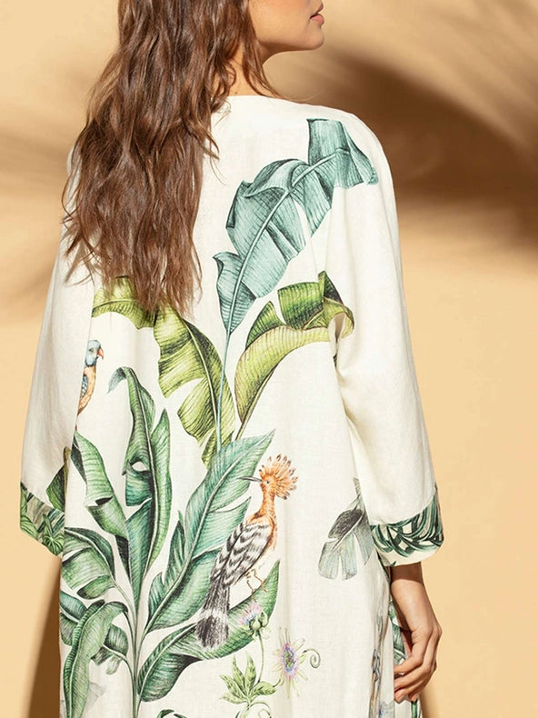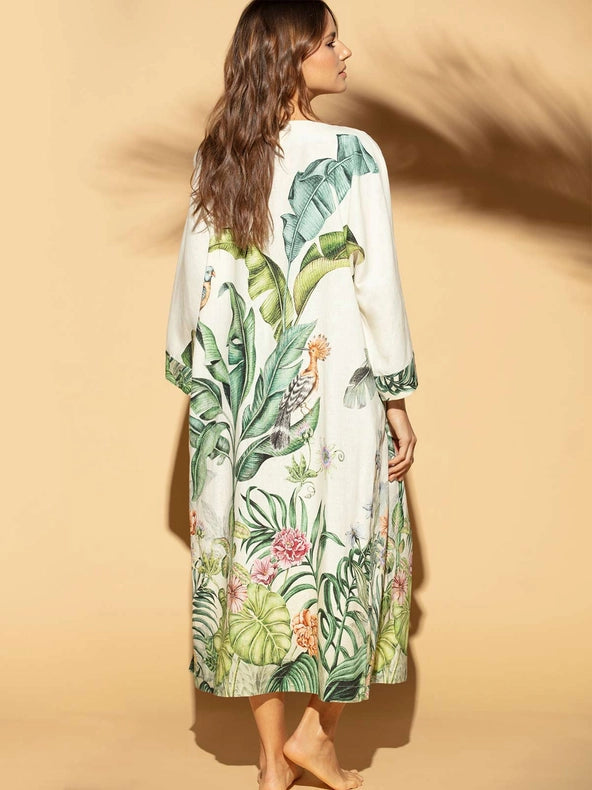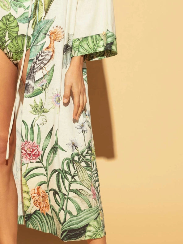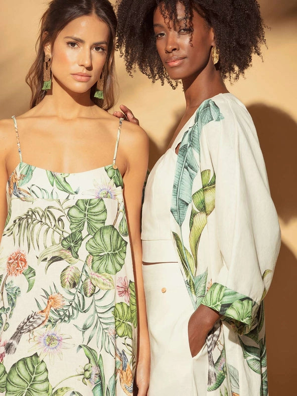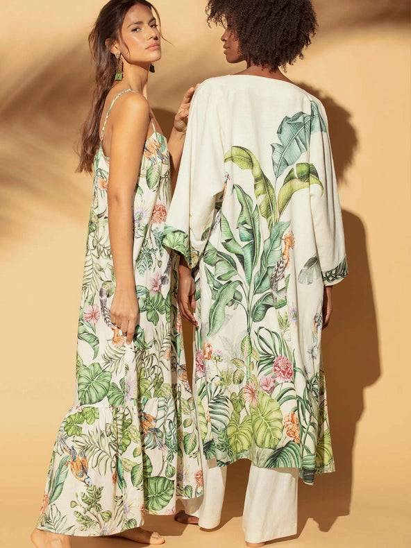 Elevate your wardrobe with the Amazonia Linen Long Kimono. This one-size-fits-all kimono features a deep V-neckline, wide sleeves, and two side pockets for convenience. The localized Amazonia print, crafted by Portuguese artists, adds a unique touch to this versatile piece. Made in Portugal with a blend of linen and viscose for a comfortable and stylish look. Perfect for everyday wear or as a cover-up after a day at the beach.